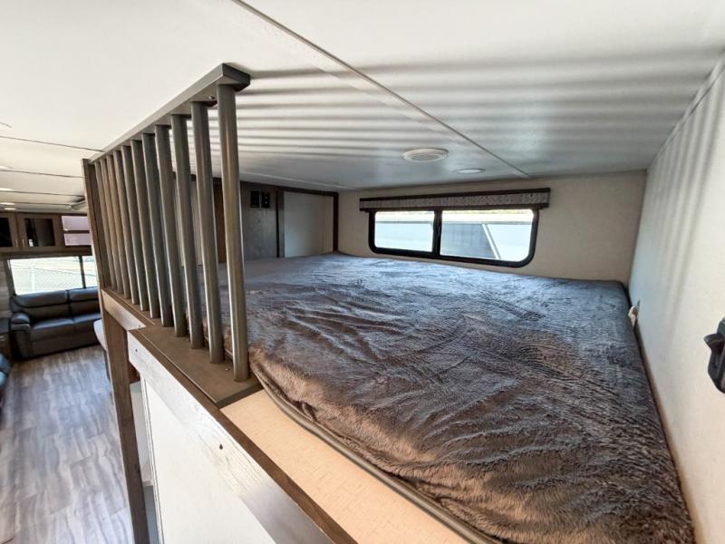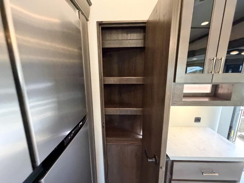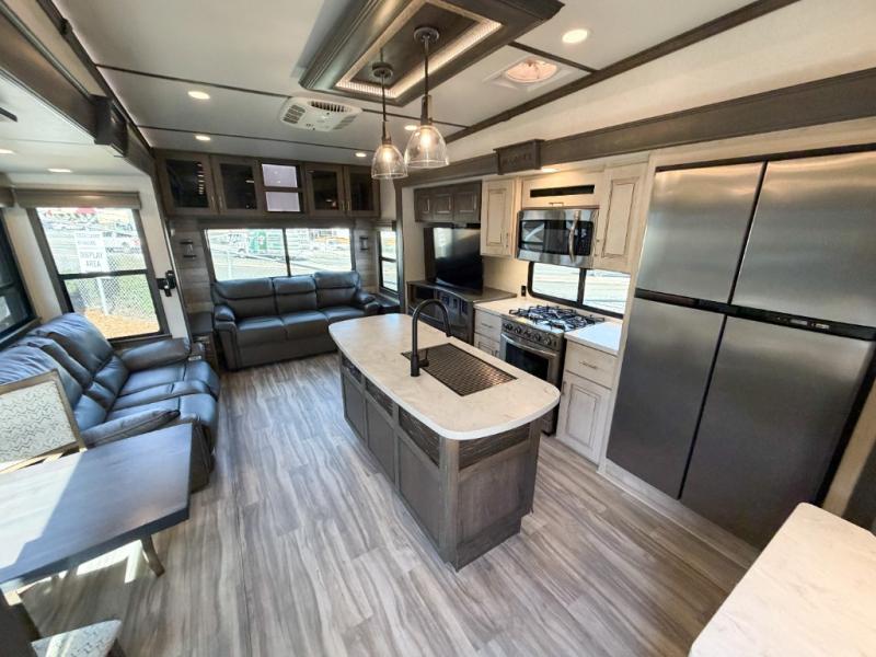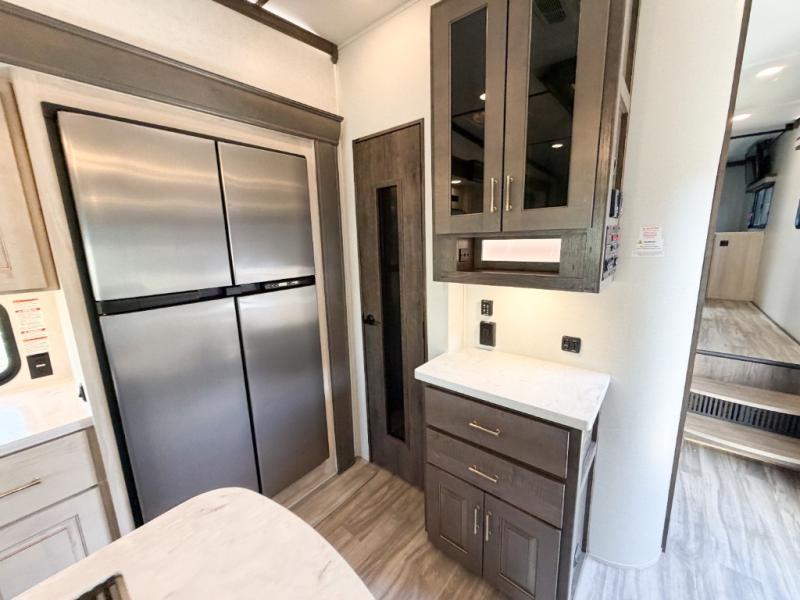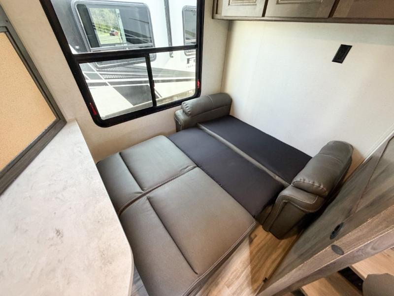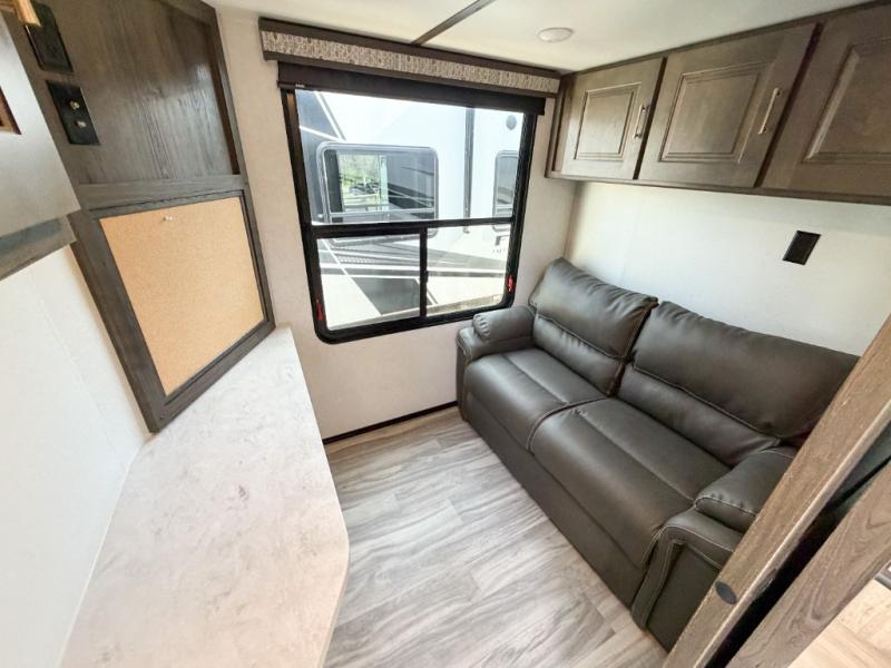 Looking to work while traveling or prefer to have a guest room when friends and family stay overnight? This fifth wheel might just be the answer thanks to the versatile room with a sleeper sofa, overhead storage and a countertop to work from if you wish. You will find a loft above with a ladder for more sleeping or storage space. The full bathroom is between this room and the front master bedroom which offers a king bed slide or choose a queen, a large front wardrobe with a space for a washer/dryer option, a flip-top dresser and a seat to utilize when getting ready. Everyone can gather in the main living and kitchen area that offers residential appliances with the option to add a residential refrigerator, a kitchen island with a space to add the dishwasher option, two pantries, a hutch, and plenty of seating. You can choose from the sleeper sofa, the dual recliner love seat and/or the floating dinette table with four chairs. There is more, step inside!