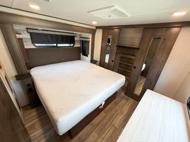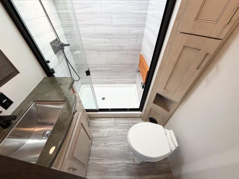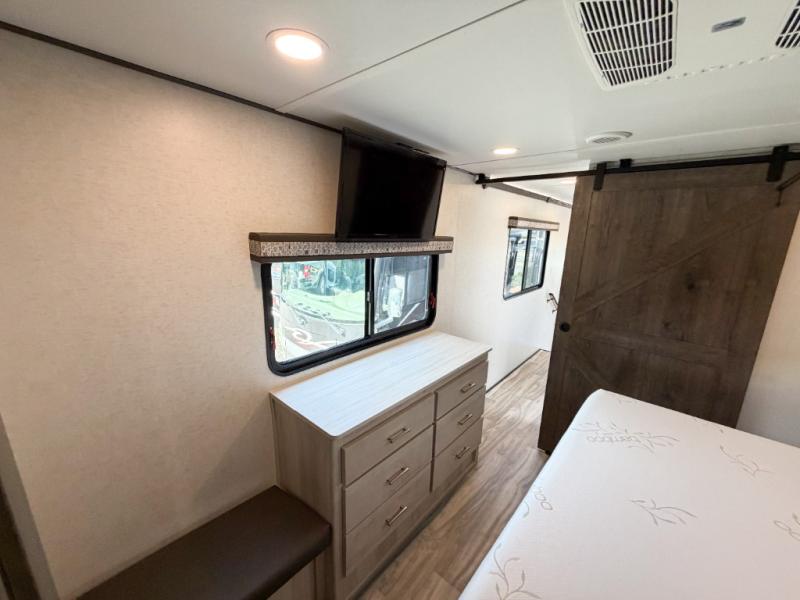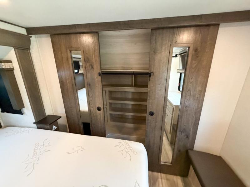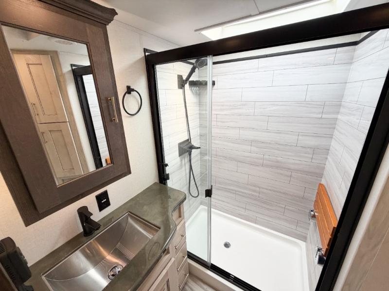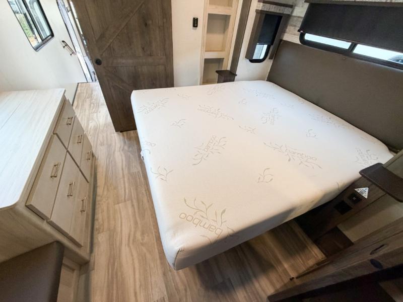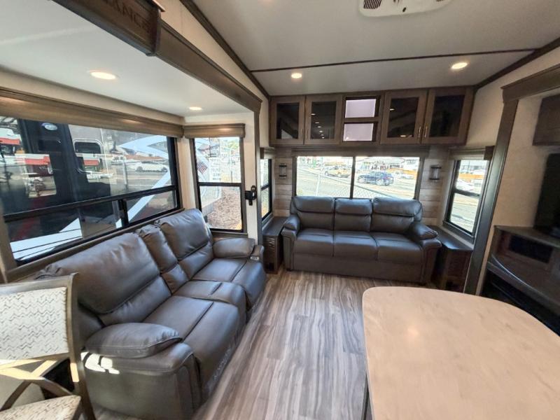 Looking to work while traveling or prefer to have a guest room when friends and family stay overnight? This fifth wheel might just be the answer thanks to the versatile room with a sleeper sofa, overhead storage and a countertop to work from if you wish. You will find a loft above with a ladder for more sleeping or storage space. The full bathroom is between this room and the front master bedroom which offers a king bed slide or choose a queen, a large front wardrobe with a space for a washer/dryer option, a flip-top dresser and a seat to utilize when getting ready. Everyone can gather in the main living and kitchen area that offers residential appliances with the option to add a residential refrigerator, a kitchen island with a space to add the dishwasher option, two pantries, a hutch, and plenty of seating. You can choose from the sleeper sofa, the dual recliner love seat and/or the floating dinette table with four chairs. There is more, step inside!