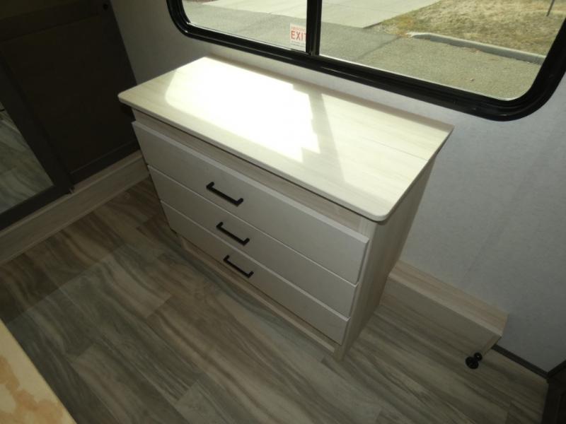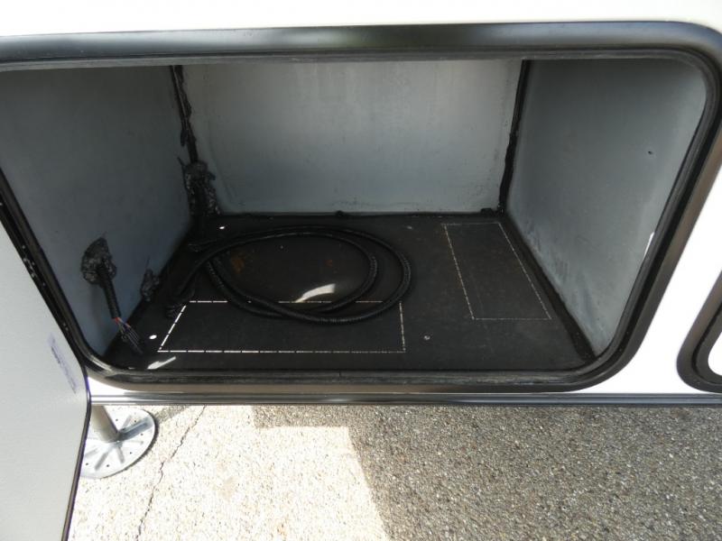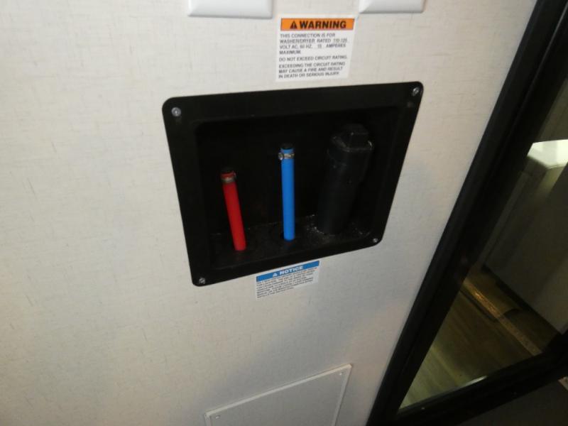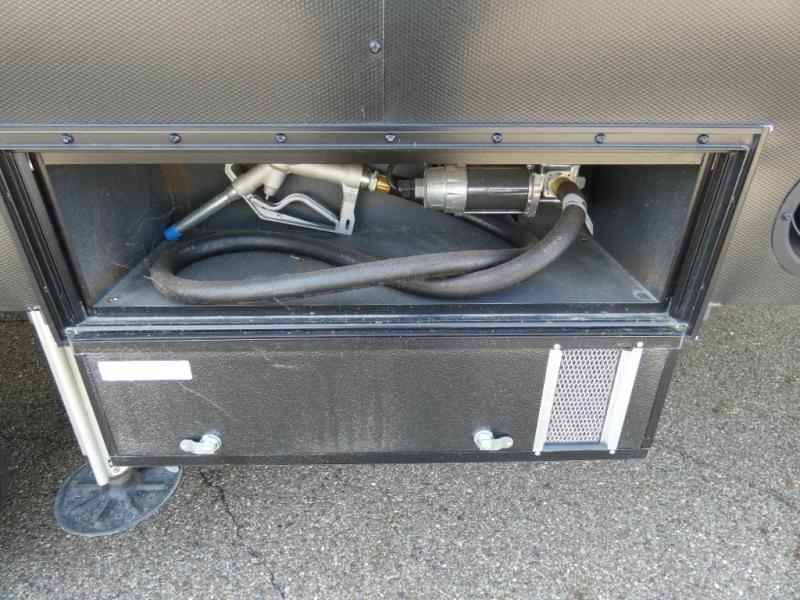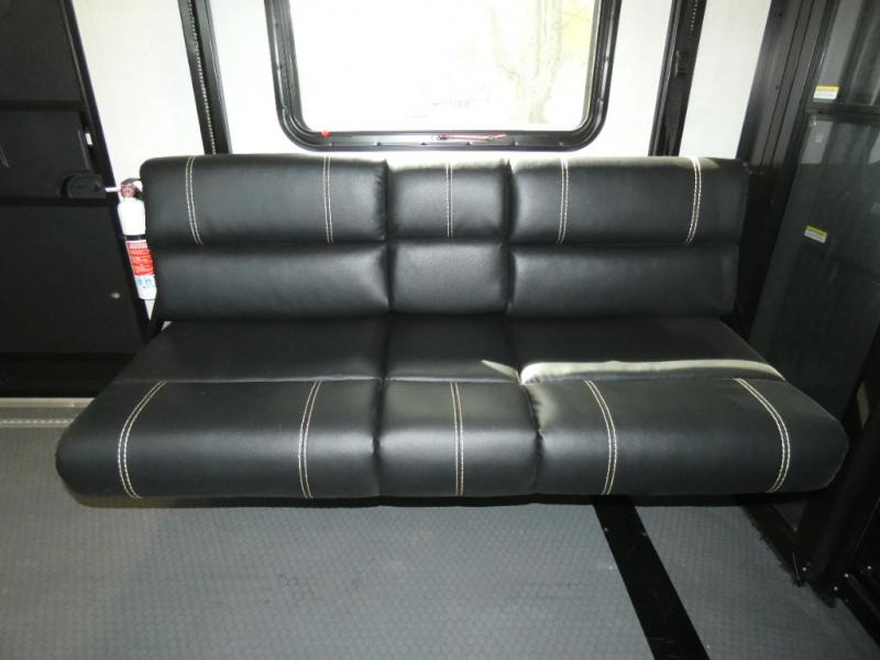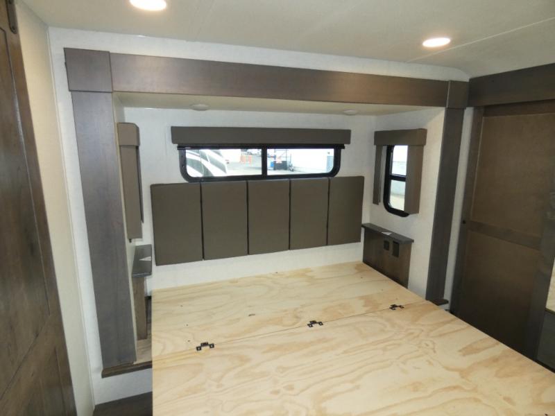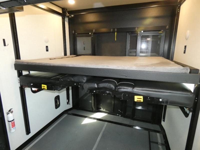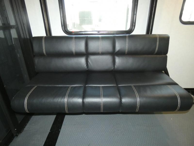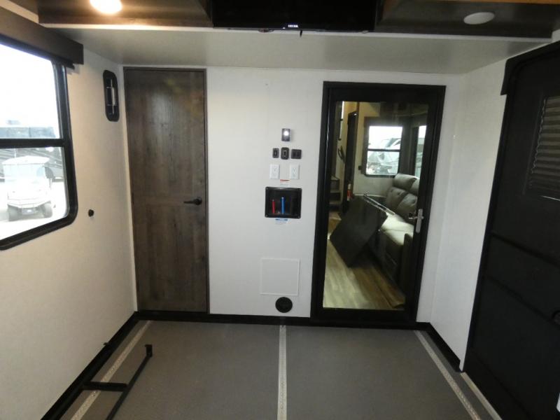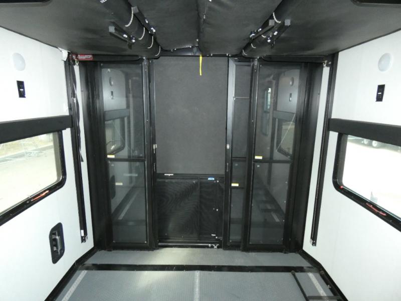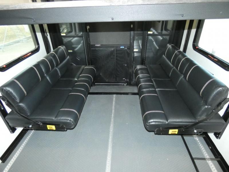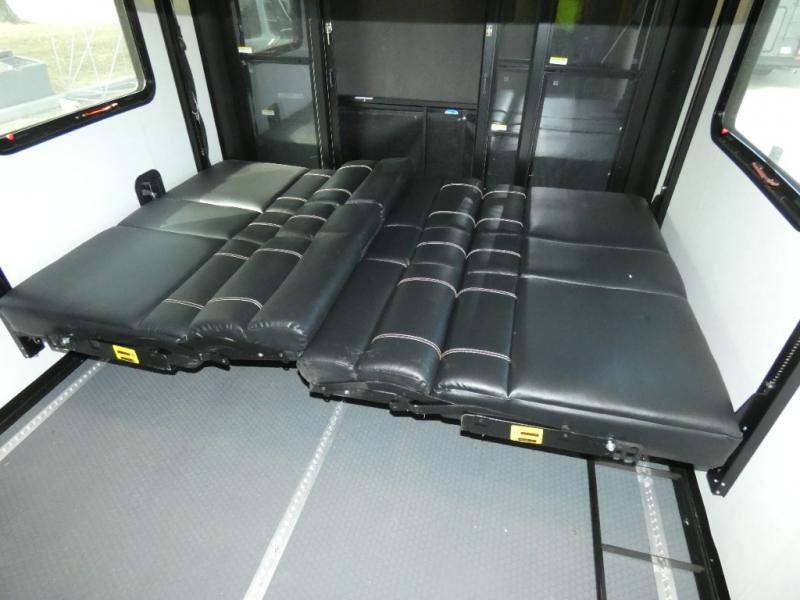 The whole family will have a fun time camping in this toy hauler! You can easily load up your toys into the 11' garage area with the 8' weather resistant ramp door and keep them filled with the dual 30 gallon fuel tanks. Once you unload your toys from the garage area, you can set up the opposing HappiJac sofas with a queen mattress above them, the loft that opens to the living room, and the half bathroom. The kitchen has everything you need to prepare your best meals including two hutches, three pantries, and a kitchen island with two bar stools to enjoy your morning coffee and eggs. The dual entry bathroom has a 48" x 30" shower and leads directly into the front private bedroom. Inside the bedroom is a king bed slide for more walking around space, a flip top dresser, and a front wardrobe.