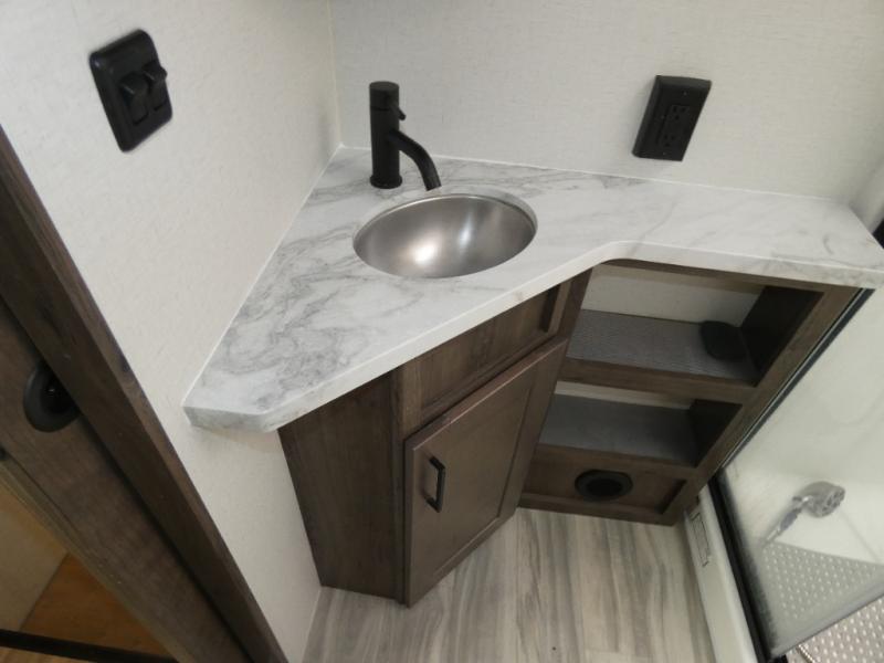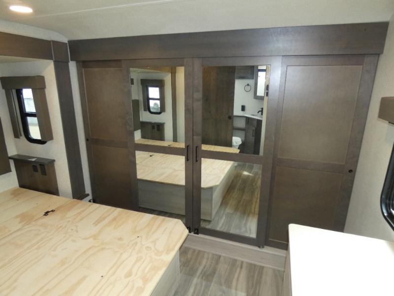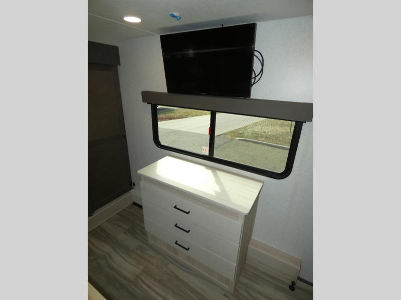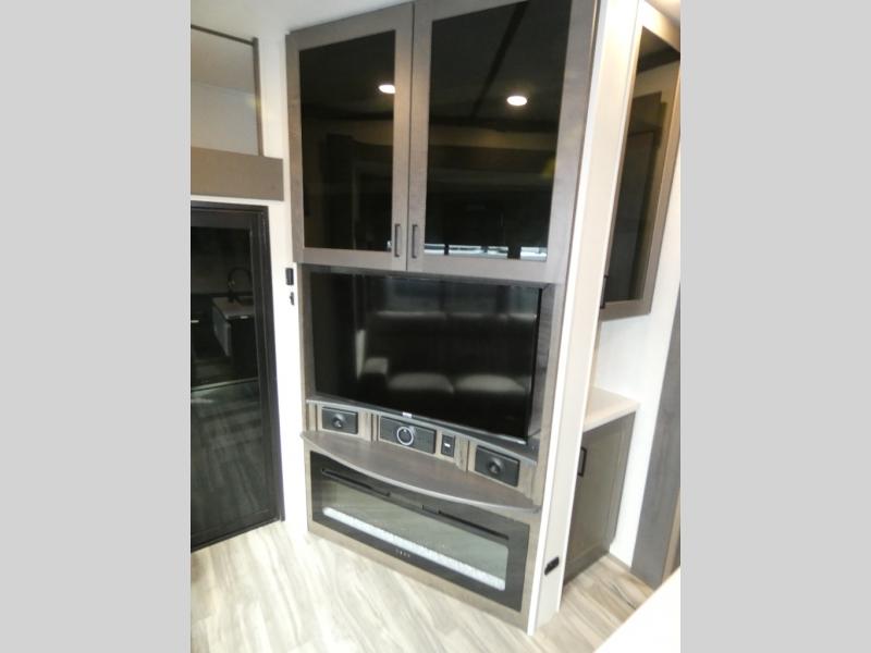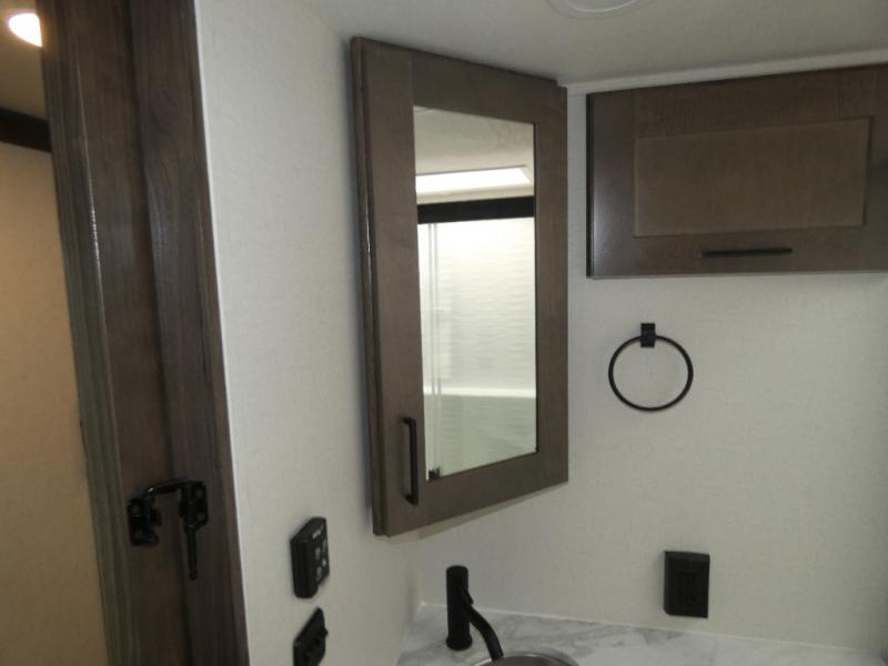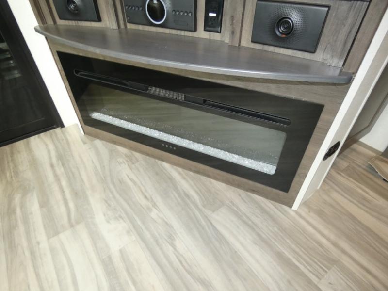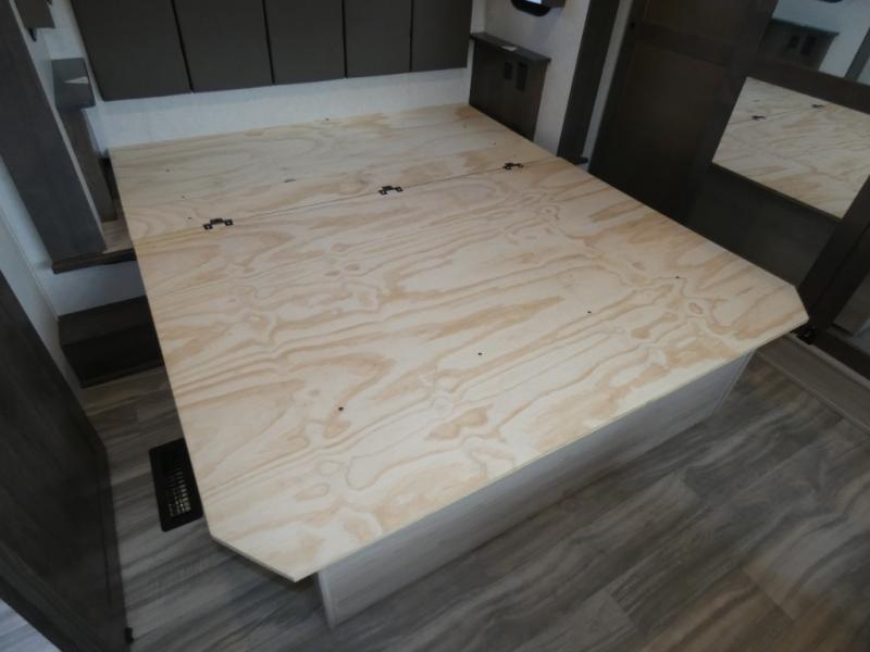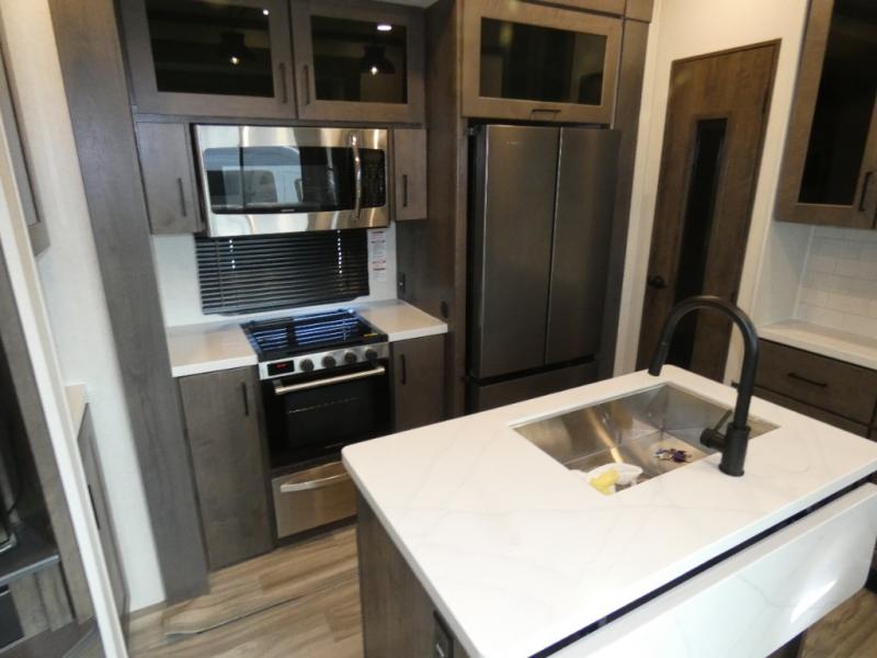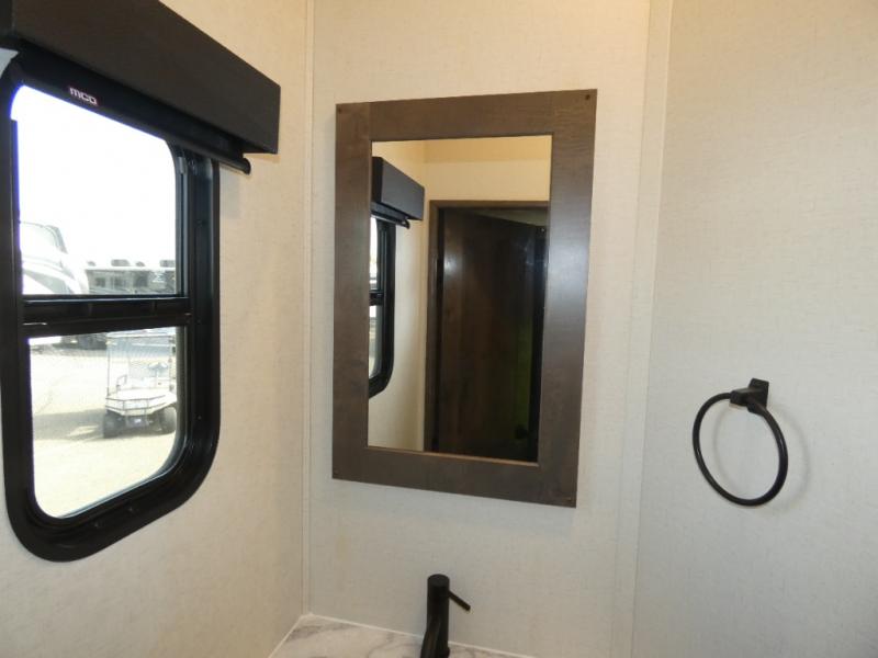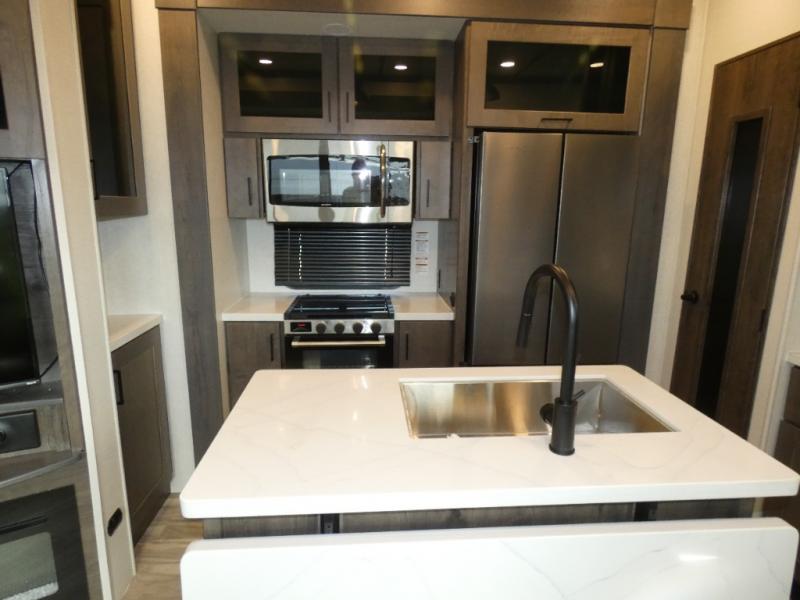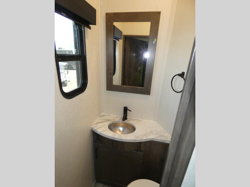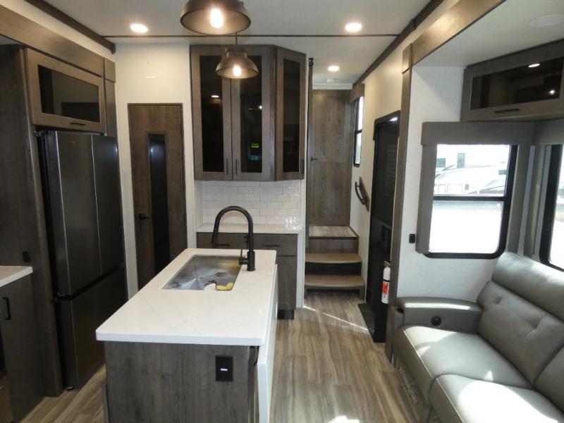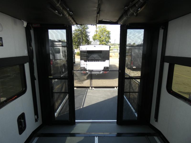 The whole family will have a fun time camping in this toy hauler! You can easily load up your toys into the 11' garage area with the 8' weather resistant ramp door and keep them filled with the dual 30 gallon fuel tanks. Once you unload your toys from the garage area, you can set up the opposing HappiJac sofas with a queen mattress above them, the loft that opens to the living room, and the half bathroom. The kitchen has everything you need to prepare your best meals including two hutches, three pantries, and a kitchen island with two bar stools to enjoy your morning coffee and eggs. The dual entry bathroom has a 48" x 30" shower and leads directly into the front private bedroom. Inside the bedroom is a king bed slide for more walking around space, a flip top dresser, and a front wardrobe.