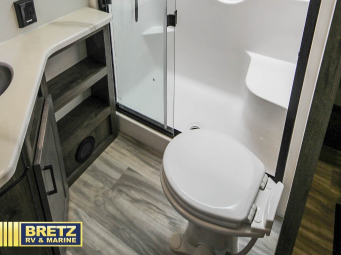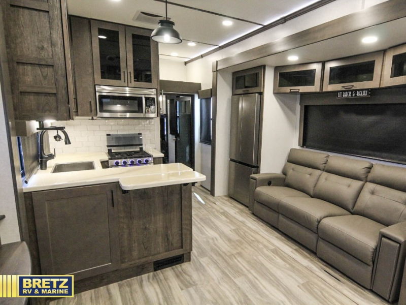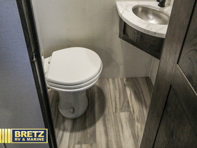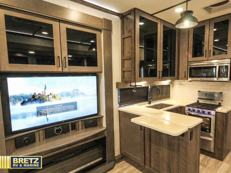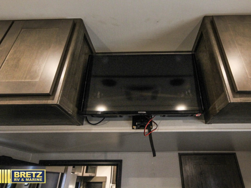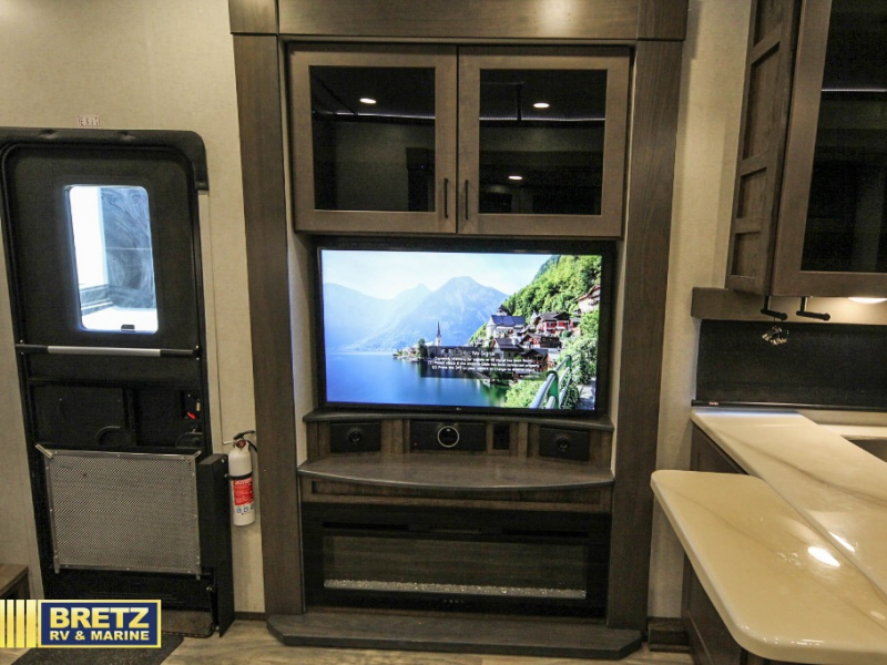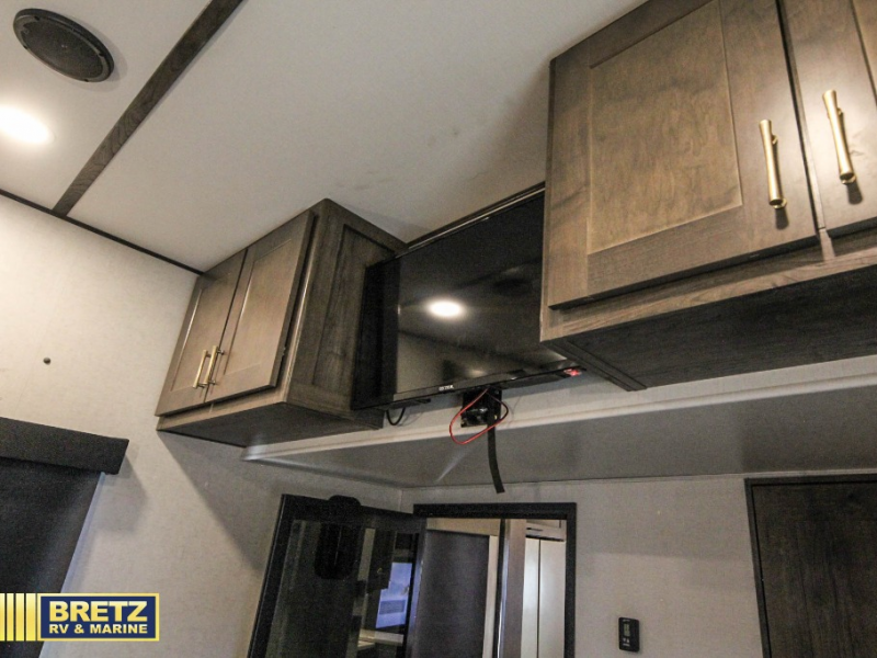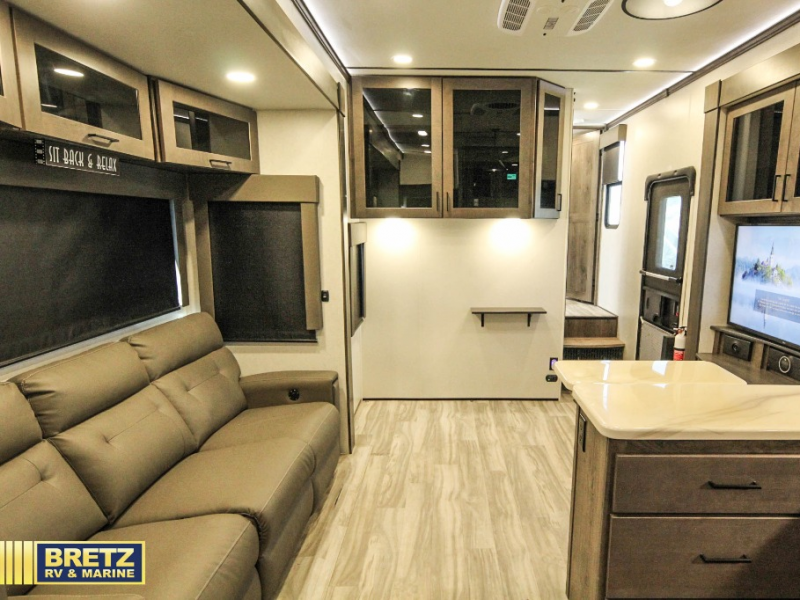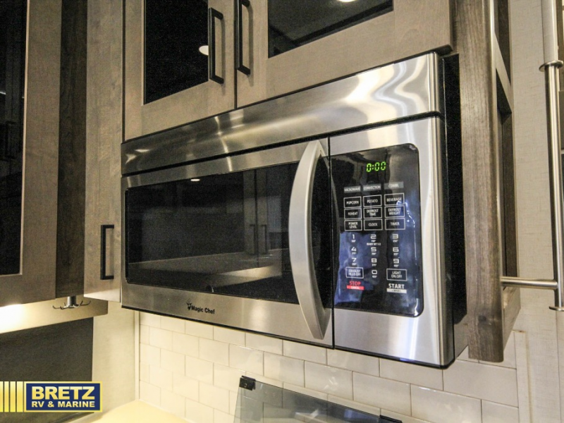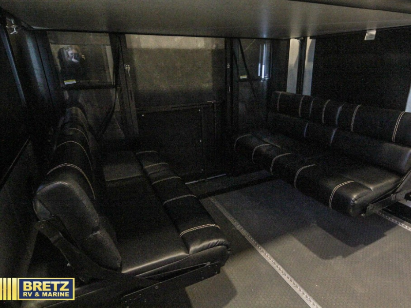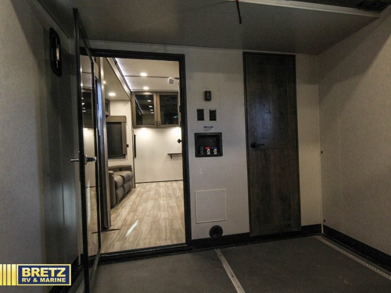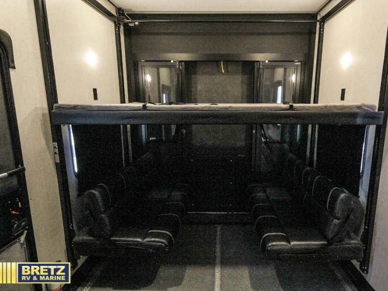 There is room for your off-road toys and the whole family in this toy hauler! The bath and a half makes life more convenient and the dual entry doors create a smooth flow of traffic in and out of the unit. Aside from 13' of garage space, an air compressor, and an entrance/exit door there are also opposing HappiJac sofas with a queen bed above them, a loft that opens to the living room, and a half bathroom. The chef can prepare their best meals with the four burner cooktop while two others sit at the flip up counter with two bar stools. After a fun day on the trails, wash up in the full bathroom with the 48" x 30" shower, grab your pajamas from the front wardrobe or flip top dresser in the front private bedroom then relax on one of the two sofas by the fireplace and Smart TV!