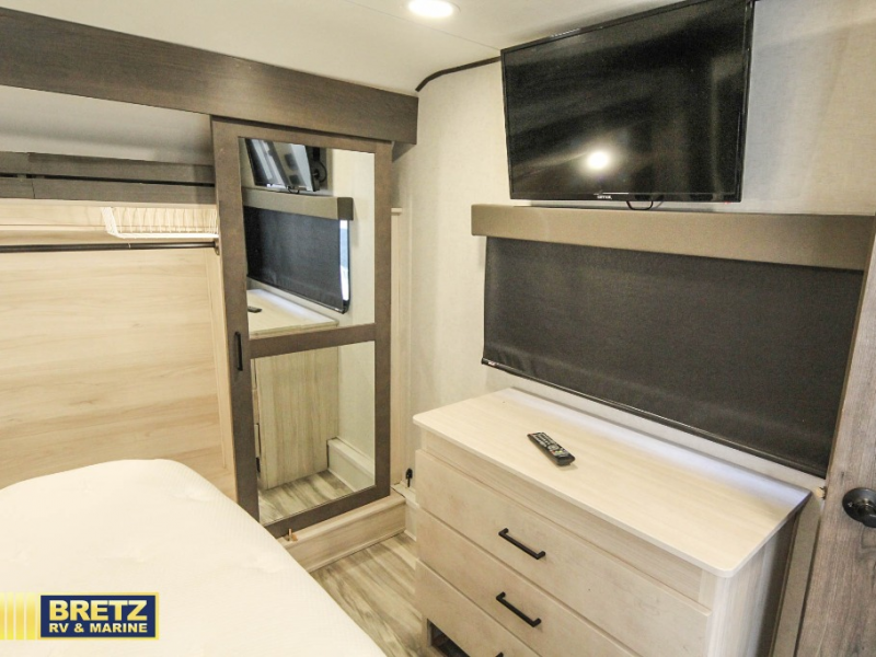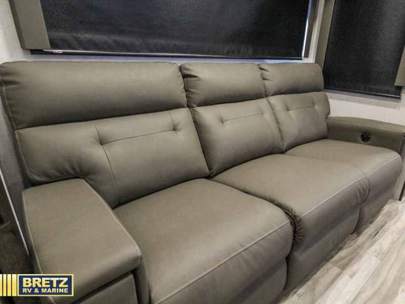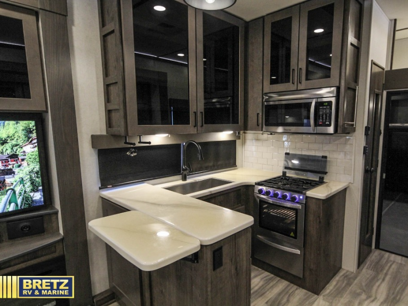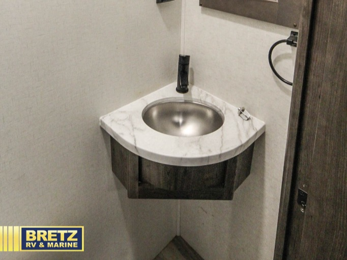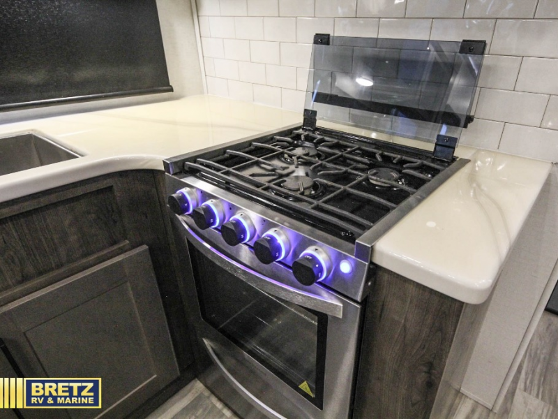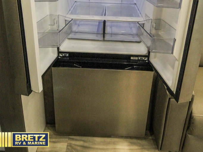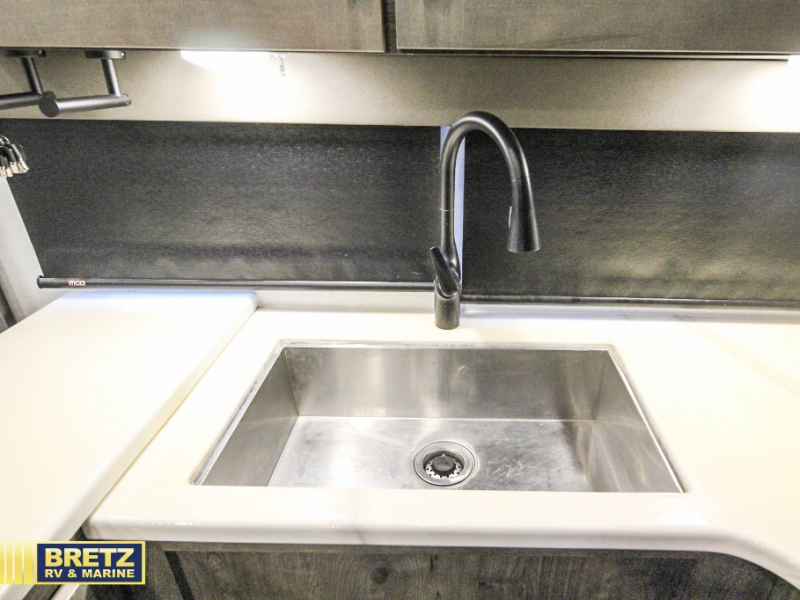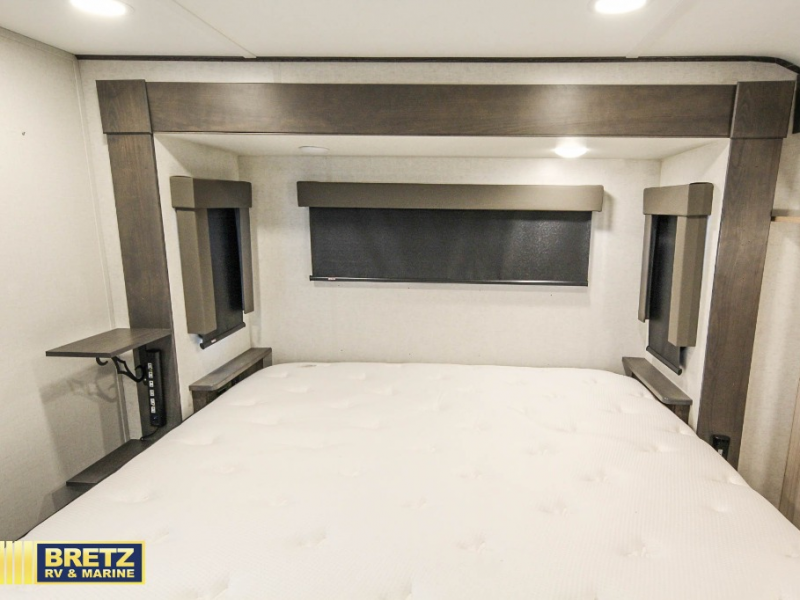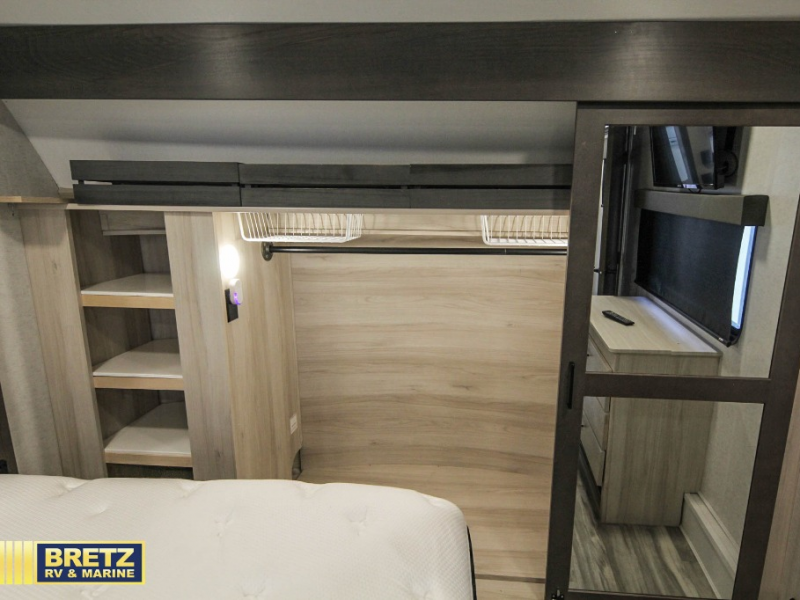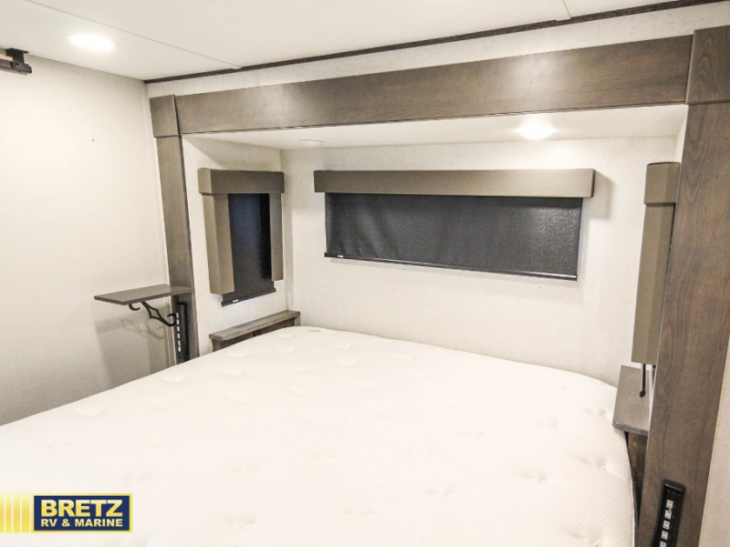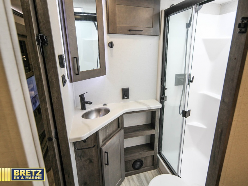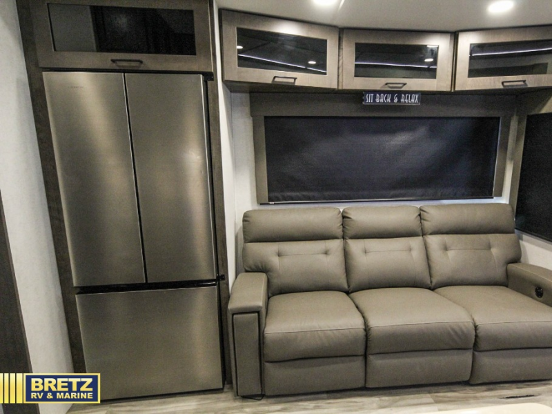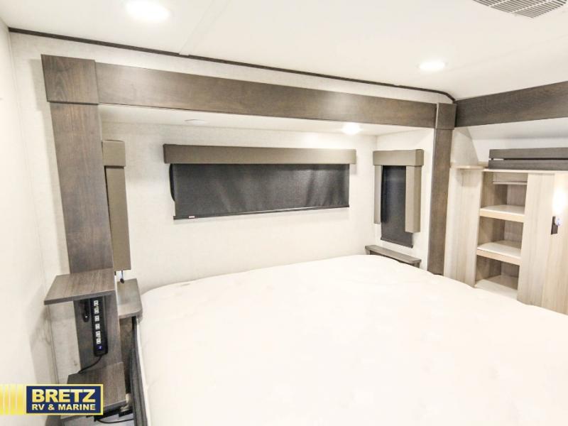 There is room for your off-road toys and the whole family in this toy hauler! The bath and a half makes life more convenient and the dual entry doors create a smooth flow of traffic in and out of the unit. Aside from 13' of garage space, an air compressor, and an entrance/exit door there are also opposing HappiJac sofas with a queen bed above them, a loft that opens to the living room, and a half bathroom. The chef can prepare their best meals with the four burner cooktop while two others sit at the flip up counter with two bar stools. After a fun day on the trails, wash up in the full bathroom with the 48" x 30" shower, grab your pajamas from the front wardrobe or flip top dresser in the front private bedroom then relax on one of the two sofas by the fireplace and Smart TV!