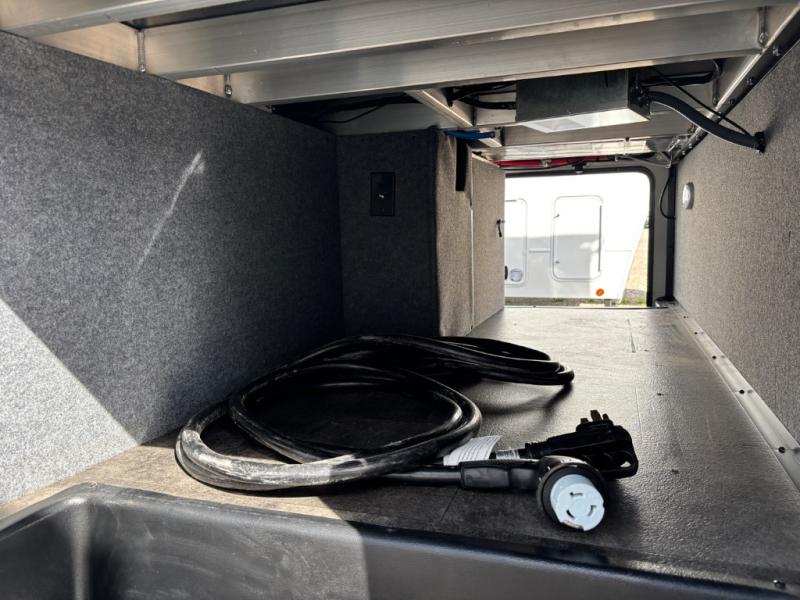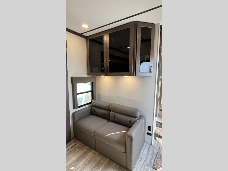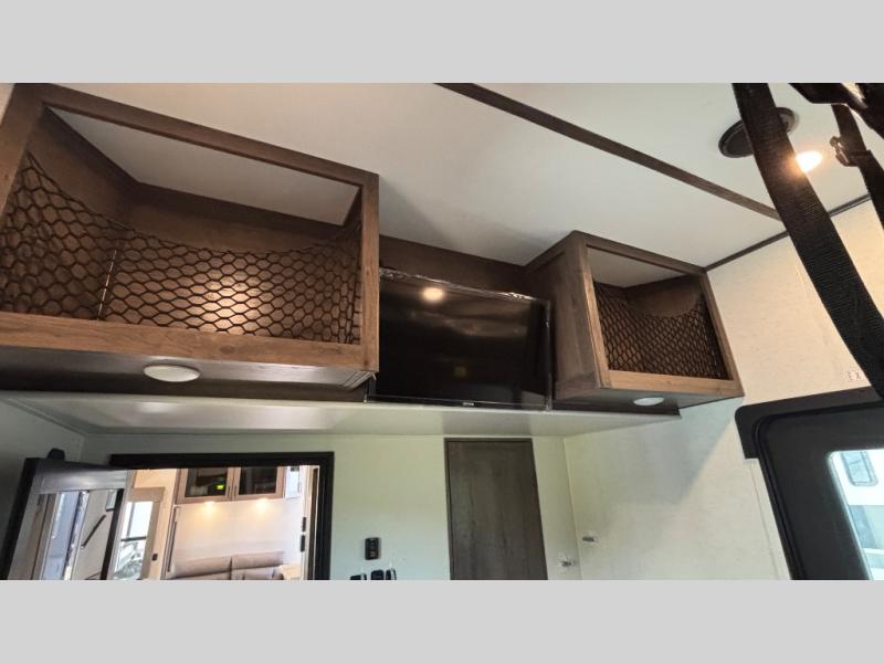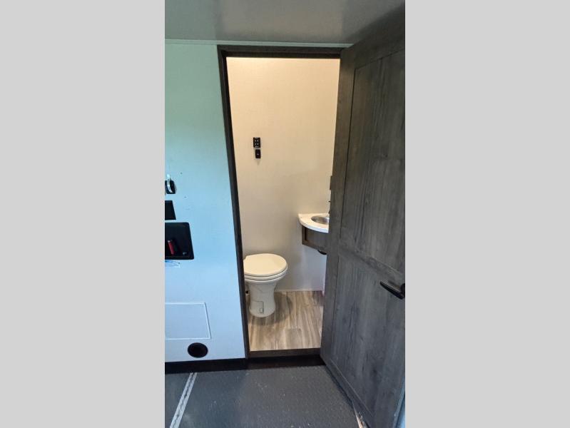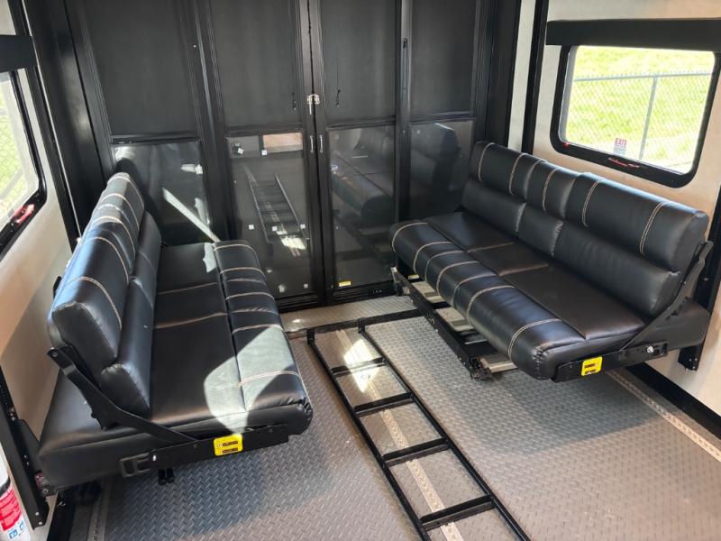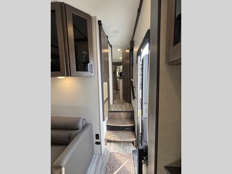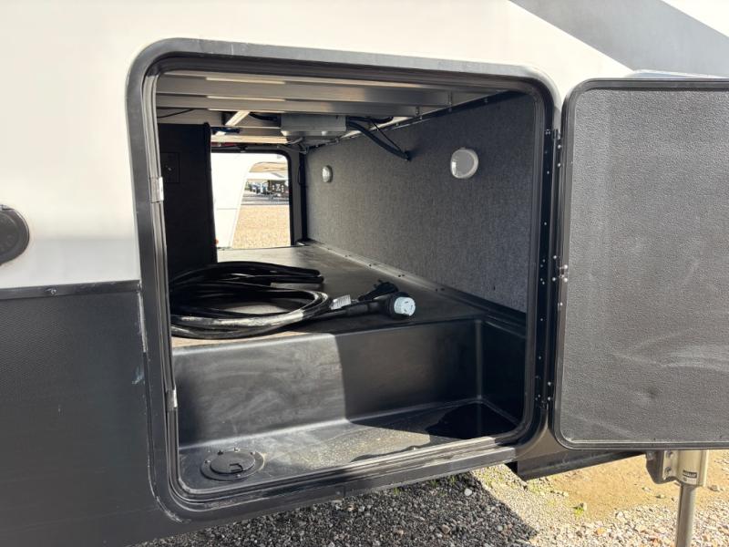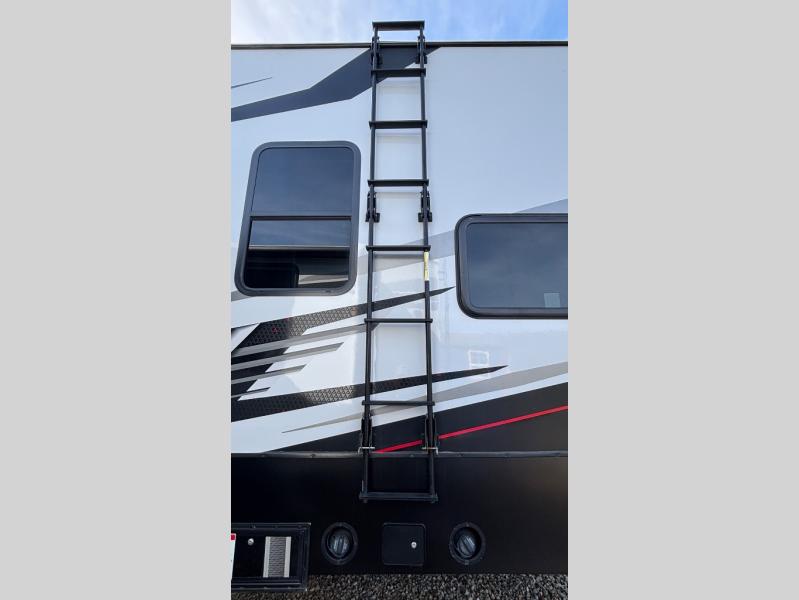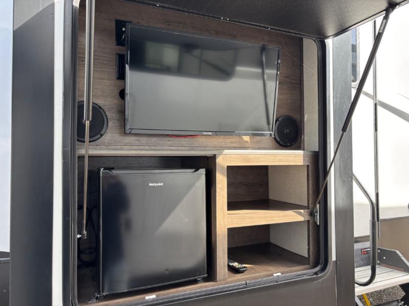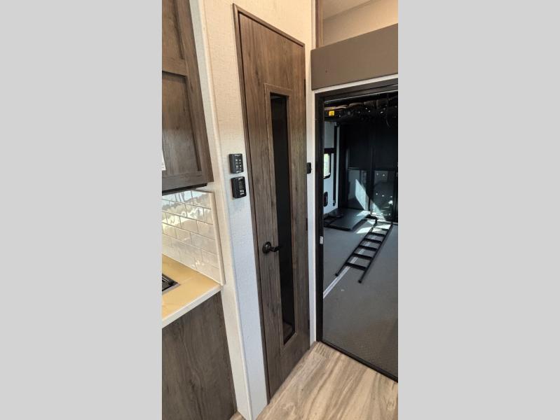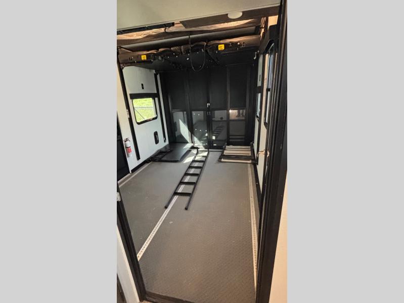 There is room for your off-road toys and the whole family in this toy hauler! The bath and a half makes life more convenient and the dual entry doors create a smooth flow of traffic in and out of the unit. Aside from 13' of garage space, an air compressor, and an entrance/exit door there are also opposing HappiJac sofas with a queen bed above them, a loft that opens to the living room, and a half bathroom. The chef can prepare their best meals with the four burner cooktop while two others sit at the flip up counter with two bar stools. After a fun day on the trails, wash up in the full bathroom with the 48" x 30" shower, grab your pajamas from the front wardrobe or flip top dresser in the front private bedroom then relax on one of the two sofas by the fireplace and Smart TV!