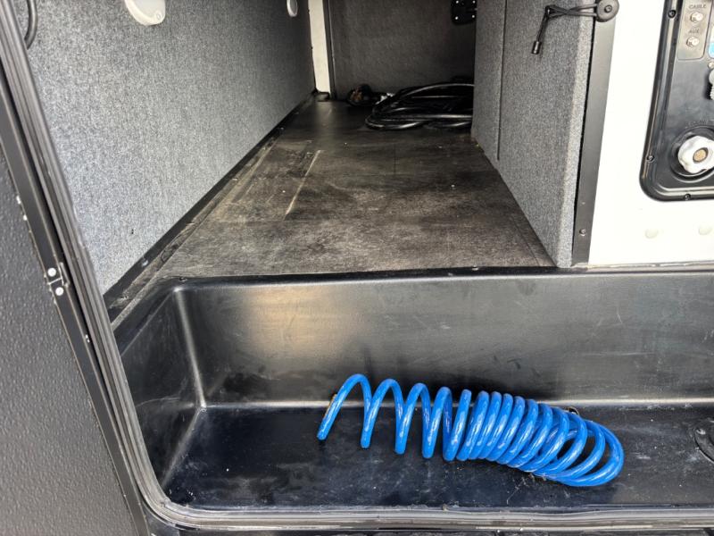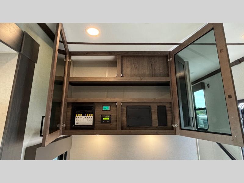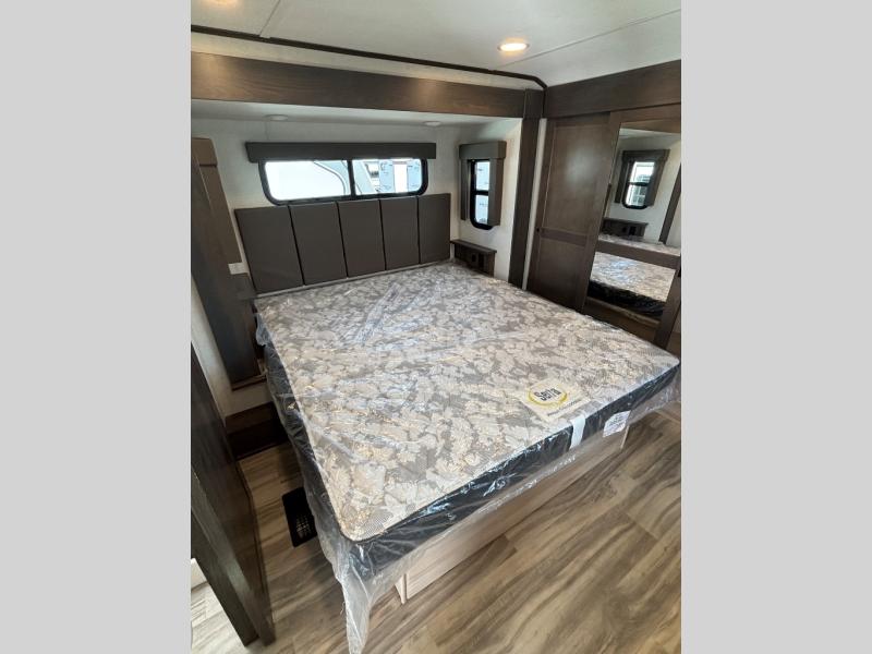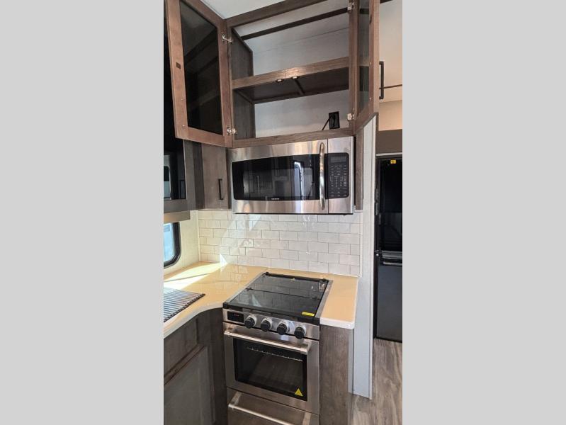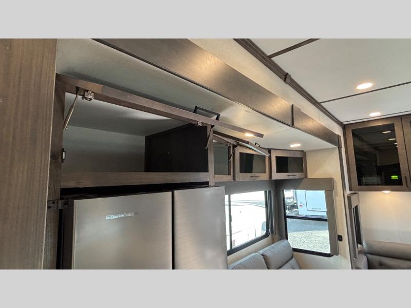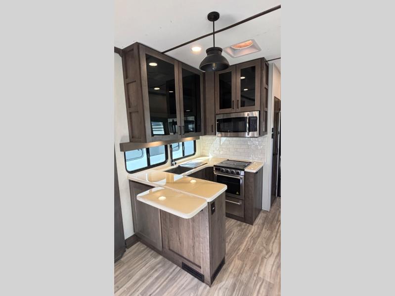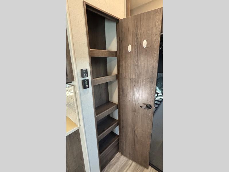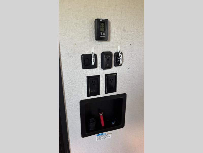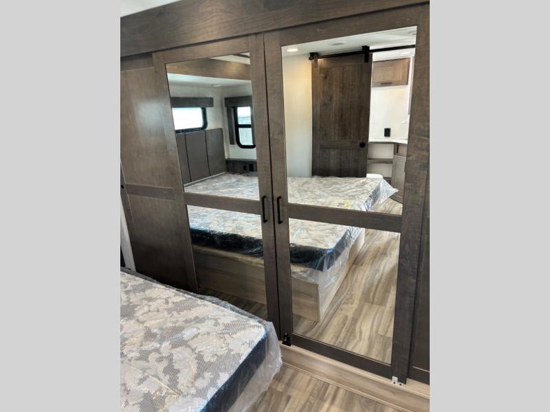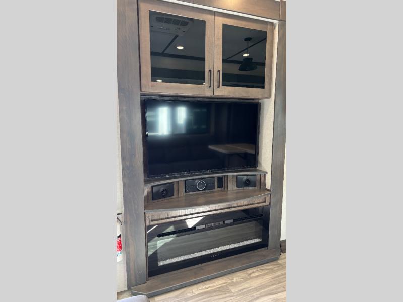 There is room for your off-road toys and the whole family in this toy hauler! The bath and a half makes life more convenient and the dual entry doors create a smooth flow of traffic in and out of the unit. Aside from 13' of garage space, an air compressor, and an entrance/exit door there are also opposing HappiJac sofas with a queen bed above them, a loft that opens to the living room, and a half bathroom. The chef can prepare their best meals with the four burner cooktop while two others sit at the flip up counter with two bar stools. After a fun day on the trails, wash up in the full bathroom with the 48" x 30" shower, grab your pajamas from the front wardrobe or flip top dresser in the front private bedroom then relax on one of the two sofas by the fireplace and Smart TV!