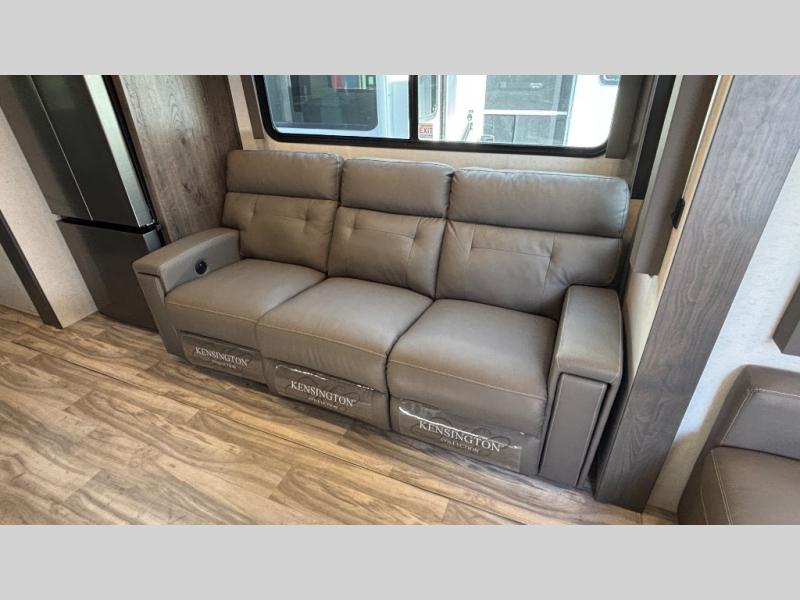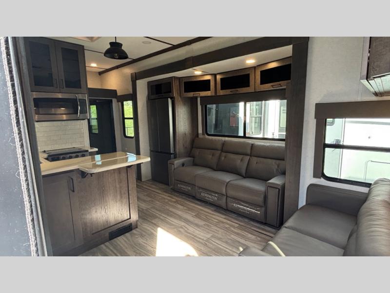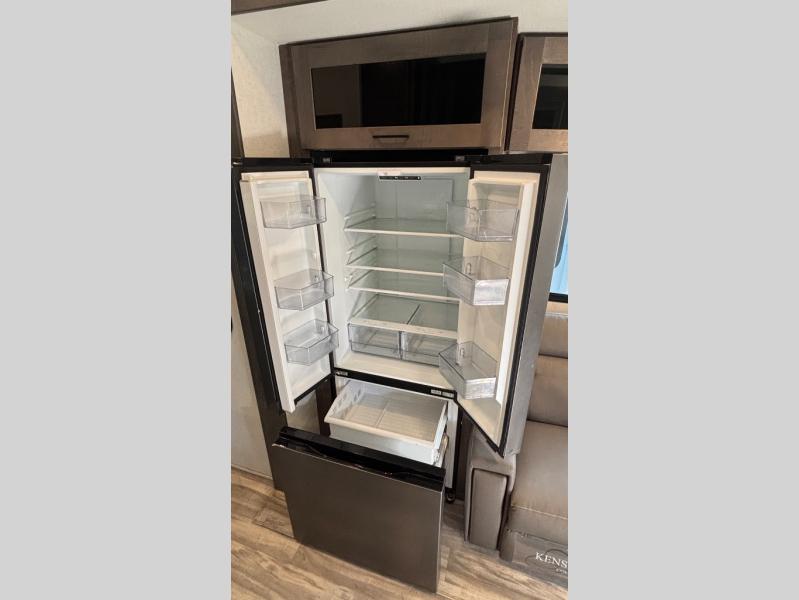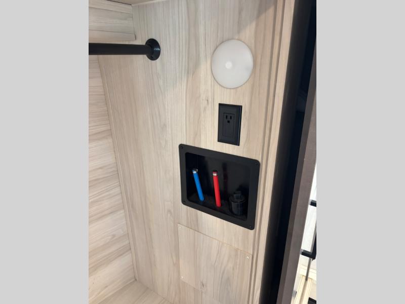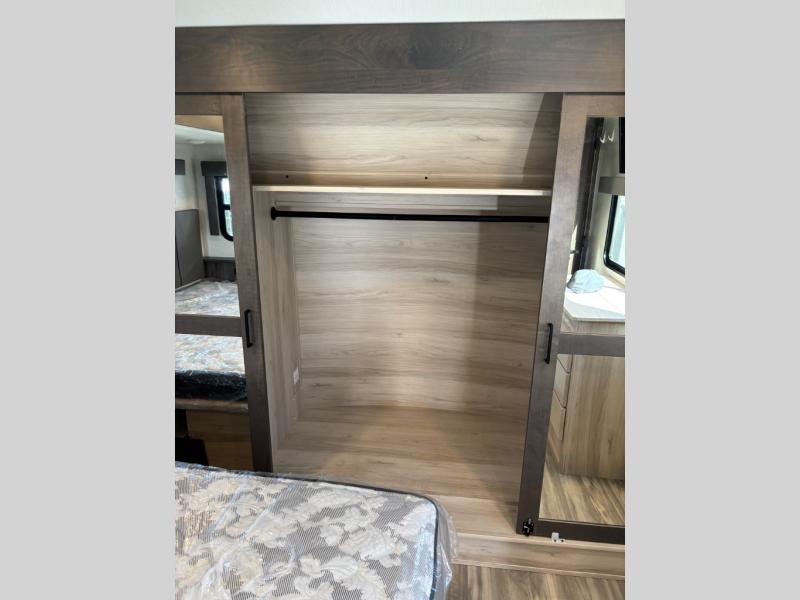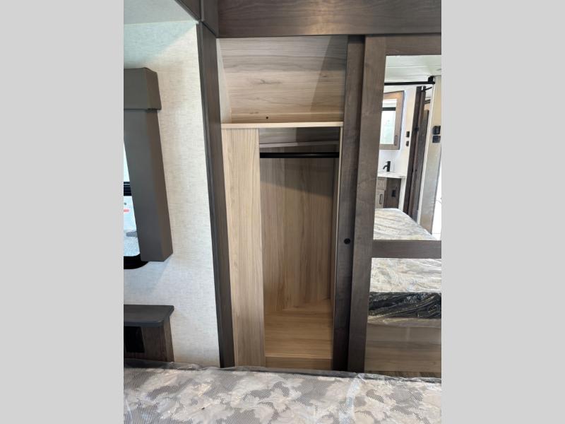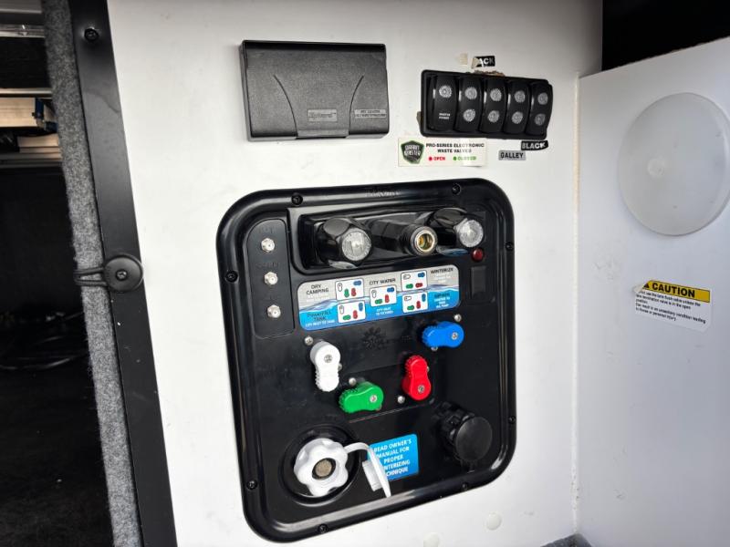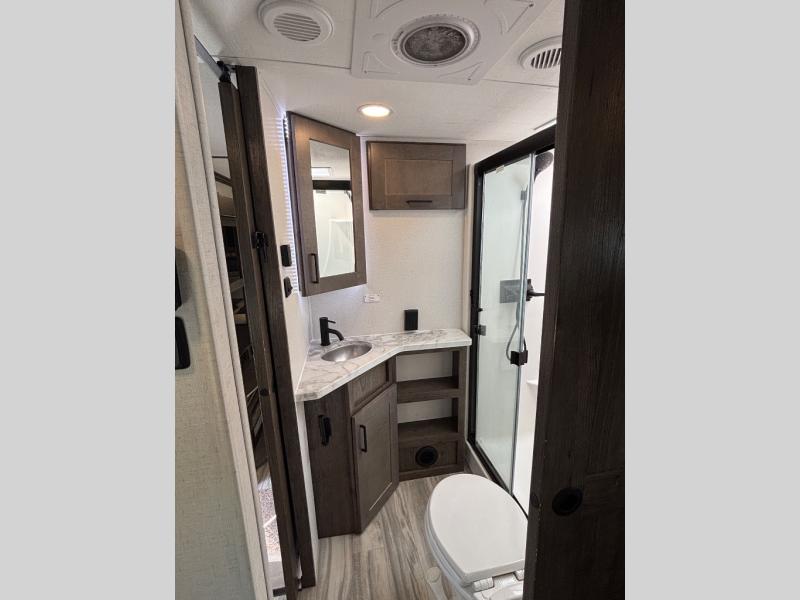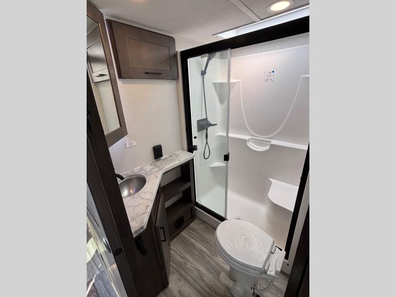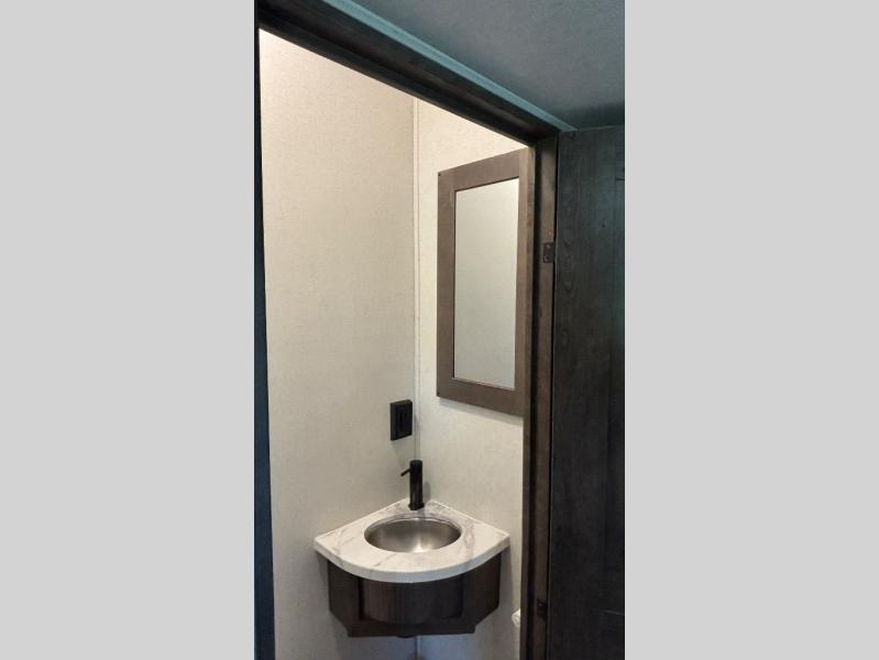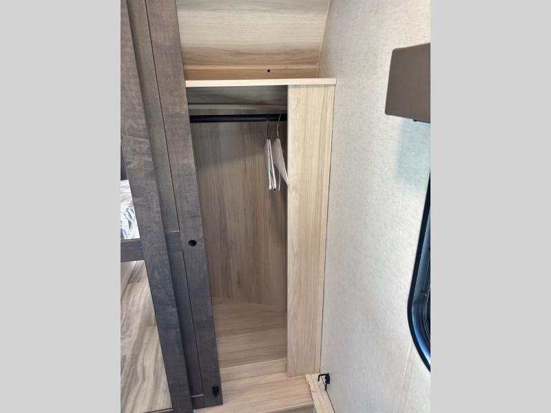 There is room for your off-road toys and the whole family in this toy hauler! The bath and a half makes life more convenient and the dual entry doors create a smooth flow of traffic in and out of the unit. Aside from 13' of garage space, an air compressor, and an entrance/exit door there are also opposing HappiJac sofas with a queen bed above them, a loft that opens to the living room, and a half bathroom. The chef can prepare their best meals with the four burner cooktop while two others sit at the flip up counter with two bar stools. After a fun day on the trails, wash up in the full bathroom with the 48" x 30" shower, grab your pajamas from the front wardrobe or flip top dresser in the front private bedroom then relax on one of the two sofas by the fireplace and Smart TV!