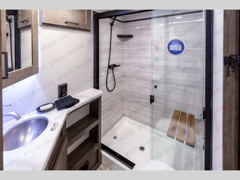 You can easily load up your toys into the 15' garage area of this toy hauler with the 8' weather resistant ramp door and keep them filled with the dual 30 gallon fuel tanks! Once you unload your toys from the garage area, you can set up the opposing HappiJac sofas with a queen mattress above them, the loft that open to the living room, and the half bathroom. The kitchen has everything you need to prepare your best meals including two hutches, three pantries, and a kitchen island with two bar stools to enjoy your morning coffee and eggs. The dual entry bathroom has a 48" x 30" shower and leads directly into the front private bedroom. Inside the bedroom is a king bed slide for more walking around space, a flip top dresser, and a front wardrobe that has an area prepped to add the optional washer and dryer.