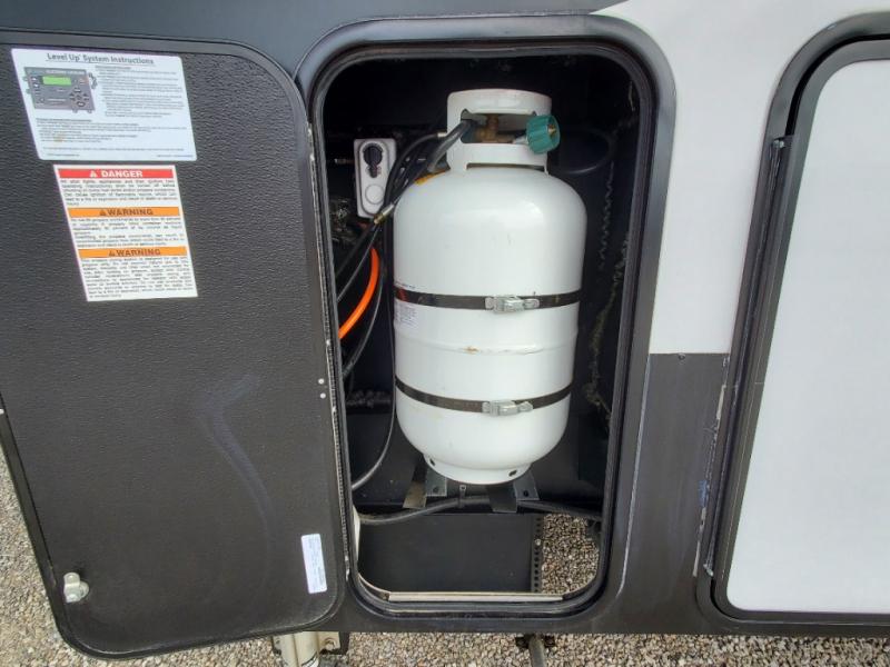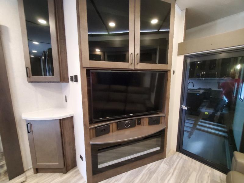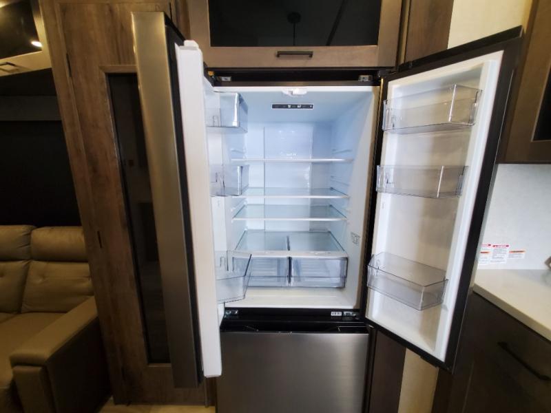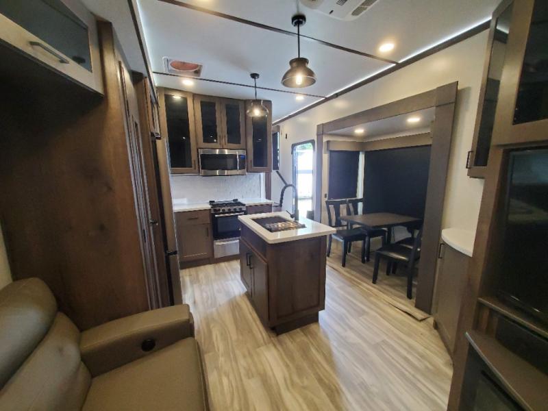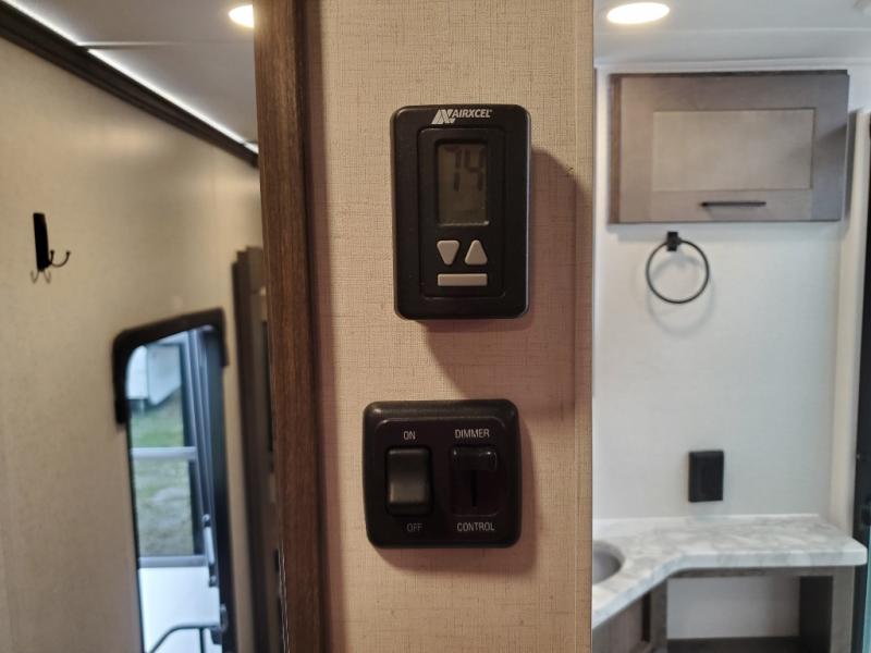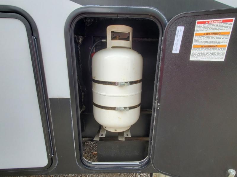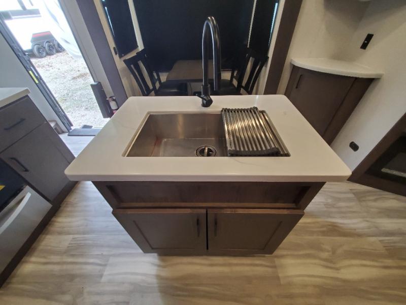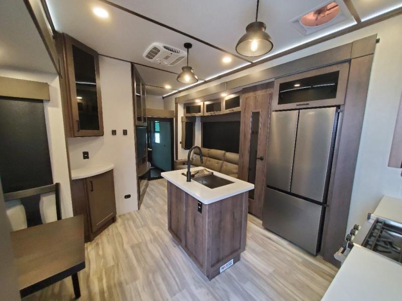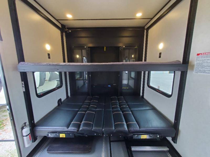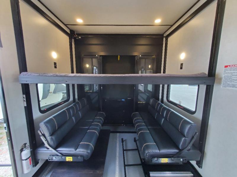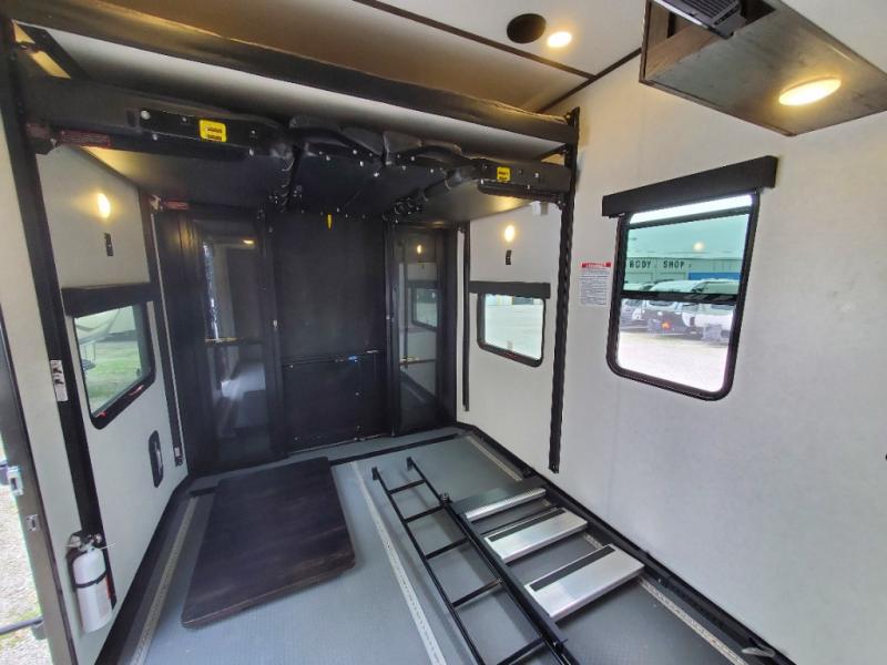 The whole gang will love camping in this toy hauler! There is 13' of garage space to store your off-road toys and once you have arrived at your destination you can set up the HappiJac roll-over sofas with a queen bed above them and the loft which opens to the living area. With two full bathrooms, everyone will stay squeaky clean. The chef can prepare their best meals with the kitchen island, three burner cooktop, and 17 cu. ft. stainless steel refrigerator while others play games at the table and chairs or relax by the fireplace on the sofa. The front private bedroom has a king bed slide for more walking around space, a flip top dresser, and a front wardrobe that is prepped to add an optional washer and dryer, plus it has an entrance into the dual entry bathroom!