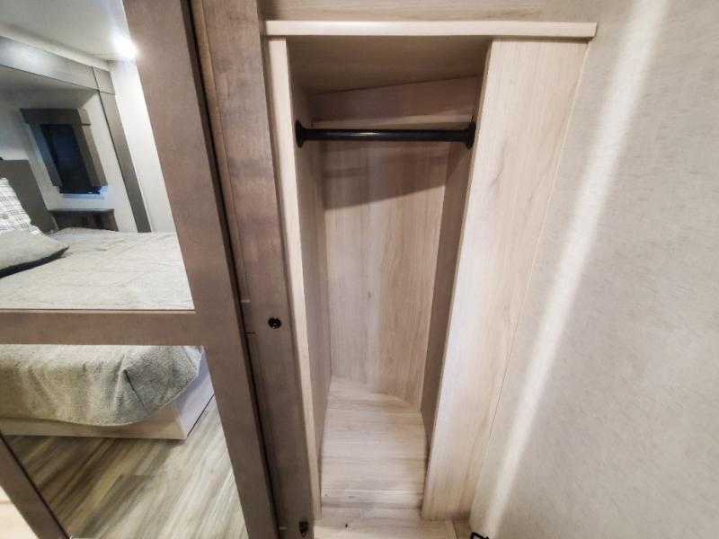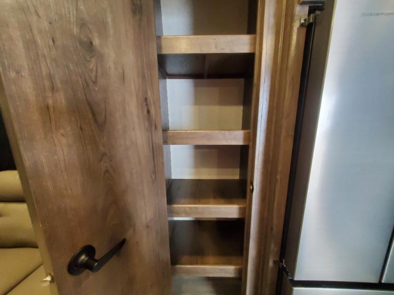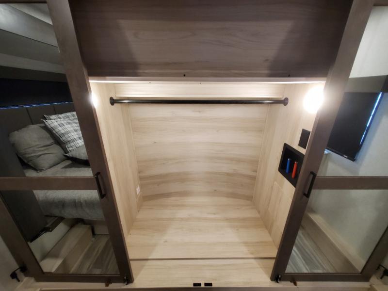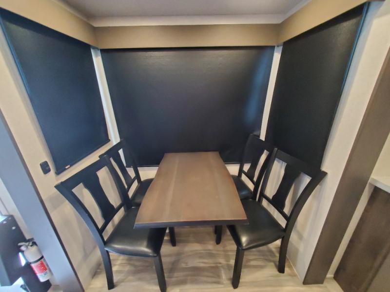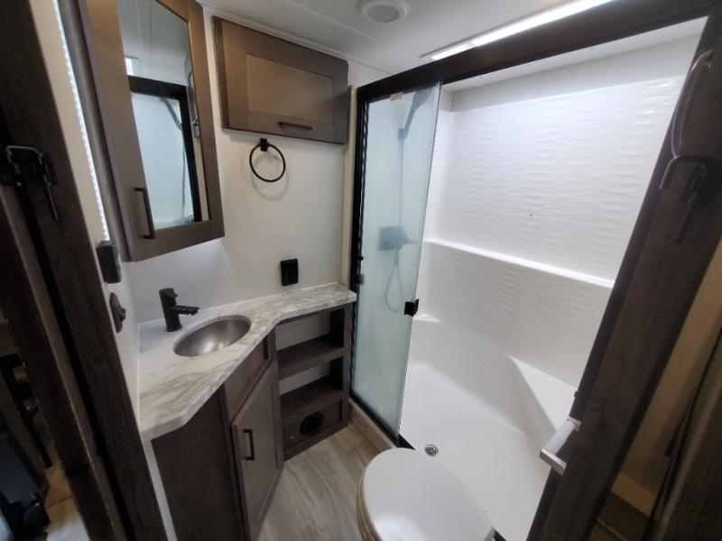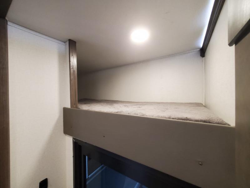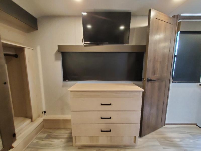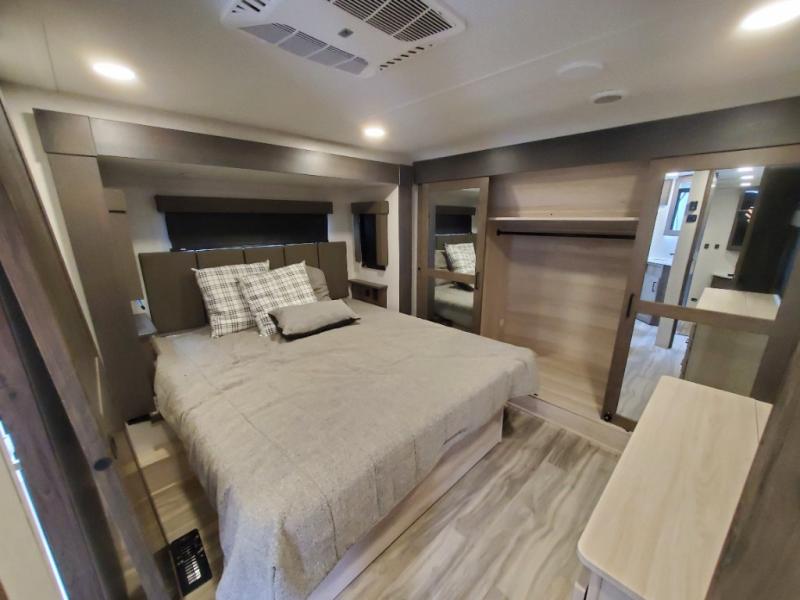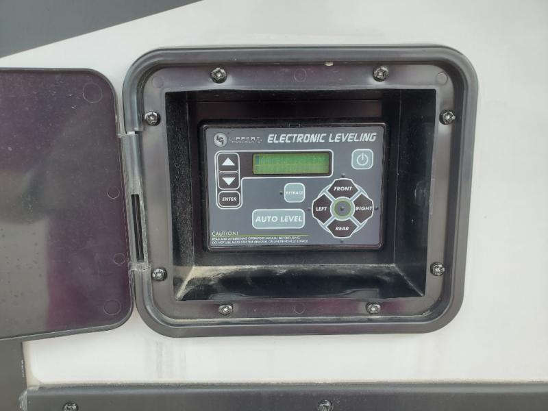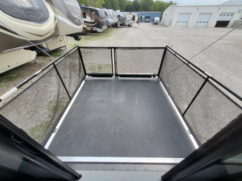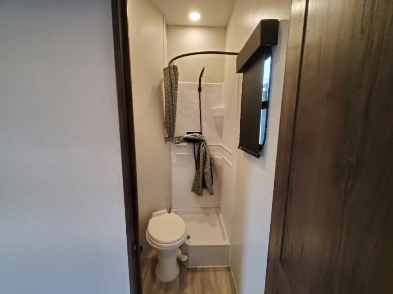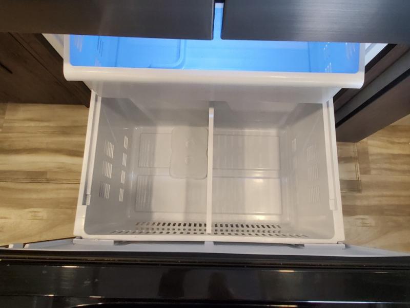 The whole gang will love camping in this toy hauler! There is 13' of garage space to store your off-road toys and once you have arrived at your destination you can set up the HappiJac roll-over sofas with a queen bed above them and the loft which opens to the living area. With two full bathrooms, everyone will stay squeaky clean. The chef can prepare their best meals with the kitchen island, three burner cooktop, and 17 cu. ft. stainless steel refrigerator while others play games at the table and chairs or relax by the fireplace on the sofa. The front private bedroom has a king bed slide for more walking around space, a flip top dresser, and a front wardrobe that is prepped to add an optional washer and dryer, plus it has an entrance into the dual entry bathroom!