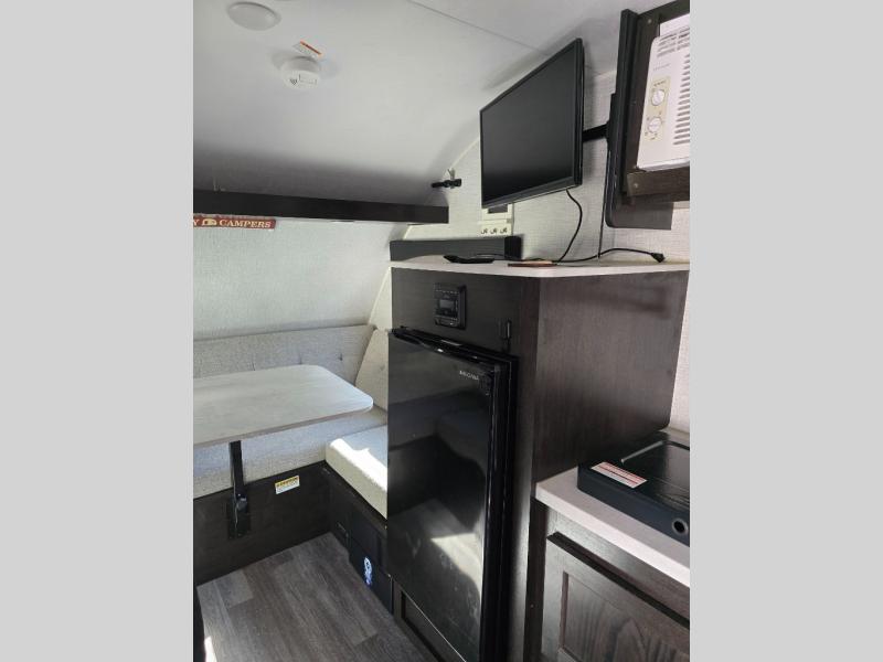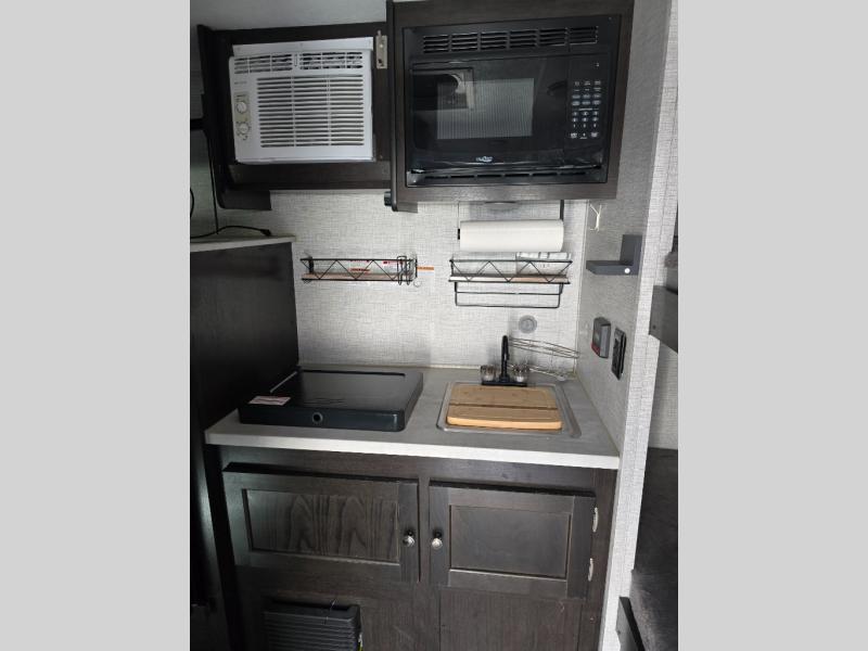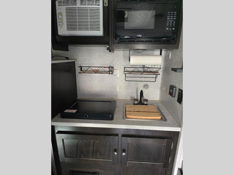 • Kitchen: Two-burner cooktop, microwave, 12V fridge