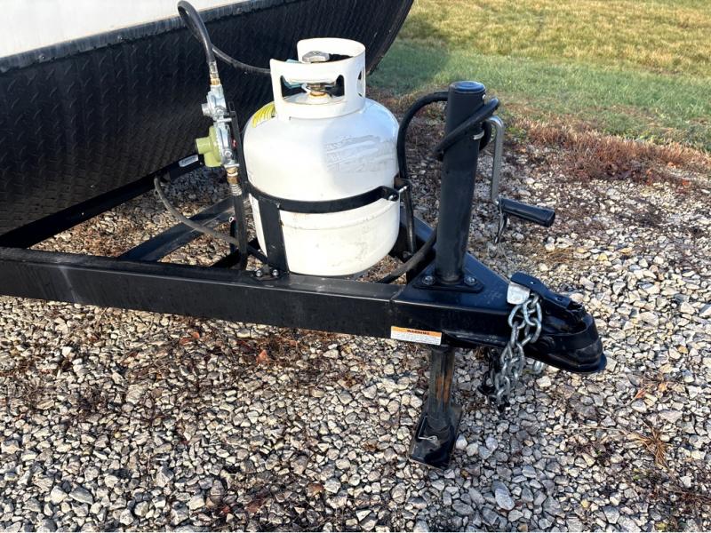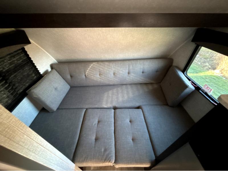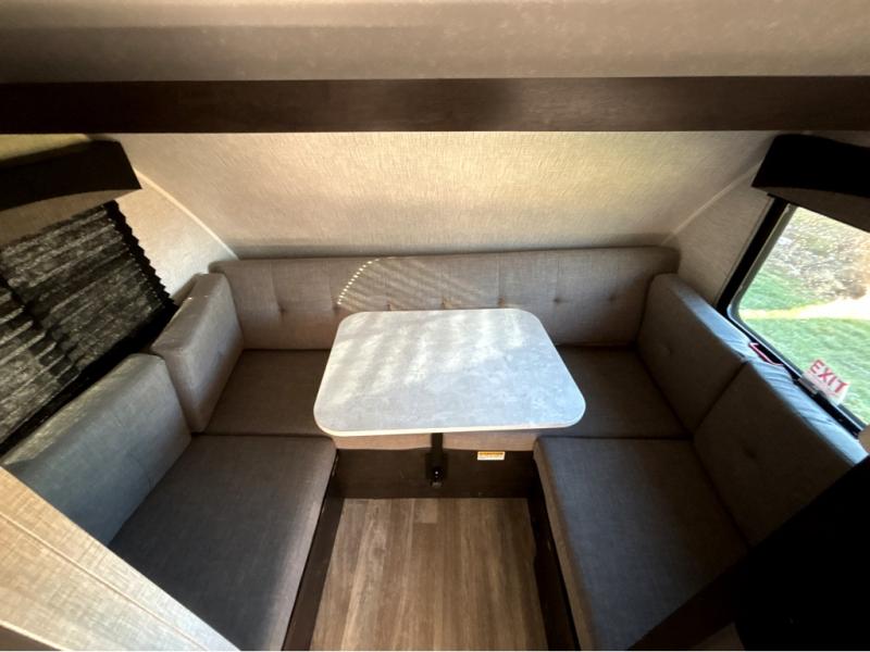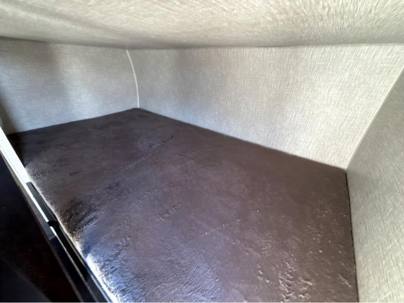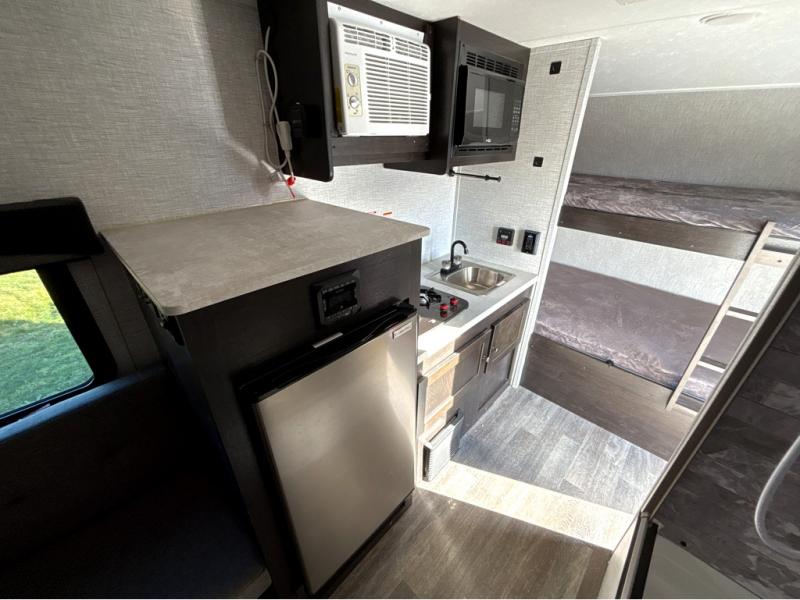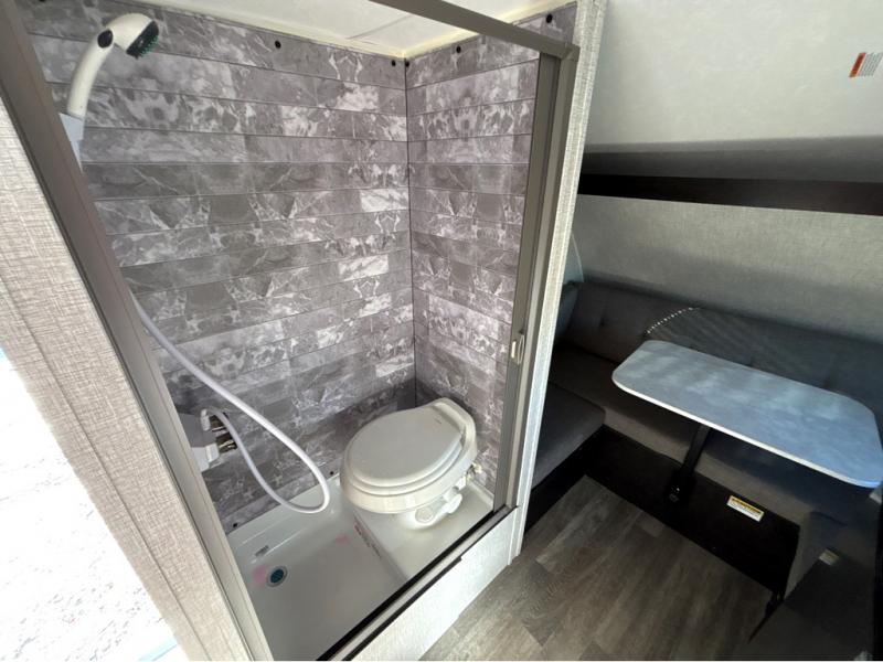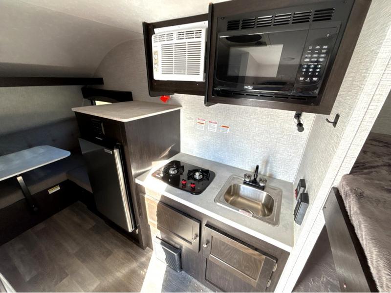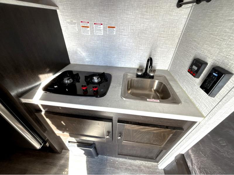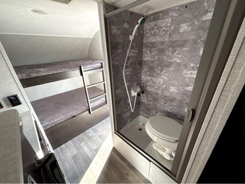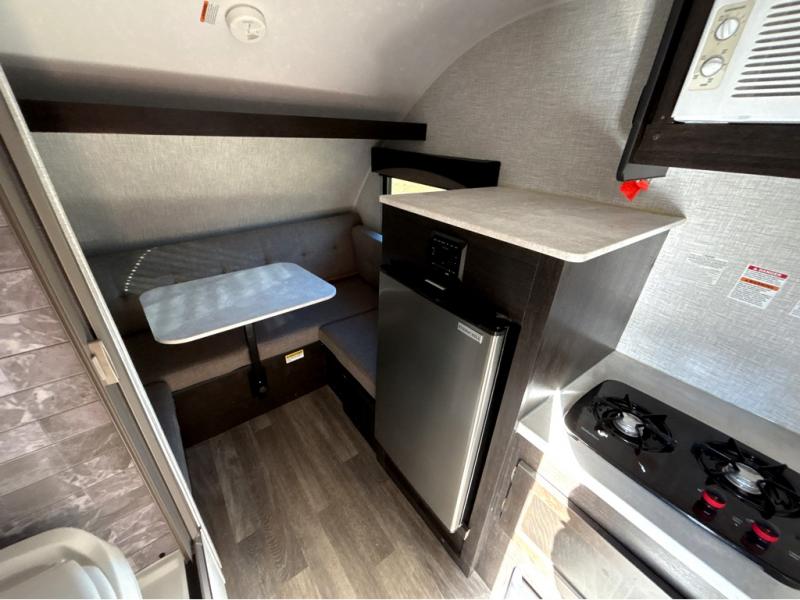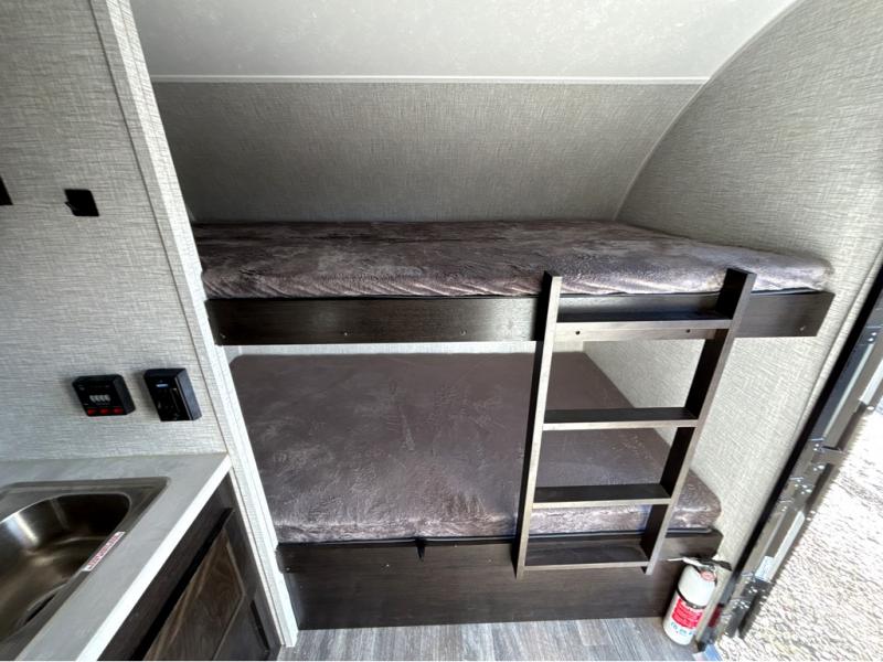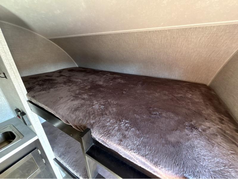 Now you can camp light and bring friends along with you in this teardrop trailer! Your guests or the little ones will love the front bunk beds, while you take the E-Z U-shaped dinette that converts to a queen-size bed. The chef of your group can prepare breakfast on the two burner cooktop, and there is even a sink here to clean up. This model also includes a 12V refrigerator for your perishables and TV prep if you decide to bring along your own TV.