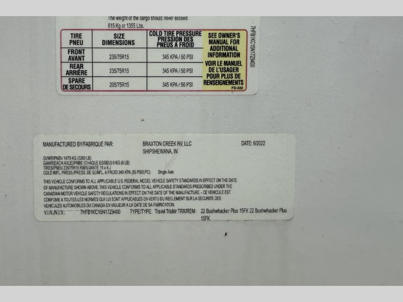 Used 2022 Braxton Creek Bushwhacker Plus 15 FK Teardrop Trailer