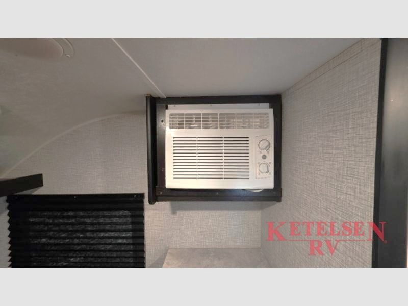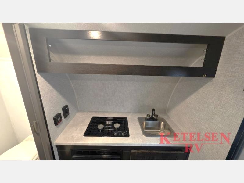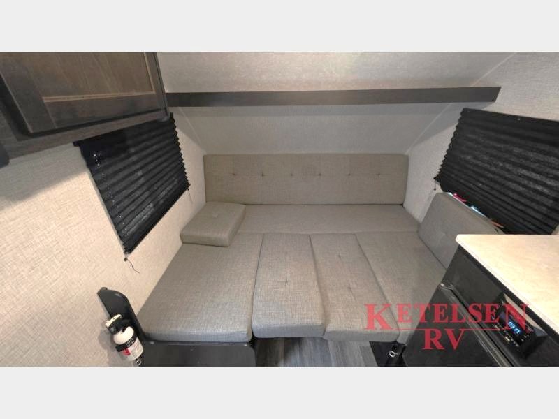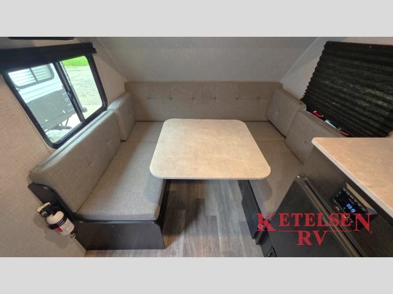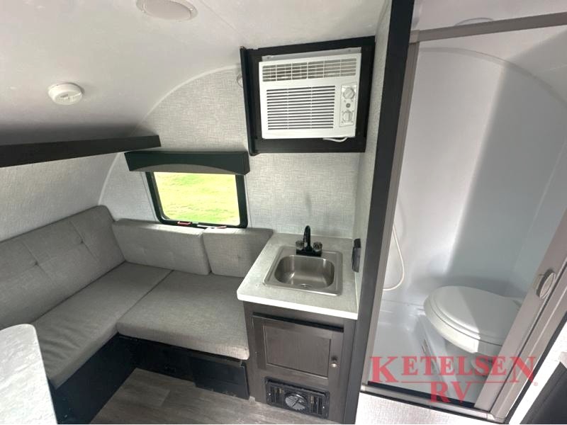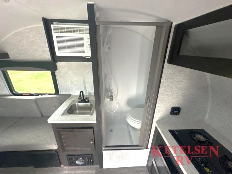 Comfort and convenience is found in this cozy trailer for two! Once you've found your campsite you can unpack your things and freshen up in the wet bath. Whip up a hearty lunch on the two burner cooktop, grab a cold drink from the 12V refrigerator, then dine around the E-Z U-shaped dinette that can also double as your sleeping space. You will find a large shelf and overhead cabinets for all your belongings, and the 5,000 BTU A/C will keep you cool during the hot summer months!