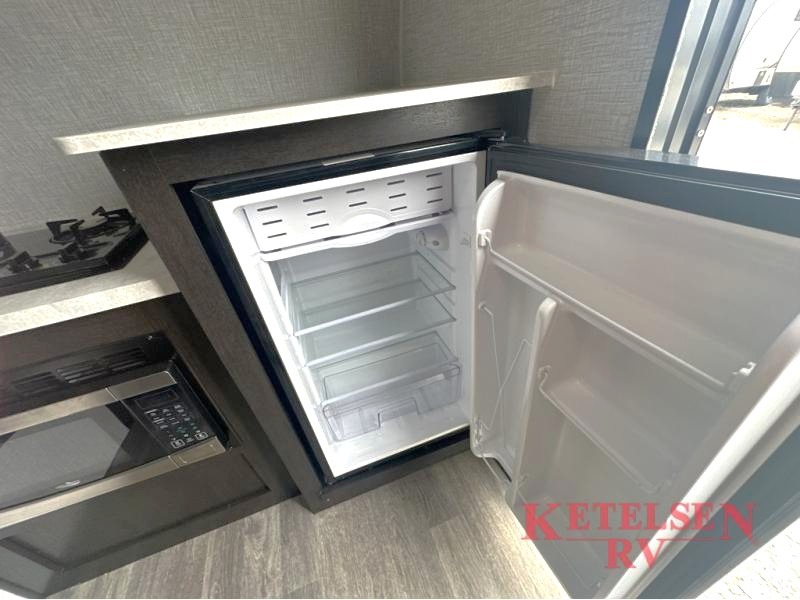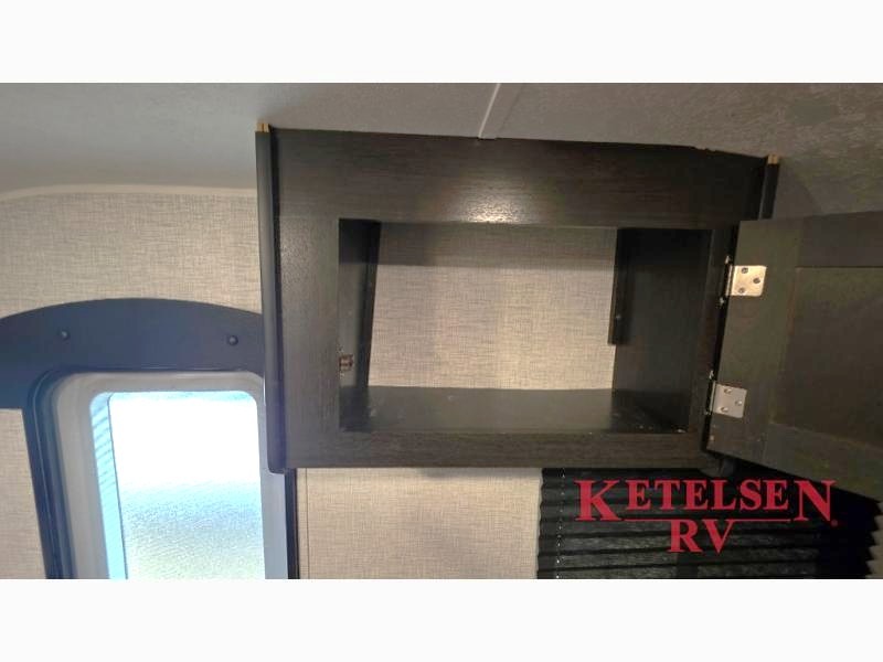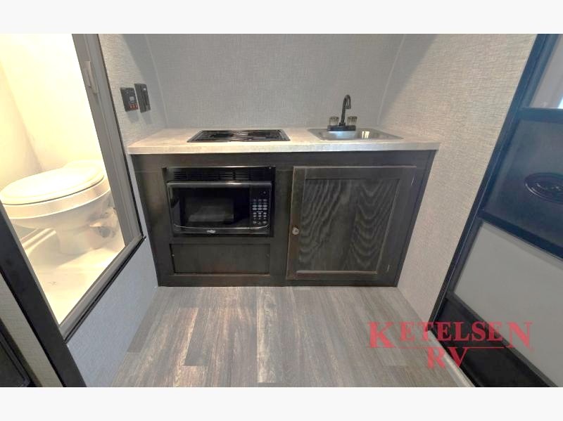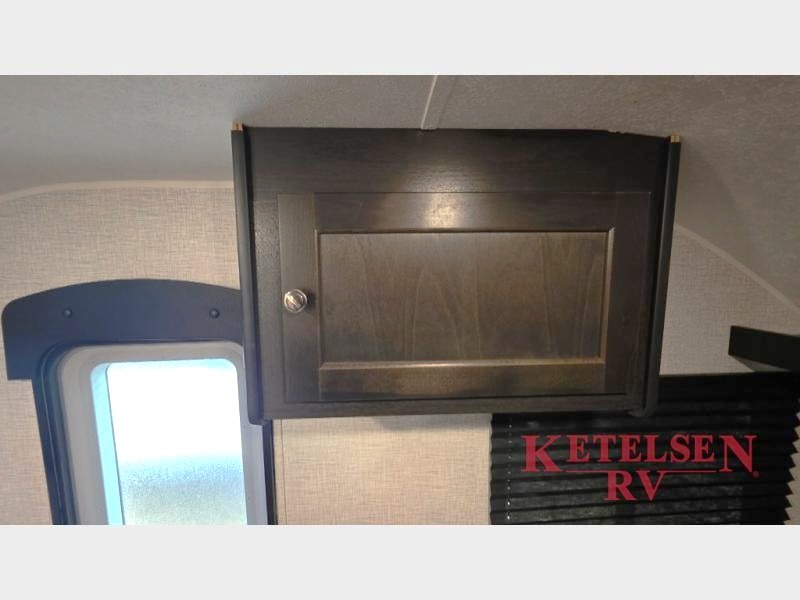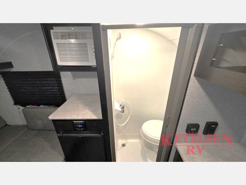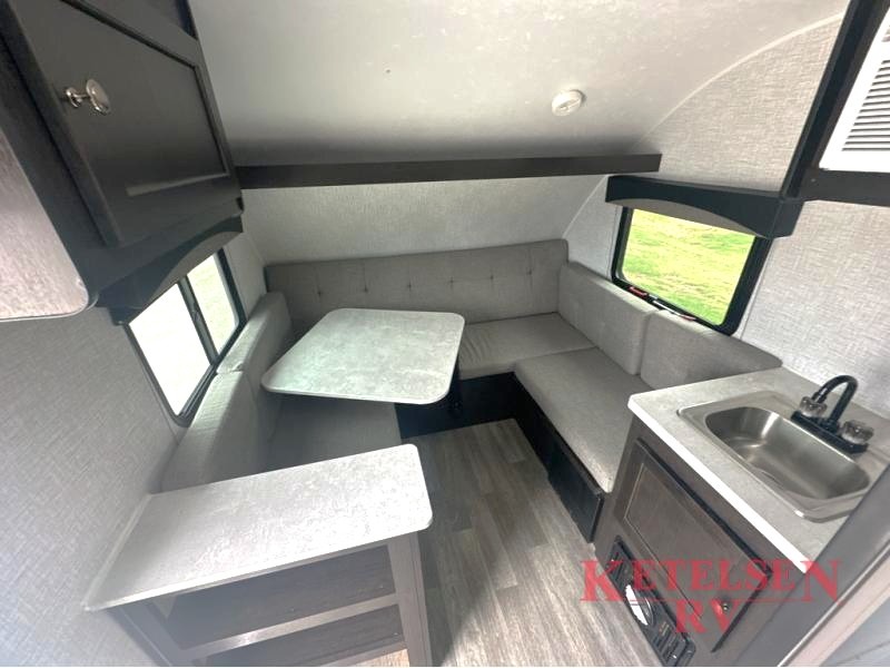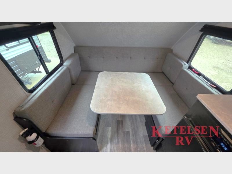 Comfort and convenience is found in this cozy trailer for two! Once you've found your campsite you can unpack your things and freshen up in the wet bath. Whip up a hearty lunch on the two burner cooktop, grab a cold drink from the 12V refrigerator, then dine around the E-Z U-shaped dinette that can also double as your sleeping space. You will find a large shelf and overhead cabinets for all your belongings, and the 5,000 BTU A/C will keep you cool during the hot summer months!