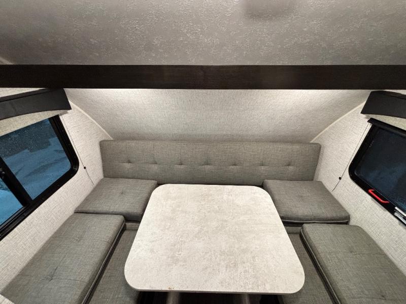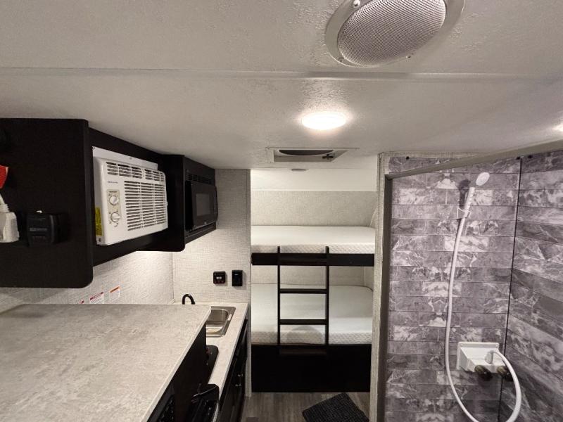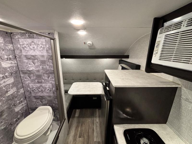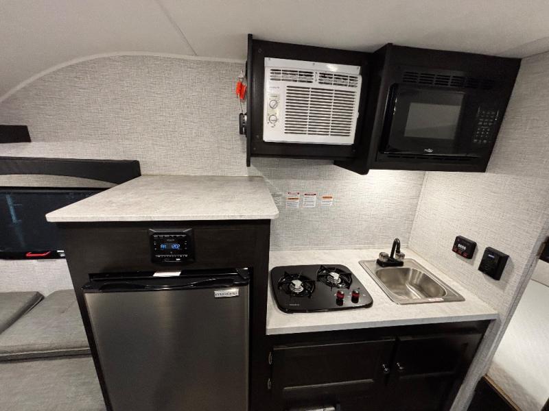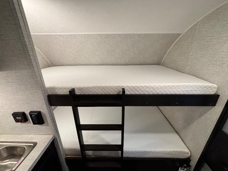 Now you can camp light and bring friends along with you in this teardrop trailer! Your guests or the little ones will love the front bunk beds, while you take the E-Z U-shaped dinette that converts to a queen-size bed. The chef of your group can prepare breakfast on the two burner cooktop, and there is even a sink here to clean up. This model also includes a 12V refrigerator for your perishables and TV prep if you decide to bring along your own TV.