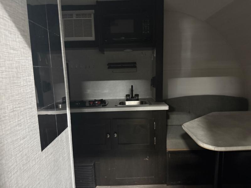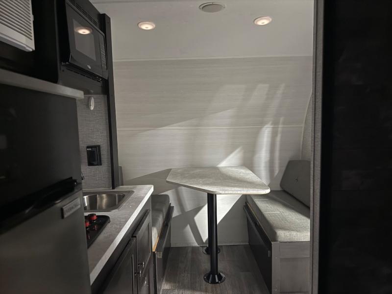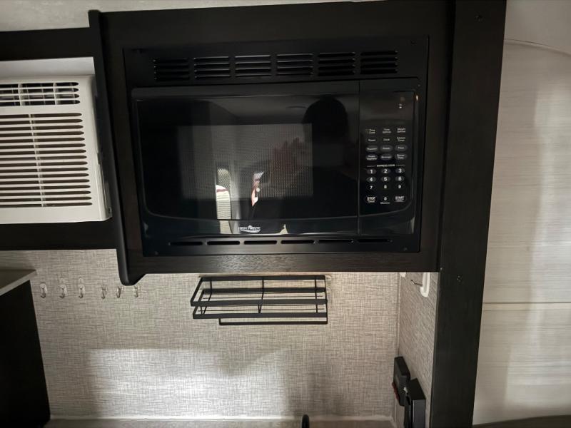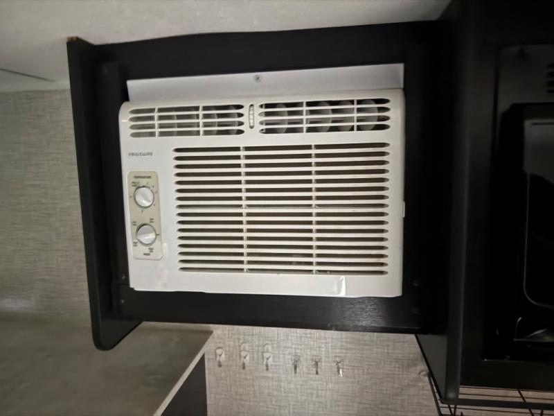 This trailer will feel a little more like home with its queen-size bed! You'll find a convenient wet bath to clean up in each day, plus full kitchen amenities, including a two burner cooktop and a microwave oven. The front 42" dinette will be perfect for dining, playing games, and sleeping an extra guest. And since there is a 5,000 BTU A/C included you may just decide to camp all summer!