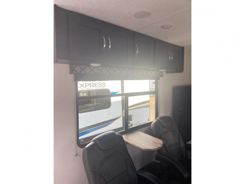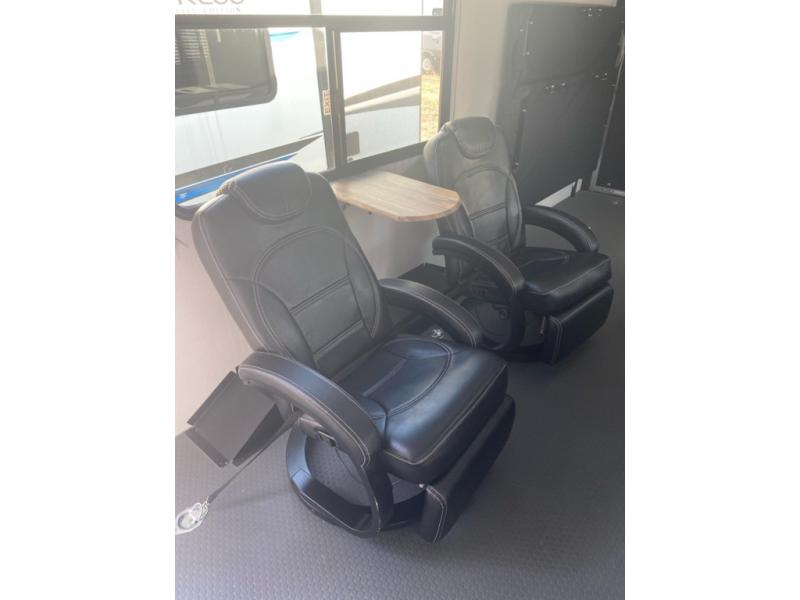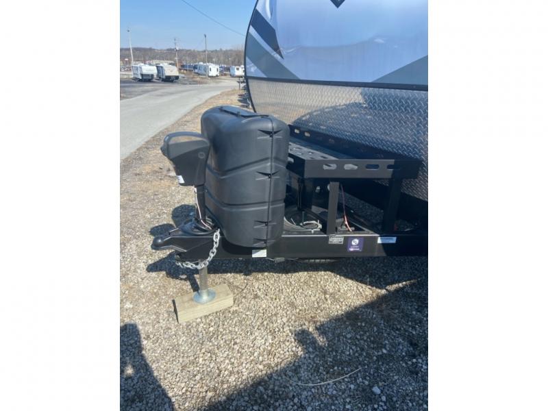 With any Adrenaline toy hauler travel trailer by Coachmen, the required Exterior Value package includes a one-piece Tufllex PVC roof membrane, a fiberglass front cap with rock guard to help against road debris, heavy duty Dexter axles with Nev-R-Adjust brakes and E-Z Lube, and aluminum wheels. Some exterior standards include a heated and enclosed underbelly, a patio ready ramp door with cables for an outdoor above ground space to enjoy, a power tongue jack for easy setup, and an outside spray port to clean off your toys. The interior standards include HD rubberized oil/gas/moisture resistant flooring in the garage area, shaker style cabinets and doors, a rear detachable screen, and USB charging ports in multiple locations for your electronics to mention a few.