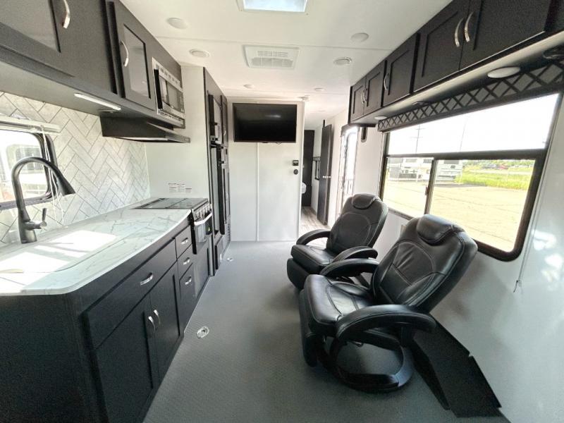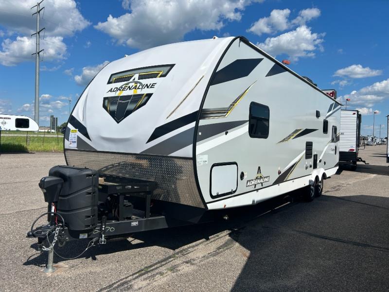 With any Adrenaline toy hauler travel trailer by Coachmen, the required Exterior Value package includes a one-piece Tufllex PVC roof membrane, a fiberglass front cap with rock guard to help against road debris, heavy duty Dexter axles with Nev-R-Adjust brakes and E-Z Lube, and aluminum wheels. Some exterior standards include a heated and enclosed underbelly, a patio ready ramp door with cables for an outdoor above ground space to enjoy, a power tongue jack for easy setup, and an outside spray port to clean off your toys. The interior standards include HD rubberized oil/gas/moisture resistant flooring in the garage area, shaker style cabinets and doors, a rear detachable screen, and USB charging ports in multiple locations for your electronics to mention a few.