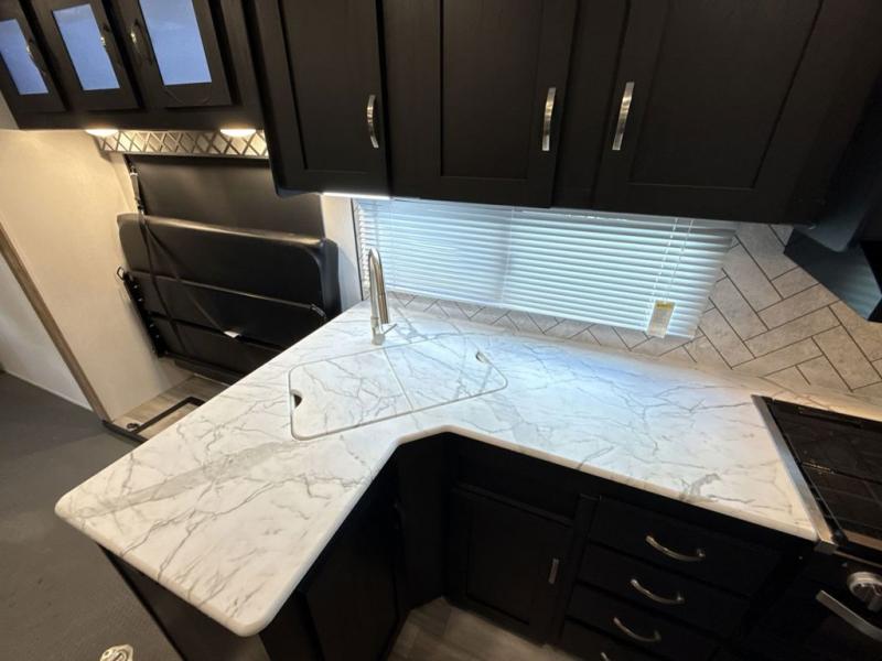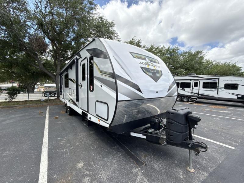 With any Adrenaline toy hauler travel trailer by Coachmen, the required Exterior Value package includes a one-piece Tufllex PVC roof membrane, a fiberglass front cap with rock guard to help against road debris, heavy duty Dexter axles with Nev-R-Adjust brakes and E-Z Lube, and aluminum wheels. Some exterior standards include a heated and enclosed underbelly, a patio ready ramp door with cables for an outdoor above ground space to enjoy, a power tongue jack for easy setup, and an outside spray port to clean off your toys. The interior standards include HD rubberized oil/gas/moisture resistant flooring in the garage area, shaker style cabinets and doors, a rear detachable screen, and USB charging ports in multiple locations for your electronics to mention a few.