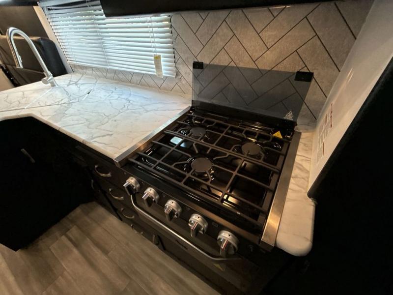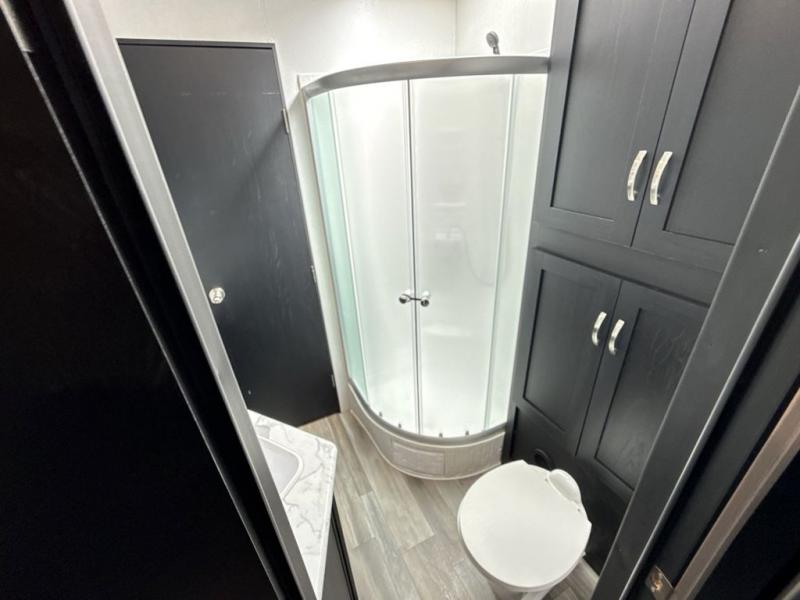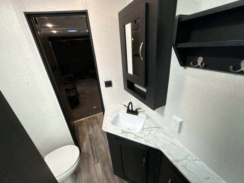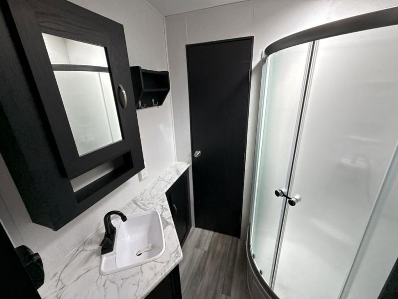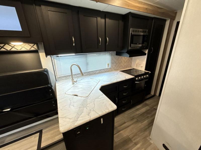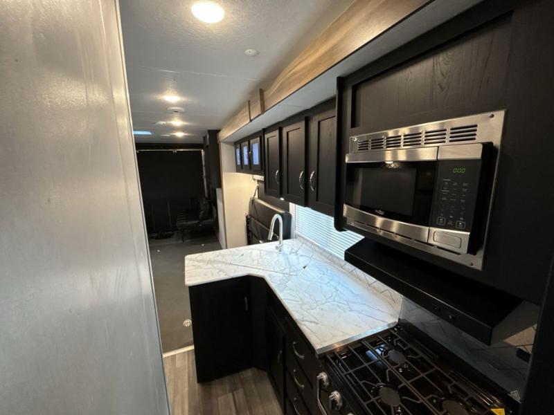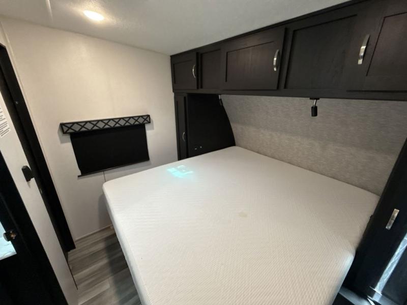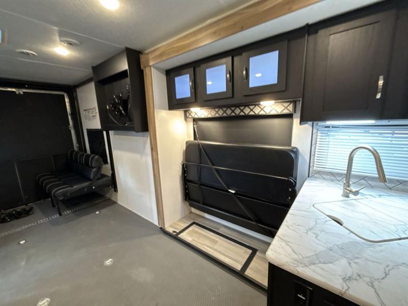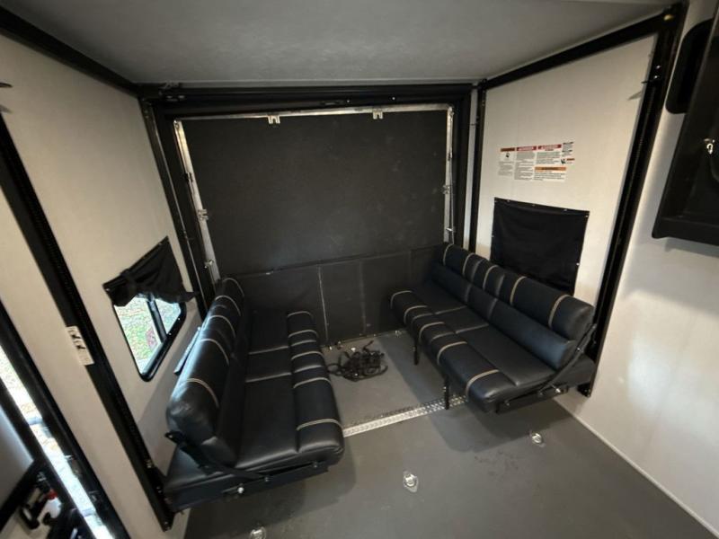 Looking for a spacious travel trailer that you can carry your toys to and from the off-road park and stay overnight in comfort? Well this might just fit the bill! You will appreciate the 15' 7" cargo space for all your toys, and the large slide out with a flip-up slide floor door will provide extra interior space. The chef of the family or group can prepare dinner on the three burner cooktop or use the microwave, and the double entry bath includes plenty of counter space that will come in handy when you're getting ready each day. This trailer also includes dual entry doors: one into the garage area and one into the front master bedroom with a king bed for your convenience. You will also find a rear pull down screen, pull-down roller night shades to be able to sleep in late, and a solar package to help you stay off-grid.