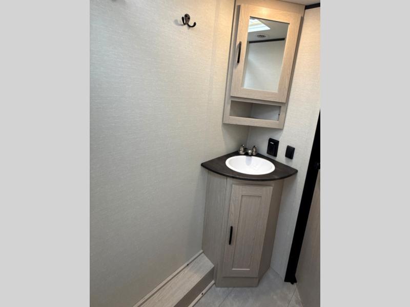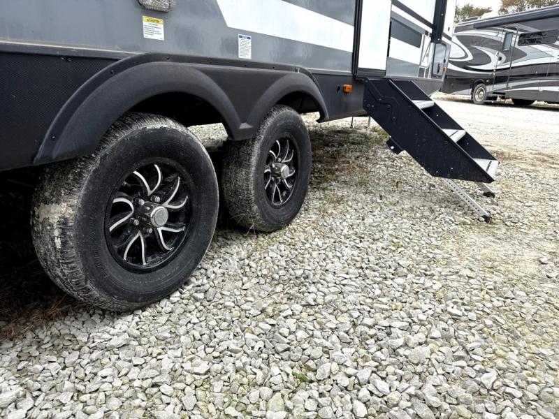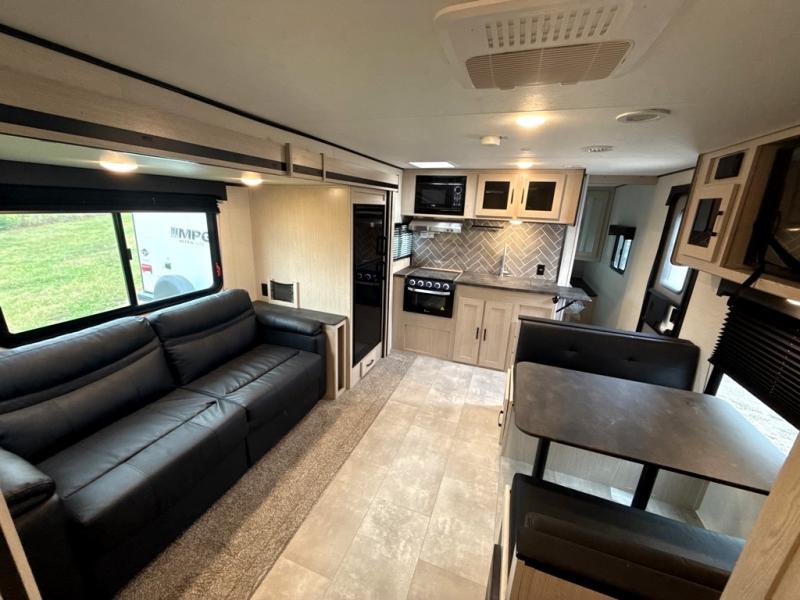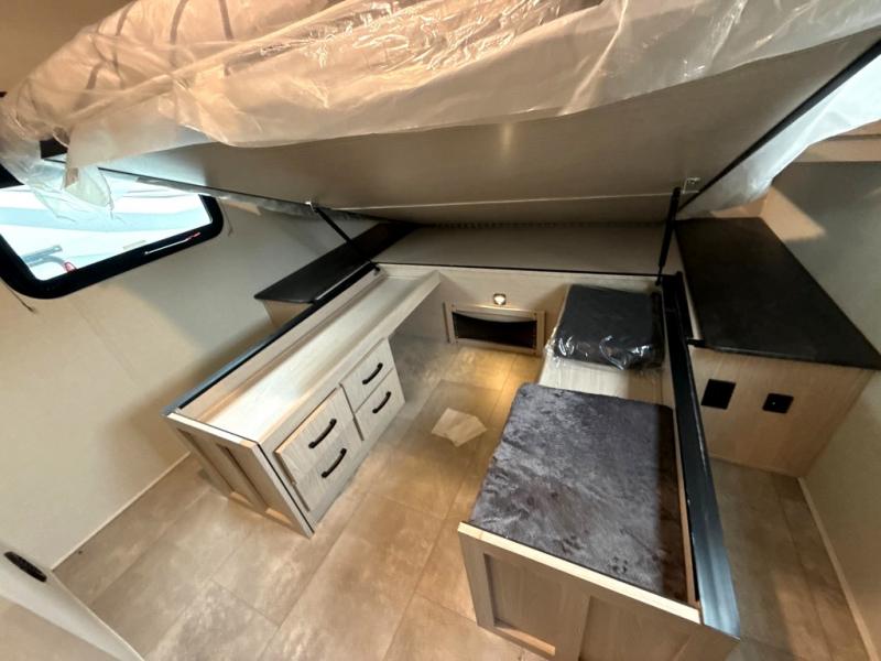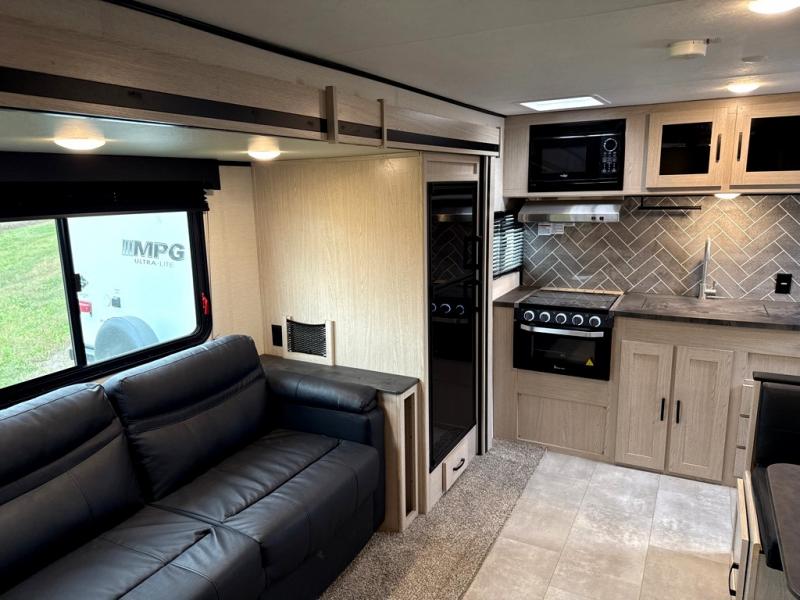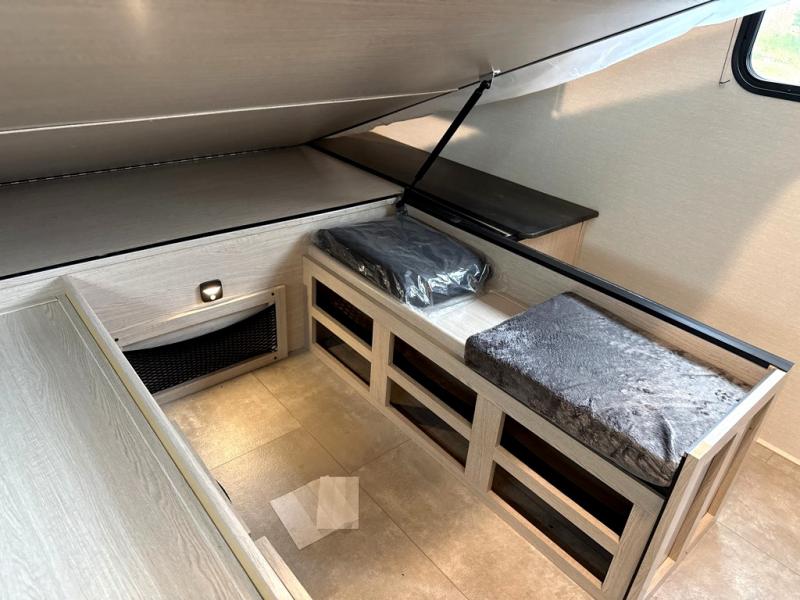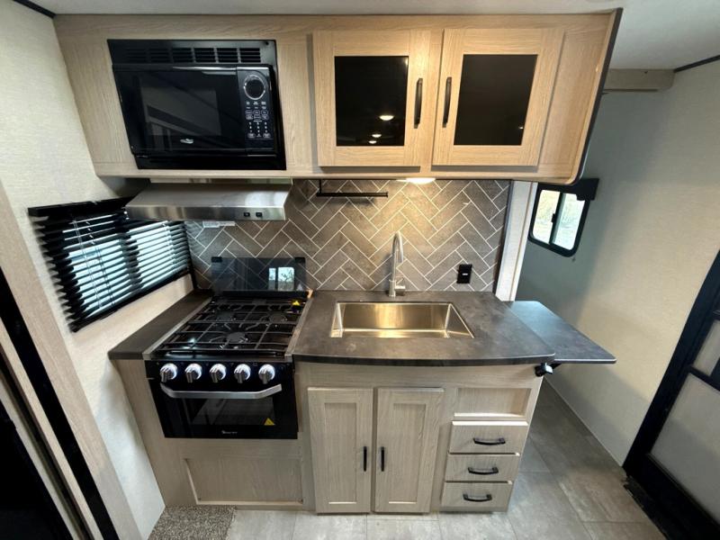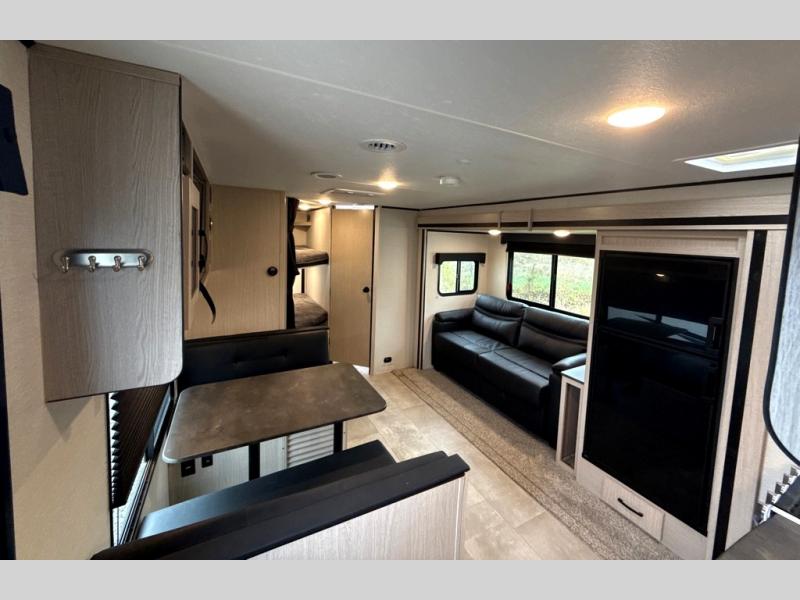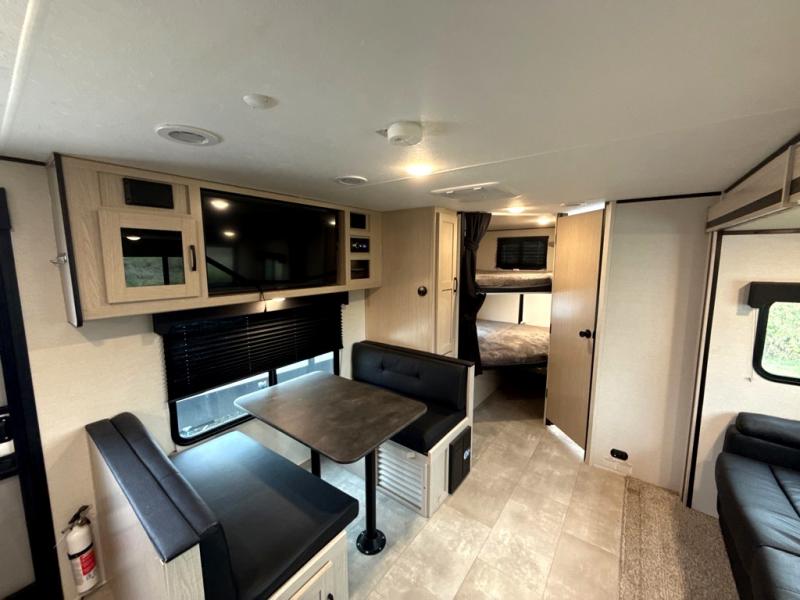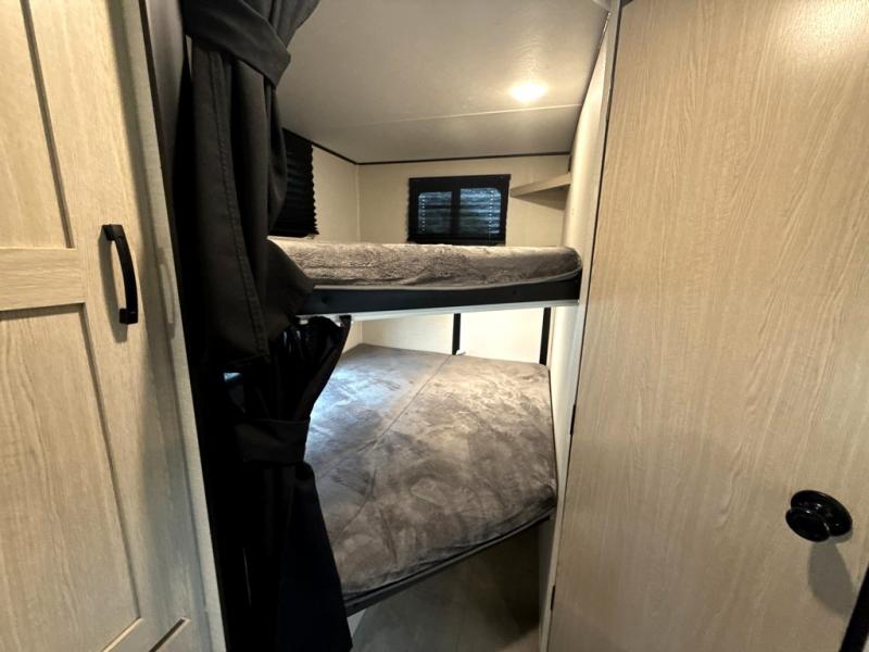 You just can't go wrong with this travel trailer in tow! You can sleep eight people thanks to the double-size bunks, the queen bed with super storage, plus the sofa and booth dinette. Your crew will love to spend time outdoors since there is a 16' power awning with LED lights, an exterior camp kitchen, plus outside speakers. If the weather isn't cooperating, you can prepare your meals on the three burner cooktop or in the microwave oven, and there is a countertop extension for more prep space. And you may just choose to make it a movie night with the 40" TV across from the sofa!