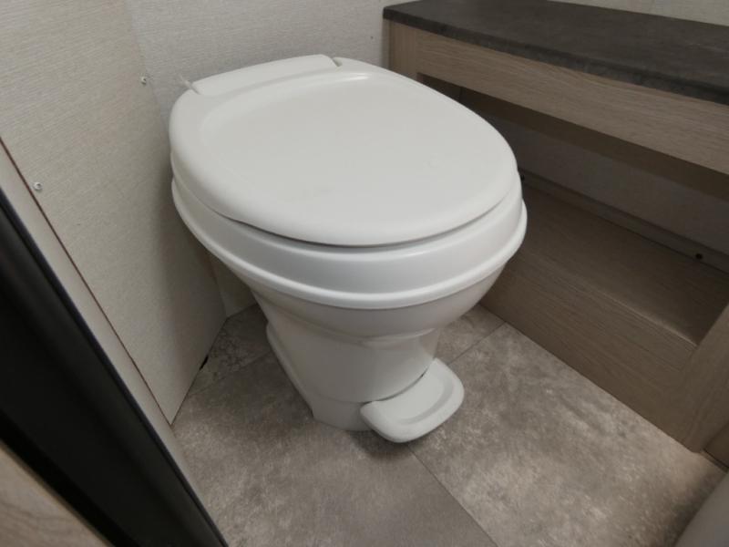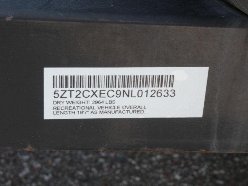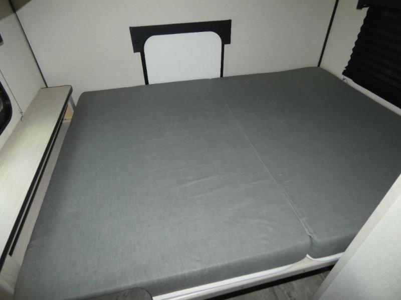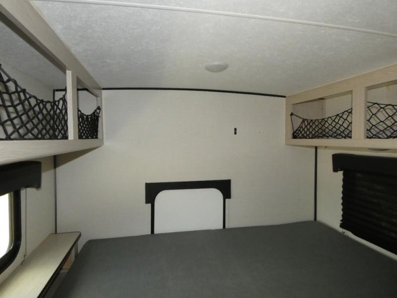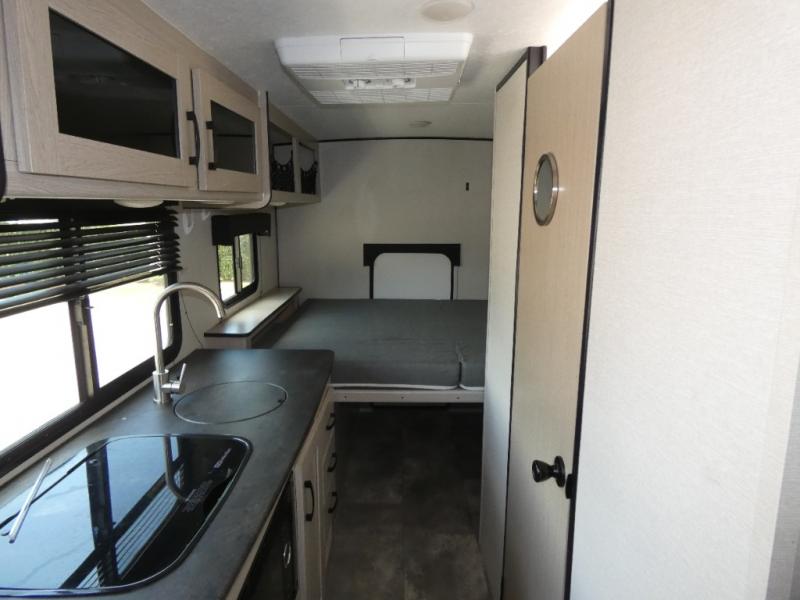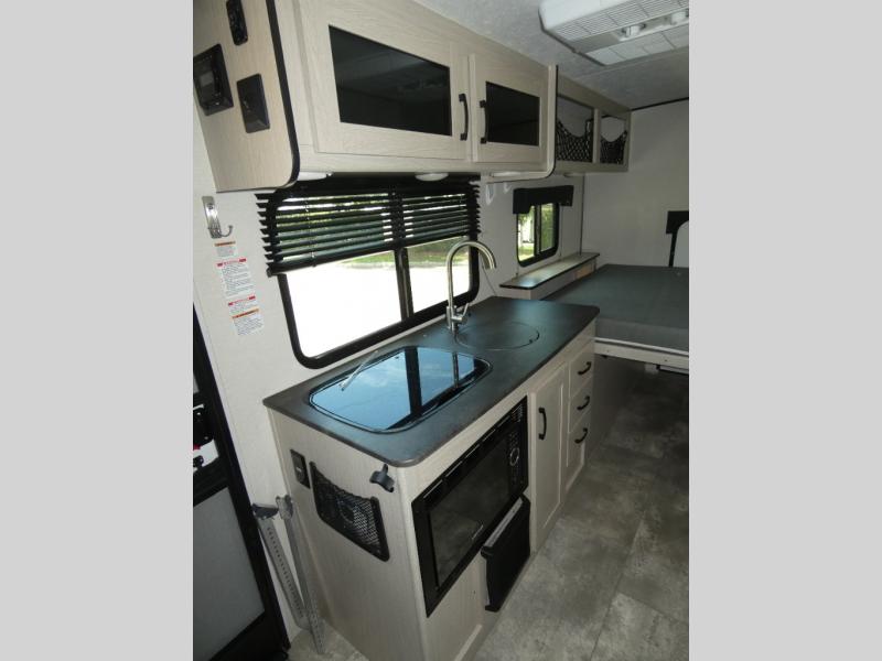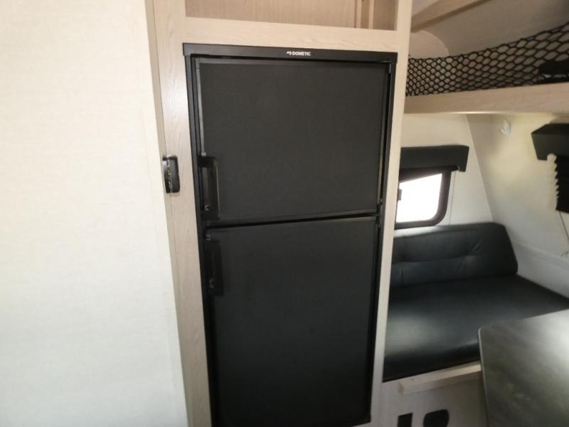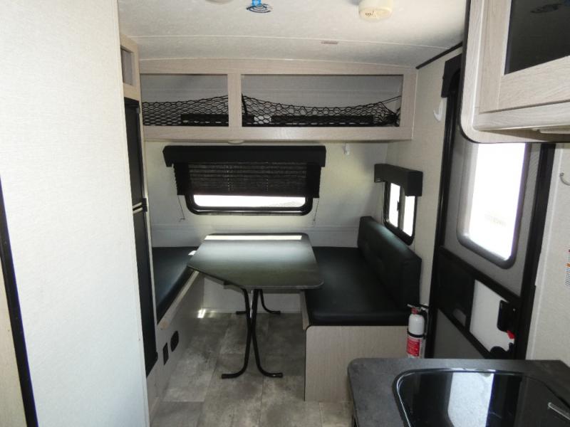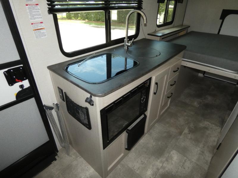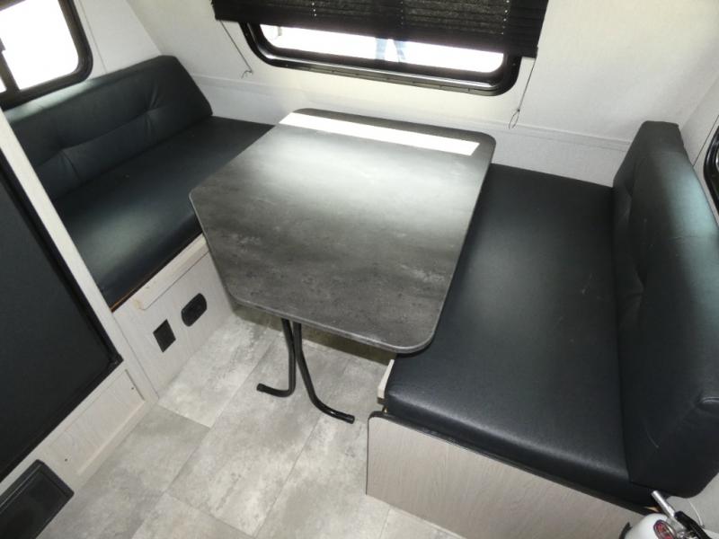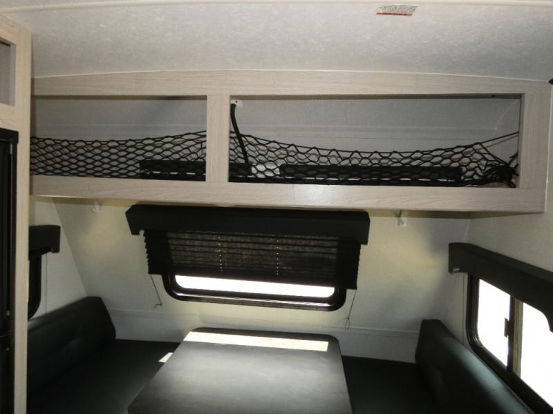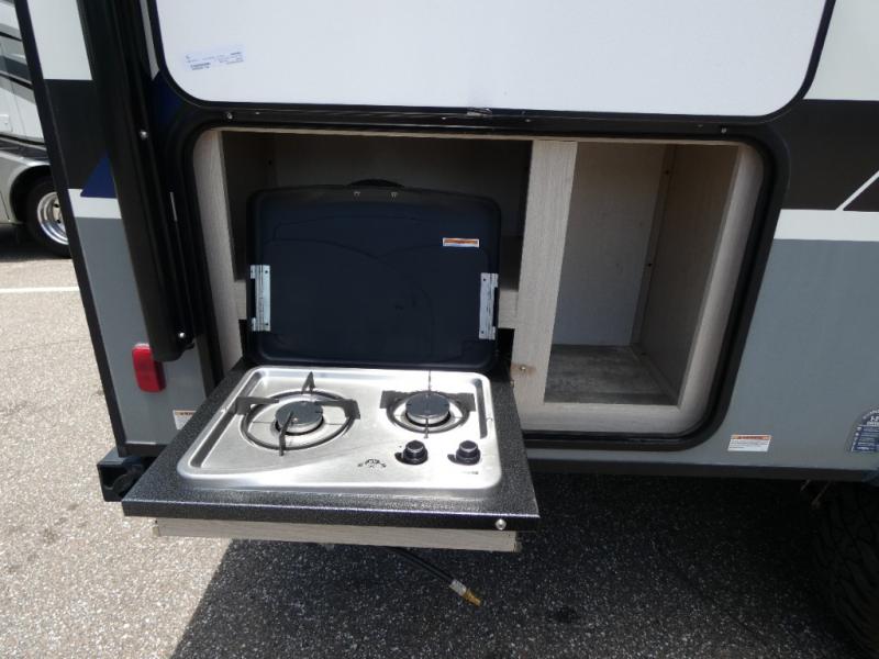When you are ready to camp, this trailer is easy to load and tow to your favorite sites. The rear storage door allows you to carry items inside the trailer and you can leave the lifting section securely up or down depending on the space you need. There is more storage along the exterior, and you will find overhead cabinets inside, linen space in the full bathroom and your cold food can be placed in the 6 cu. ft. refrigerator. The cook will have a two burner cooktop plus microwave inside, and a camp kitchen outside to keep everyone fed. Plus you can dine at the booth dinette which also provides sleeping space.