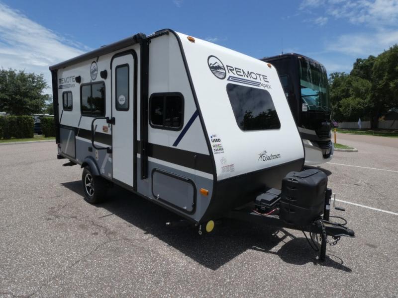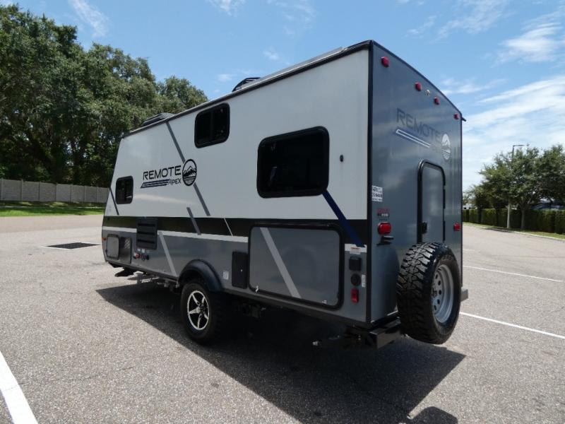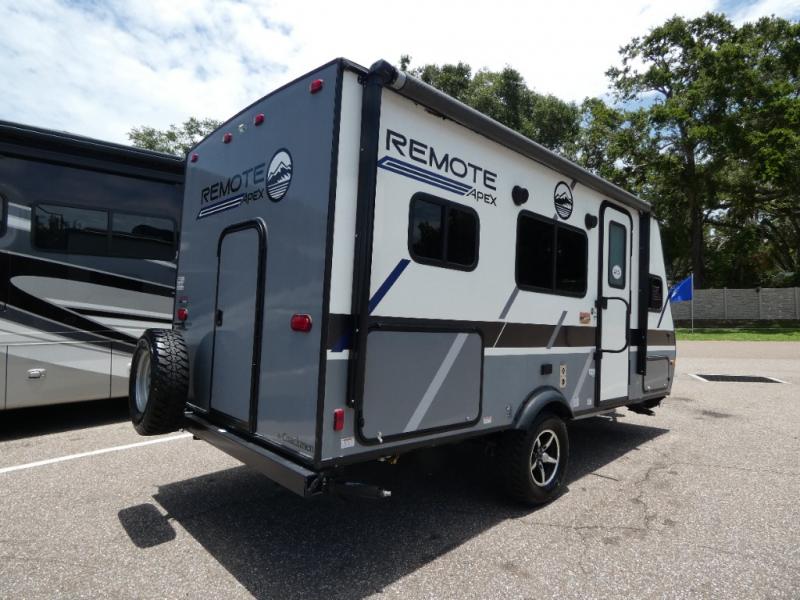 Leave the world behind you in the Apex Remote travel trailer by Coachmen RV. You will find the same comfort, convenience, and sturdy construction on this model just as you do with the Apex Nano models. There are vacuum-bonded Azdel fiberglass walls, an I-beam chassis, plus a powder coated frame that is corrosion resistant. This 7' wide travel trailer is easily towable and includes the Remote Wilderness Package with 15" all-terrain tires, a front bike rack, 12V heat pads, and much more. You will also enjoy an AM/FM stereo with Bluetooth, a hot and cold outside shower, four stabilizer jacks, plus many more amenities to make camping easier than ever!