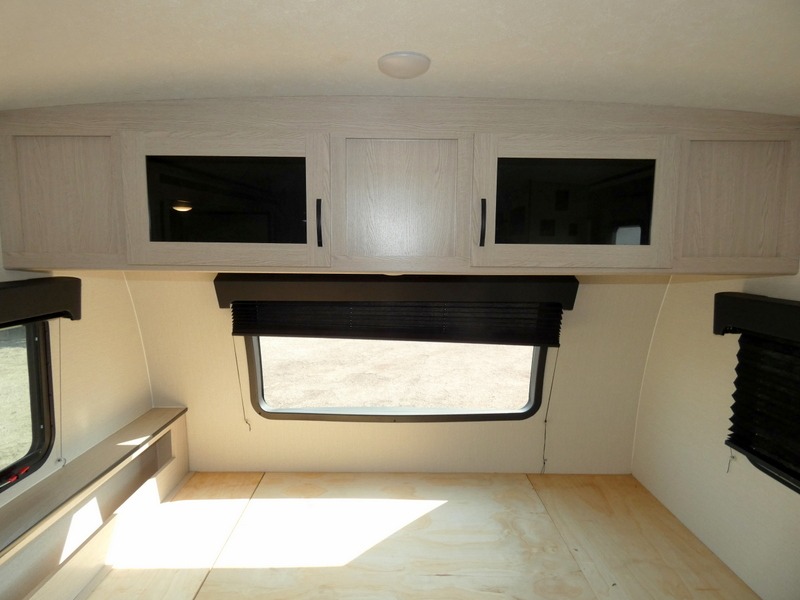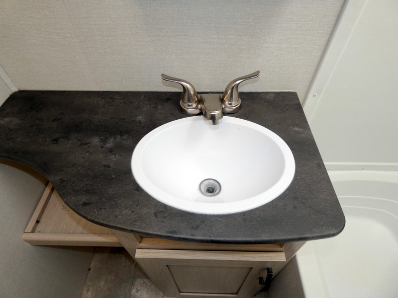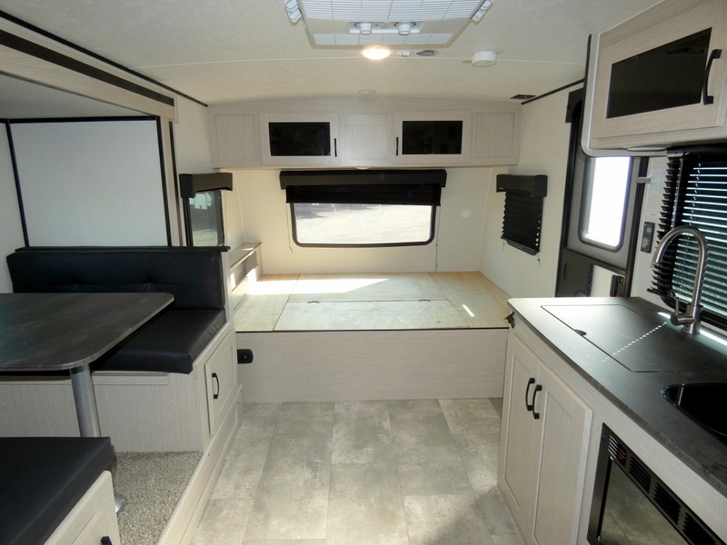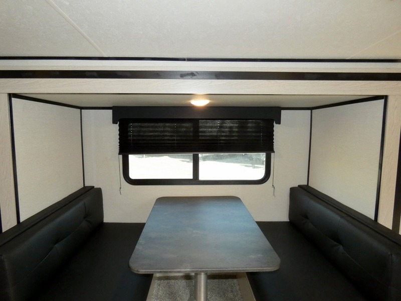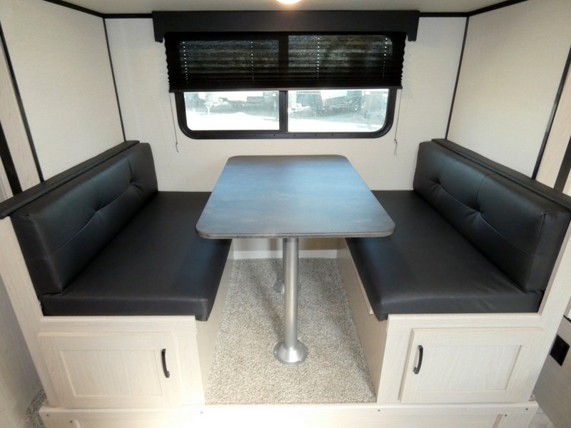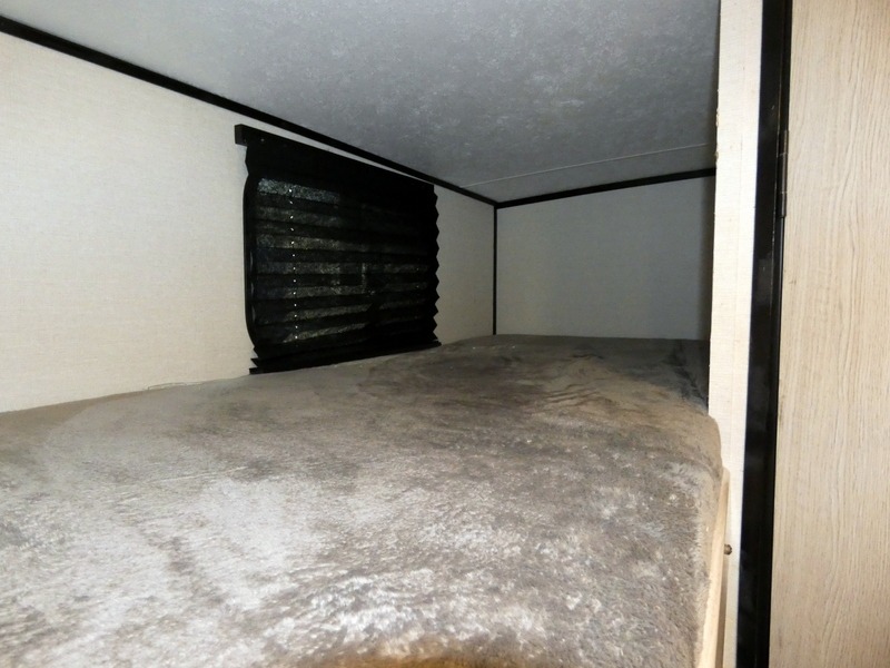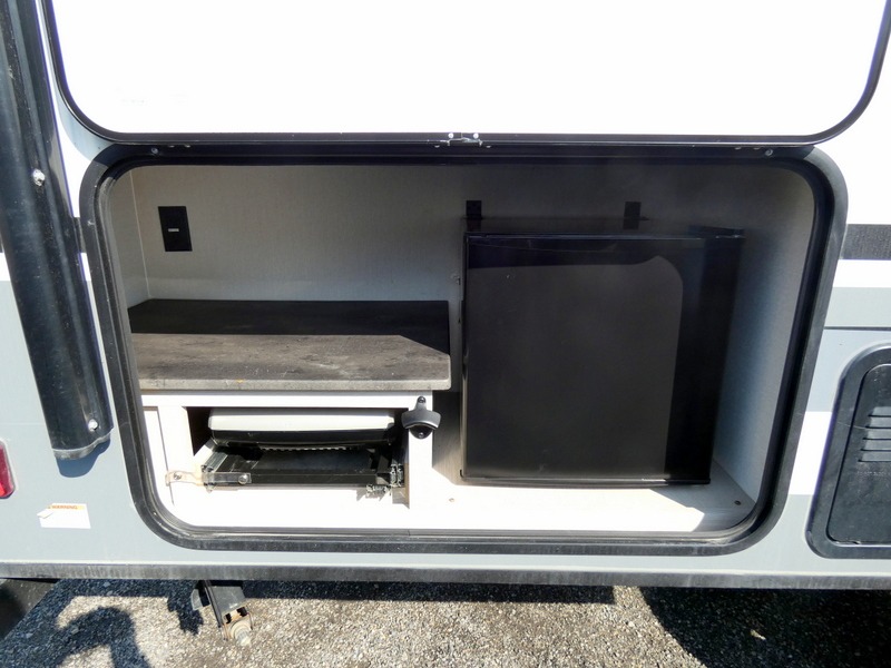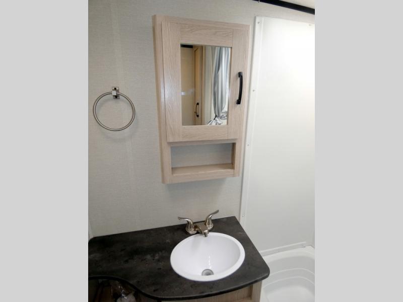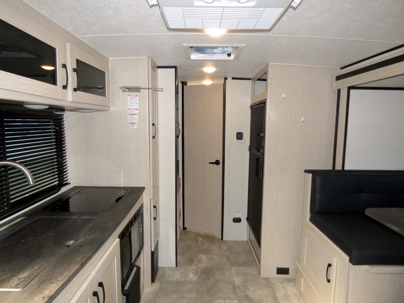 You will have more walking around space with a booth dinette slide in this travel trailer! The chef will love cooking indoors with the two burner cooktop, microwave, and 6 cu. ft. gas/electric refrigerator, as well as outdoors with the exterior camp kitchen. Start each morning feeling clean and refreshed after sleeping on the front queen bed with a headboard and showering in the tub/shower inside the rear corner bathroom, plus the bathroom has a wardrobe to keep your towels close. The kids will love sleeping on the rear corner set of 30" x 74" bunk beds too!