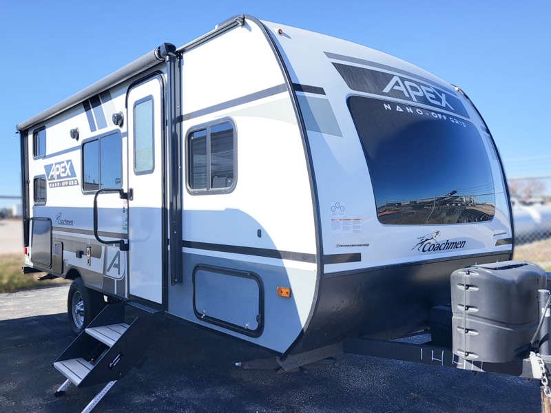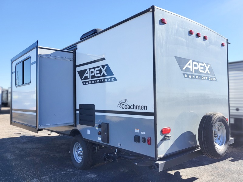 You will find comfort, convenience, and a sturdy construction with each of these Coachmen RV Apex Nano travel trailers! They are held together with an aluma-cage construction, vacuum-bonded Azdel fiberglass walls, an I-beam chassis, and a roof membrane with Dicor Crossflex, plus the powder coated frame is corrosion resistant. The Dexter E-Z lube axles and nitrogen filled radial tires will help you arrive safely. The mandatory Nano package comes with many features to make camp life better like magnetic baggage door catches, outside speakers, a digital TV antenna with cable hook-ups and WiFi capability, and a hot/cold outside shower to keep the dirt outside where it belongs. Come find the perfect model that fits your needs today!