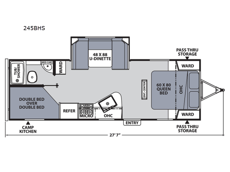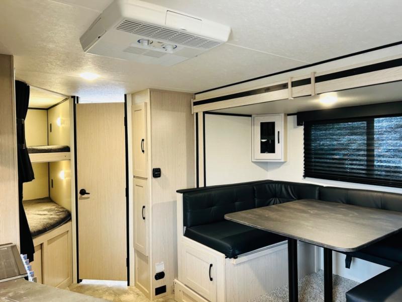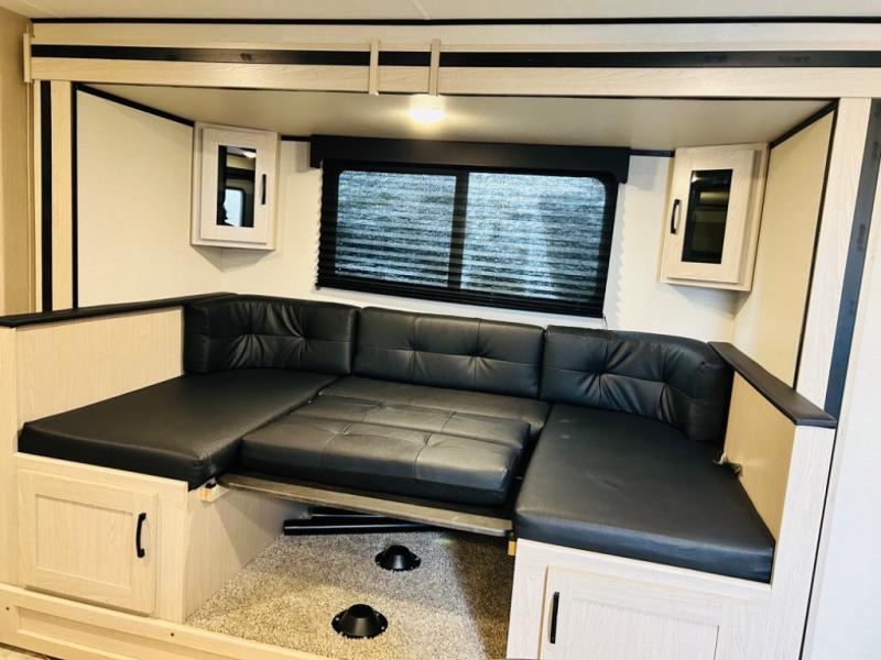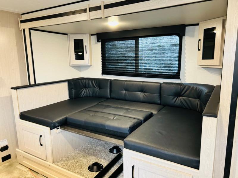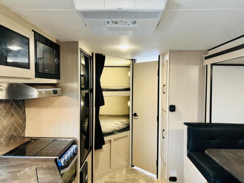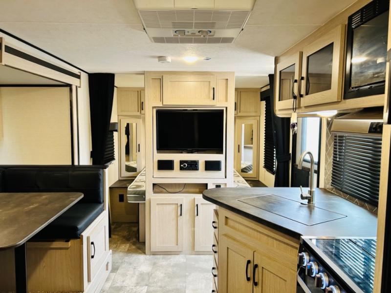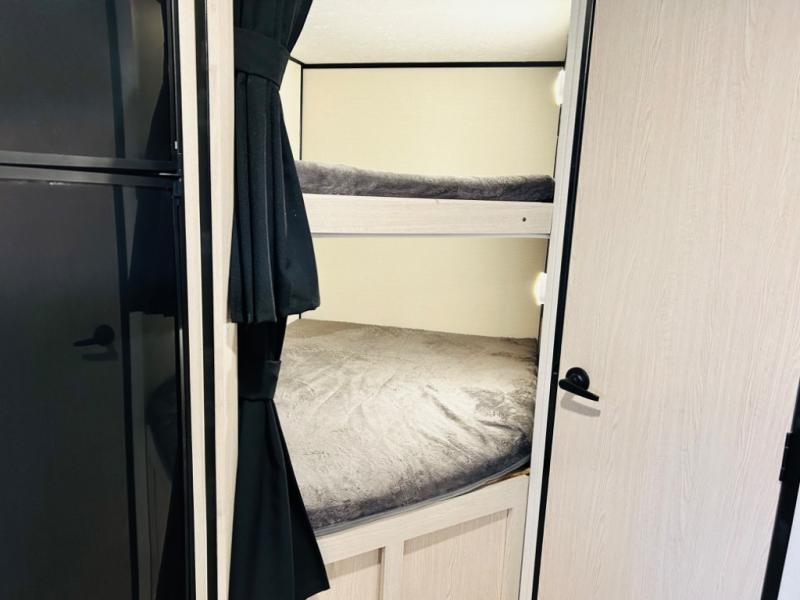 Double-size bunks make any camping trip fun, so pack your bags and head out! When you arrive at the campground you can make a quick lunch on the outdoor camp kitchen, and unload the exterior pass-through storage. A fully-equipped kitchen indoors includes a three burner cooktop, a microwave oven, plus a stainless steel sink with a flush-mount cover for added counter space. You will love having your own full bath on board, as well as a front bedroom with a queen bed and dual wardrobes.