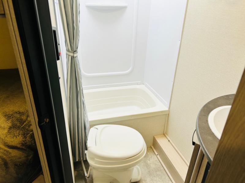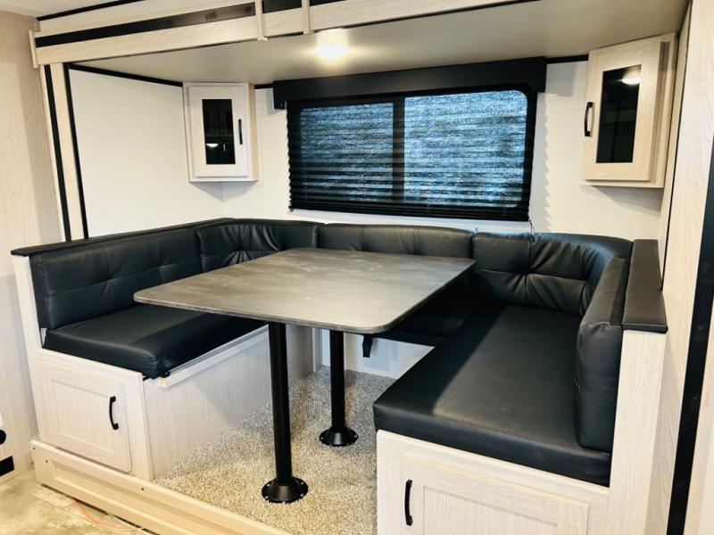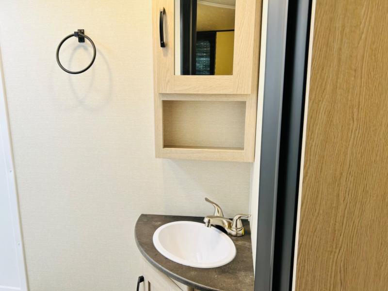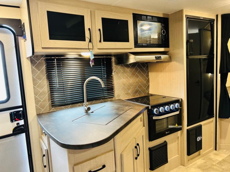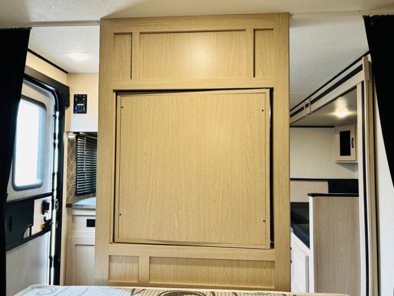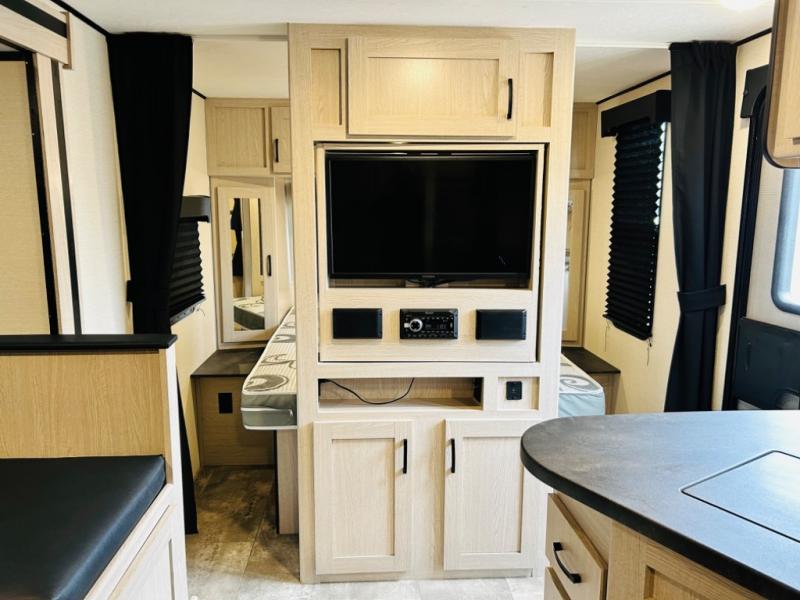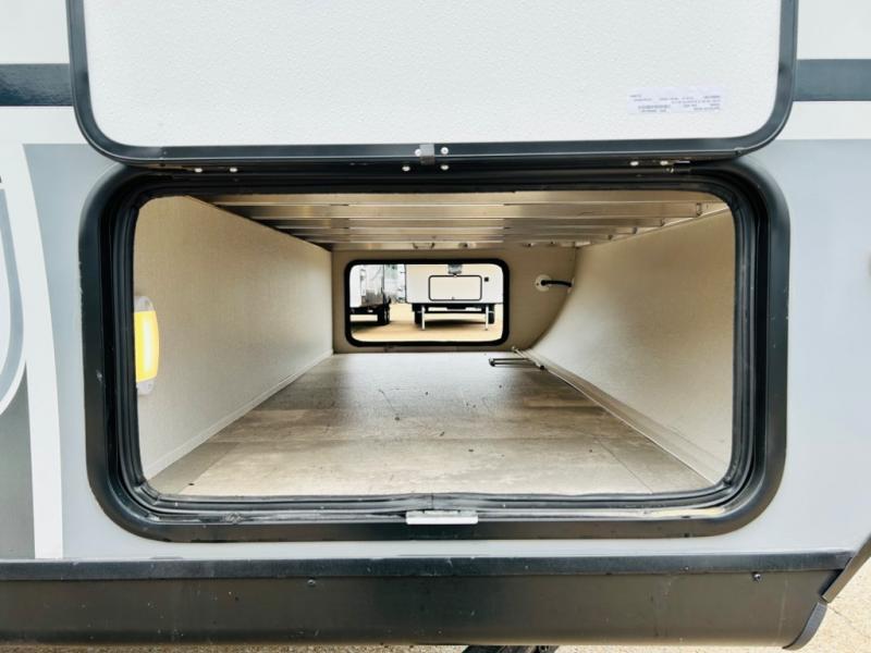 Double-size bunks make any camping trip fun, so pack your bags and head out! When you arrive at the campground you can make a quick lunch on the outdoor camp kitchen, and unload the exterior pass-through storage. A fully-equipped kitchen indoors includes a three burner cooktop, a microwave oven, plus a stainless steel sink with a flush-mount cover for added counter space. You will love having your own full bath on board, as well as a front bedroom with a queen bed and dual wardrobes.