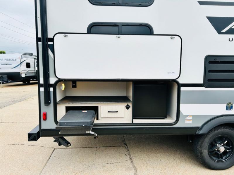 Lightweight living and camping is found with the Apex Ultra-Lite travel trailers by Coachmen. These eco-friendly units are made to last thanks to the Azdel composite sidewalls, the laminated aluminum floor, and the vacuum-bonded laminated crowned roof. Lippert axles and nitrogen filled radial tires make towing easier than ever, plus there is a friction hinge entrance door, a 100-watt solar panel with a 10 Amp control charger, and slam latch baggage door catches for easy unloading. Some of the interior comforts you'll fall in love with are the one-piece seamless edge countertops, the hard valances with night shades throughout, the matte black hardware, and the residential comforter. The Apex Ultra-Lite trailers also include USB ports, a digital TV antenna with cable hook-ups and Wi-Fi capability, and an AM/FM stereo with Bluetooth to ensure you'll never go bored on rainy camp days!