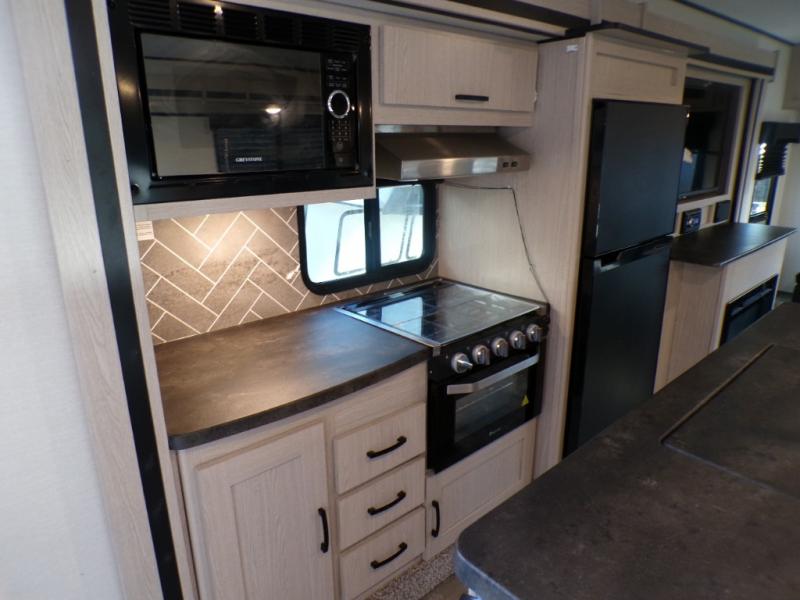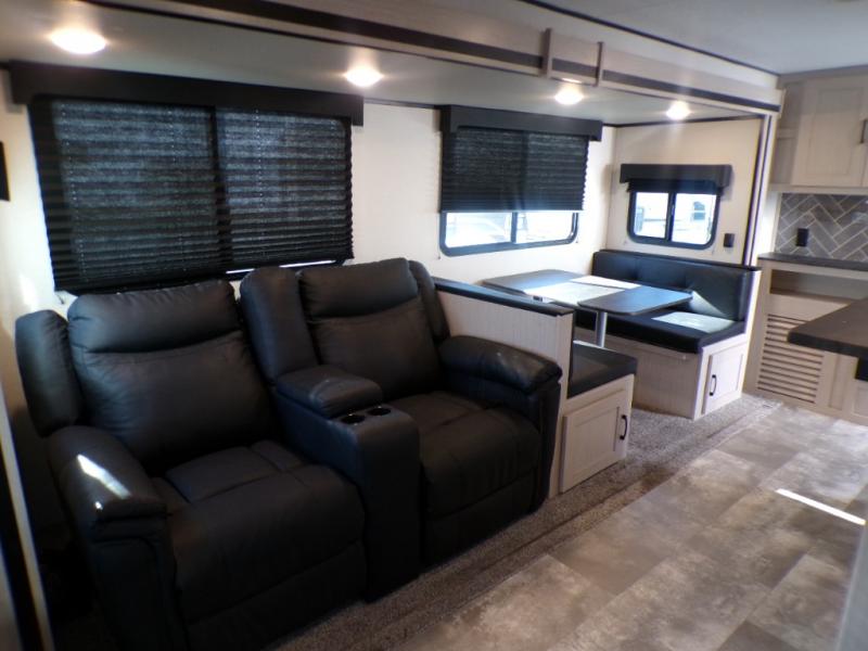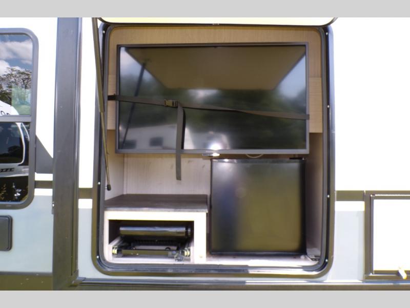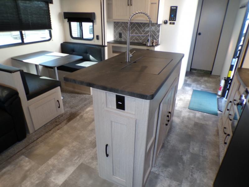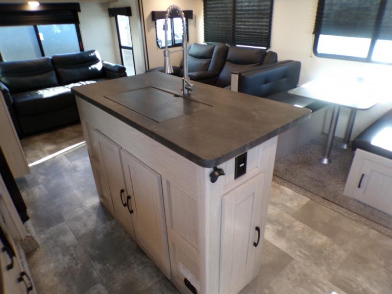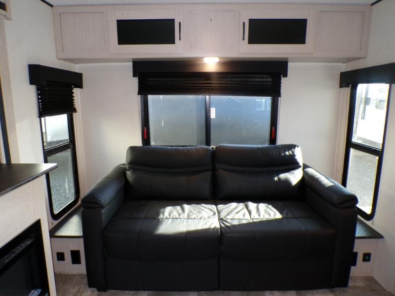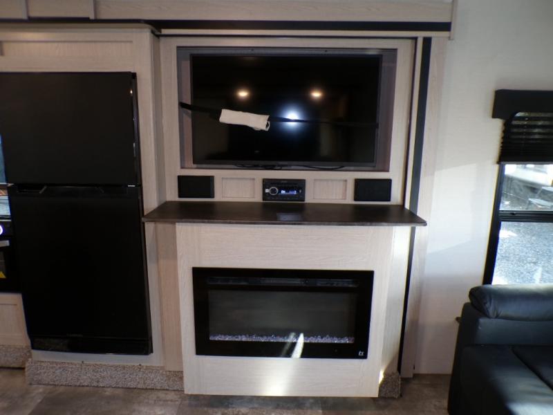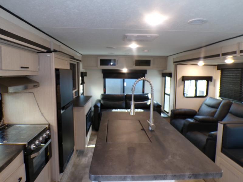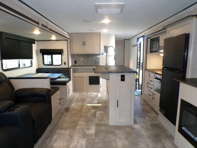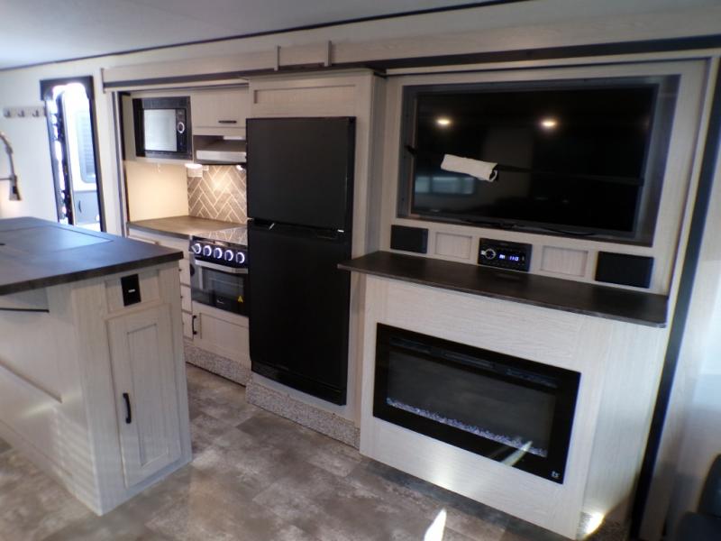 If you like to camp with a more at-home feel then you're going to love this travel trailer. There are dual opposing slides in the living area/kitchen for more interior space, and you can relax on the dual lounge chairs across from the entertainment center and fireplace. The kitchen includes a kitchen island the chef is sure to love, along with a three burner cooktop, a hutch, and an 8 cu. ft. 12V refrigerator. You will feel right at home in the front private bedroom with a queen bed and dual wardrobes for your clothes. This model also includes an outdoor camp kitchen with an outdoor TV; you can't beat that!