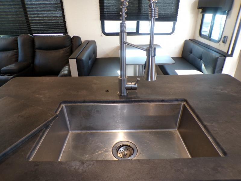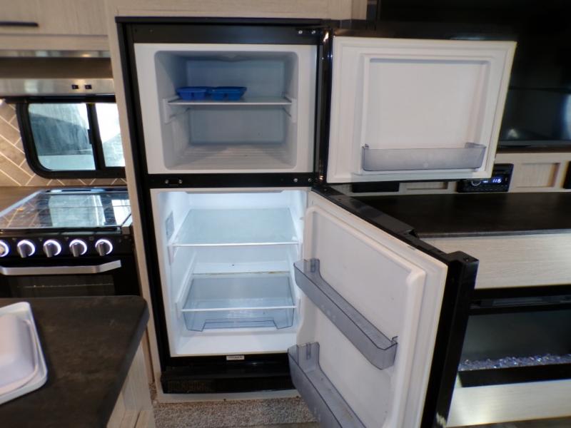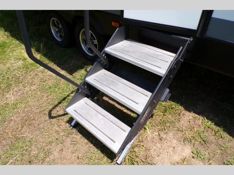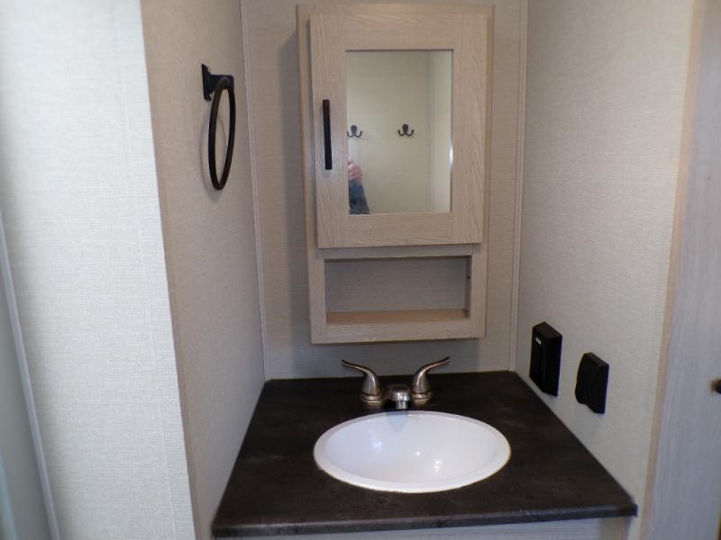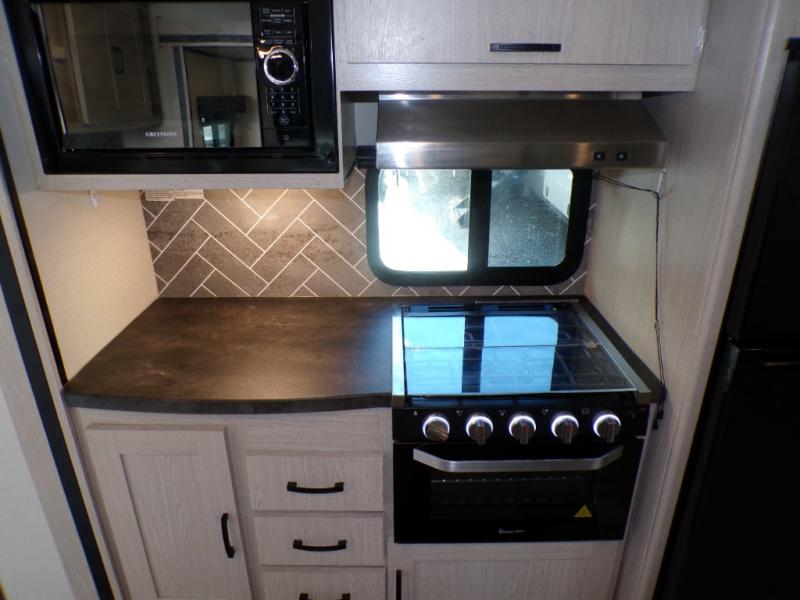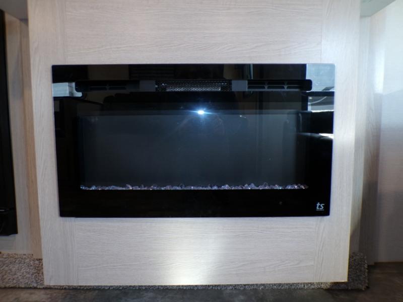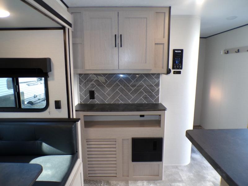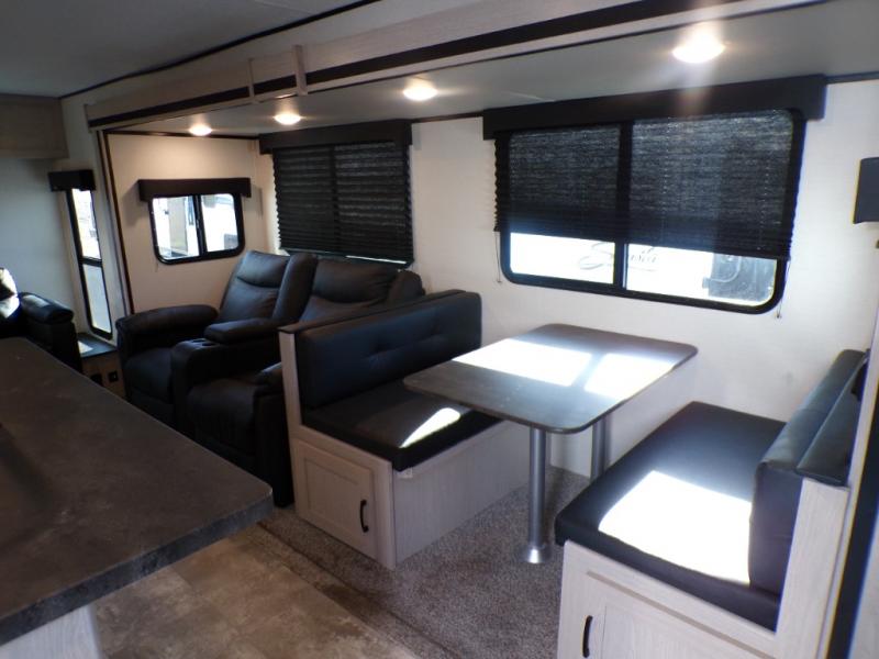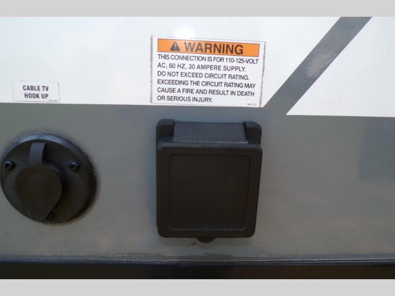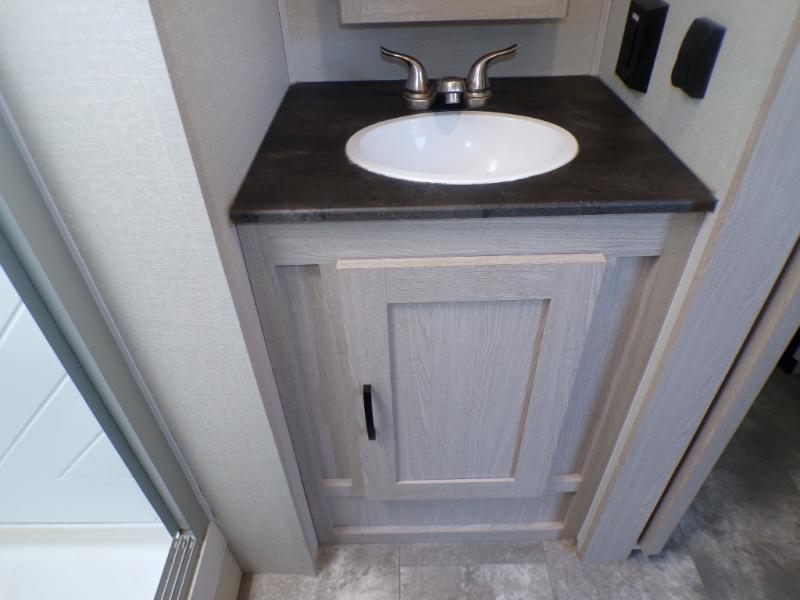 If you like to camp with a more at-home feel then you're going to love this travel trailer. There are dual opposing slides in the living area/kitchen for more interior space, and you can relax on the dual lounge chairs across from the entertainment center and fireplace. The kitchen includes a kitchen island the chef is sure to love, along with a three burner cooktop, a hutch, and an 8 cu. ft. 12V refrigerator. You will feel right at home in the front private bedroom with a queen bed and dual wardrobes for your clothes. This model also includes an outdoor camp kitchen with an outdoor TV; you can't beat that!