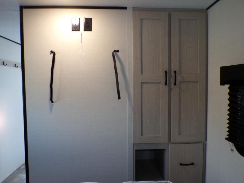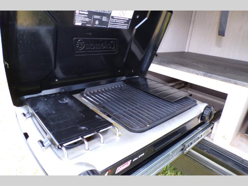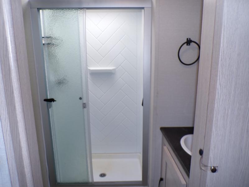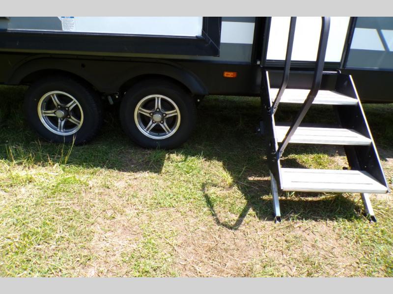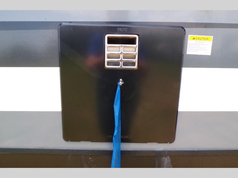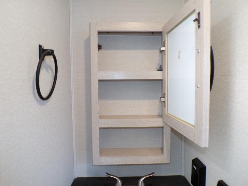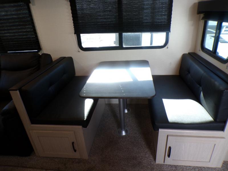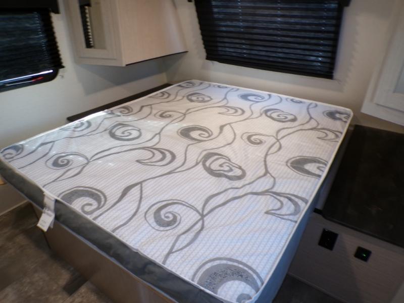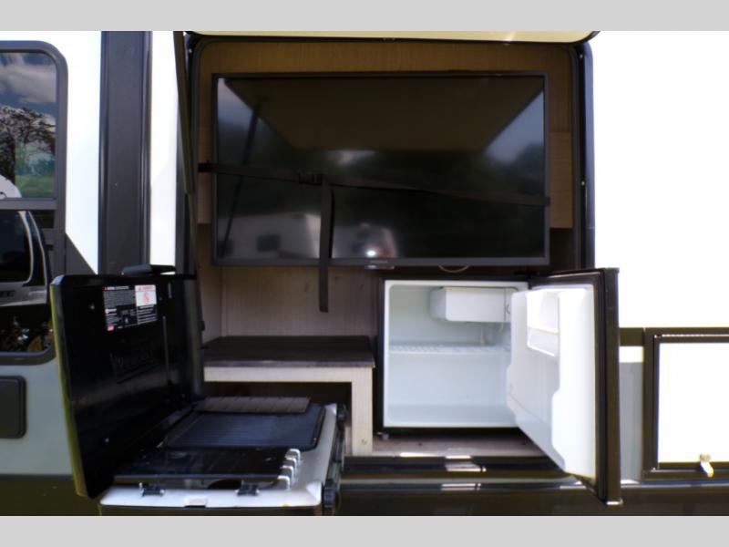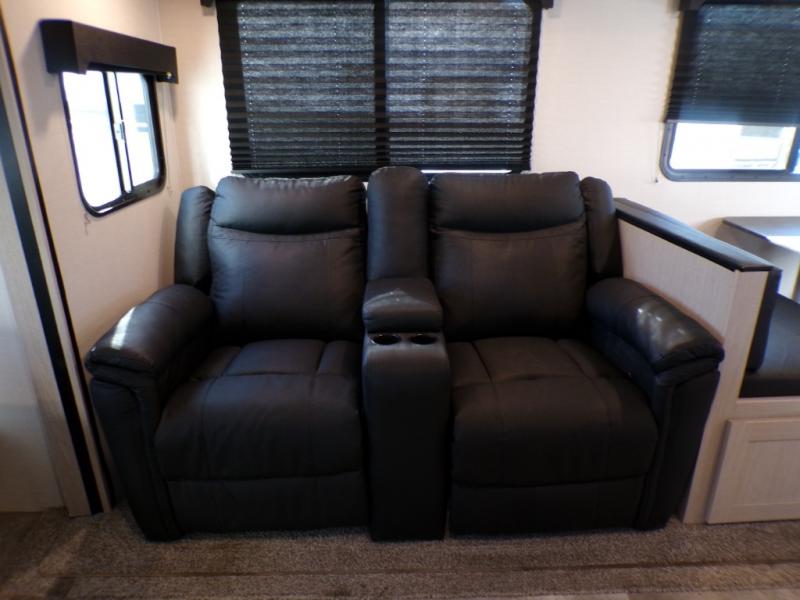 If you like to camp with a more at-home feel then you're going to love this travel trailer. There are dual opposing slides in the living area/kitchen for more interior space, and you can relax on the dual lounge chairs across from the entertainment center and fireplace. The kitchen includes a kitchen island the chef is sure to love, along with a three burner cooktop, a hutch, and an 8 cu. ft. 12V refrigerator. You will feel right at home in the front private bedroom with a queen bed and dual wardrobes for your clothes. This model also includes an outdoor camp kitchen with an outdoor TV; you can't beat that!