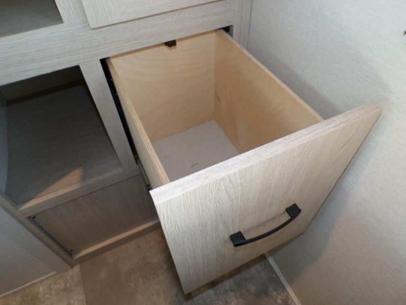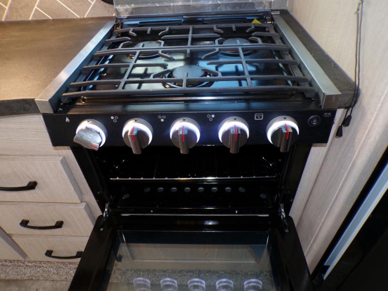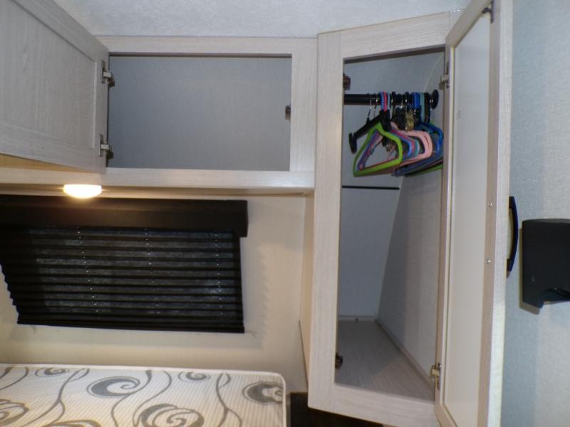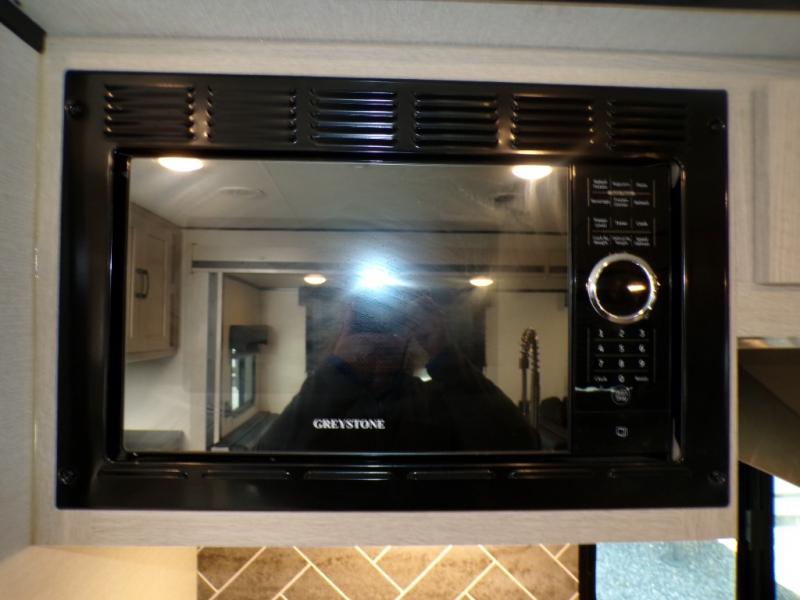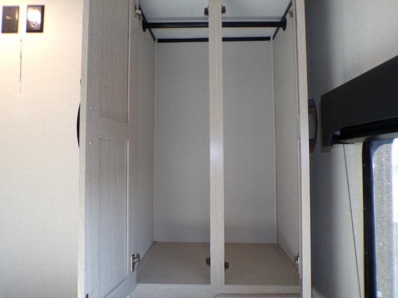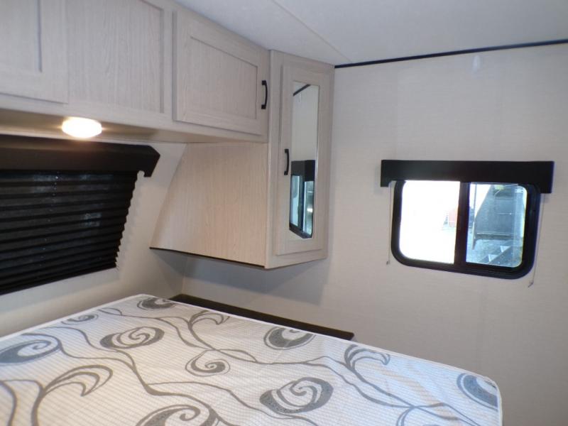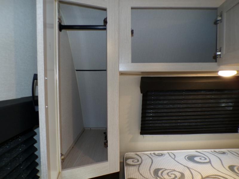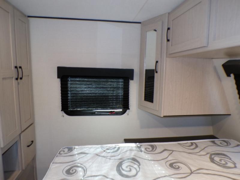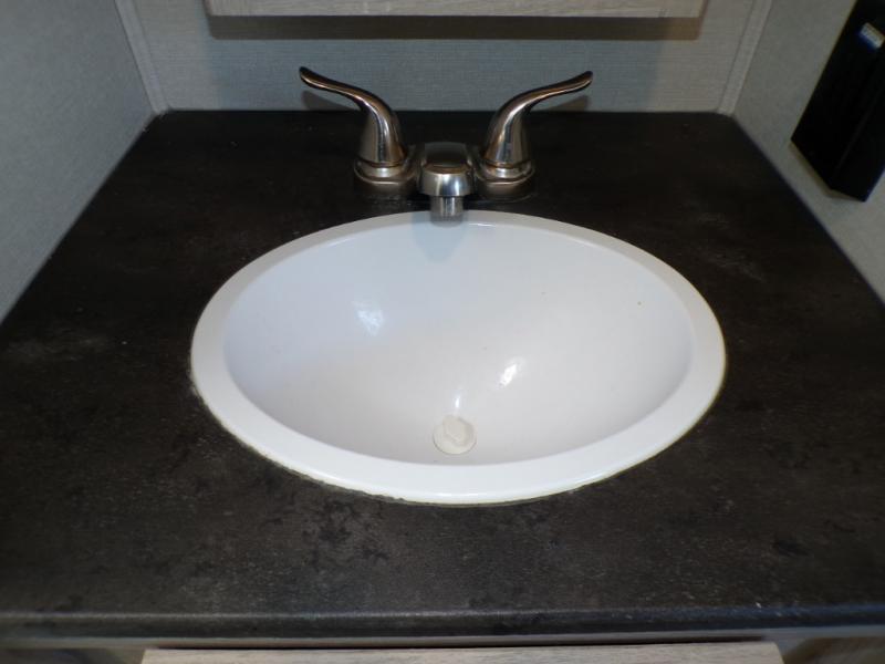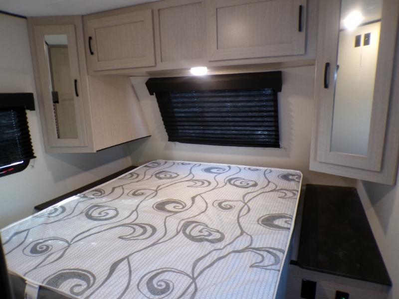 If you like to camp with a more at-home feel then you're going to love this travel trailer. There are dual opposing slides in the living area/kitchen for more interior space, and you can relax on the dual lounge chairs across from the entertainment center and fireplace. The kitchen includes a kitchen island the chef is sure to love, along with a three burner cooktop, a hutch, and an 8 cu. ft. 12V refrigerator. You will feel right at home in the front private bedroom with a queen bed and dual wardrobes for your clothes. This model also includes an outdoor camp kitchen with an outdoor TV; you can't beat that!