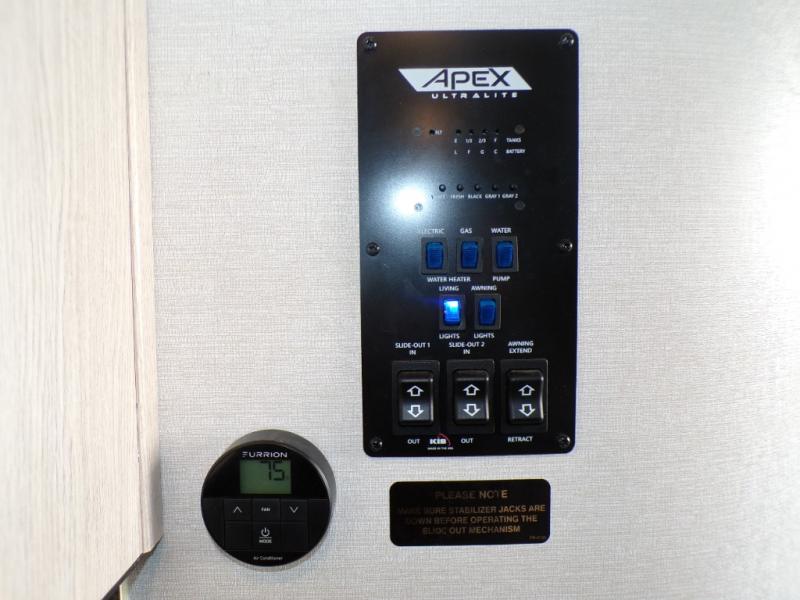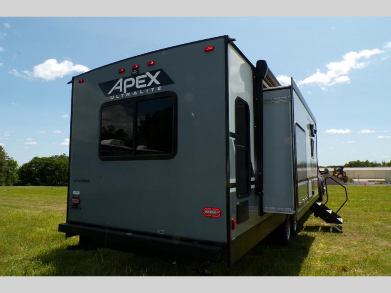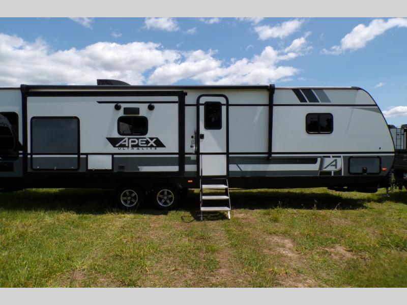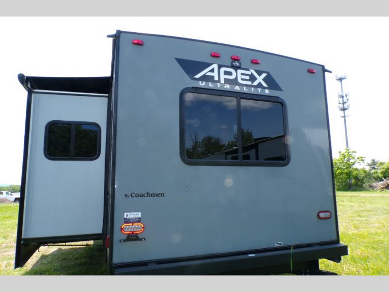 Lightweight living and camping is found with the Apex Ultra-Lite travel trailers by Coachmen. These eco-friendly units are made to last thanks to the Azdel composite sidewalls, the laminated aluminum floor, and the vacuum-bonded laminated crowned roof. Lippert axles and nitrogen filled radial tires make towing easier than ever, plus there is a friction hinge entrance door, a 100-watt solar panel with a 10 Amp control charger, and slam latch baggage door catches for easy unloading. Some of the interior comforts you'll fall in love with are the one-piece seamless edge countertops, the hard valances with night shades throughout, the matte black hardware, and the residential comforter. The Apex Ultra-Lite trailers also include USB ports, a digital TV antenna with cable hook-ups and Wi-Fi capability, and an AM/FM stereo with Bluetooth to ensure you'll never go bored on rainy camp days!