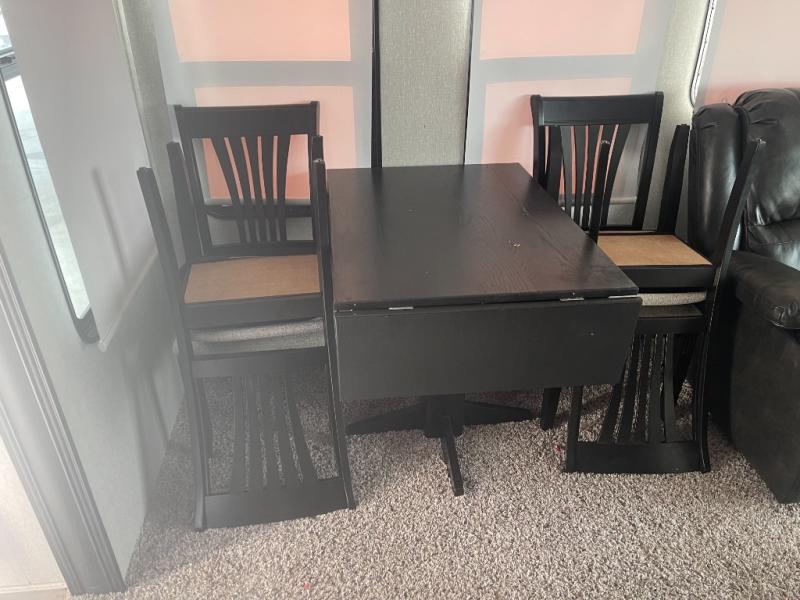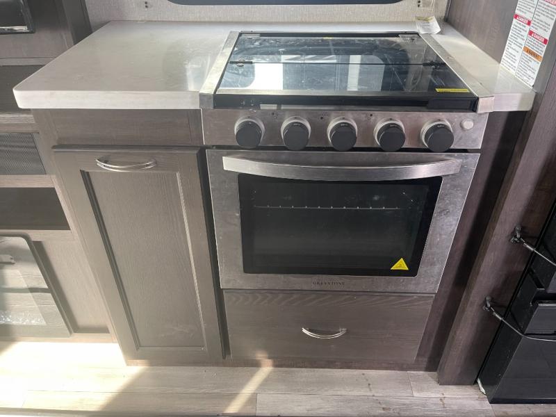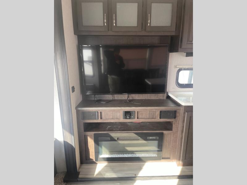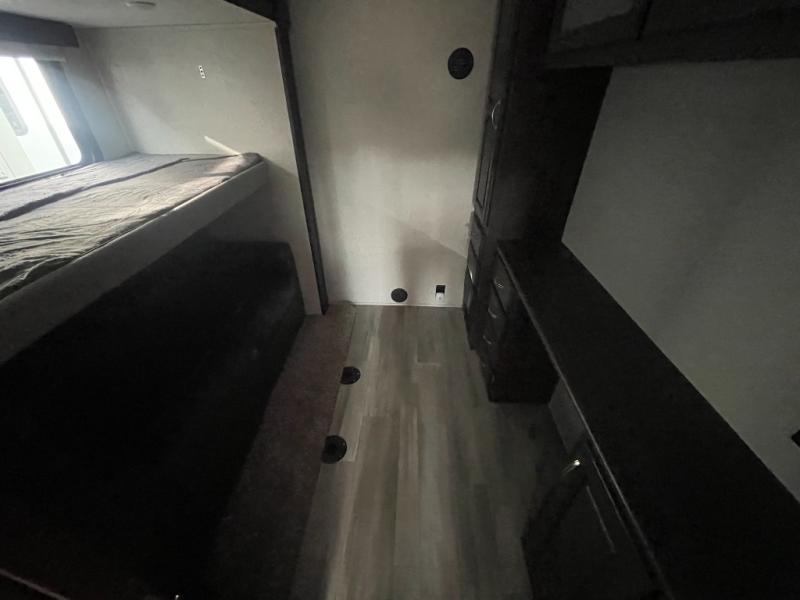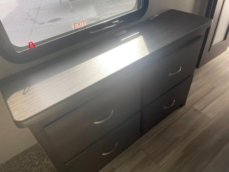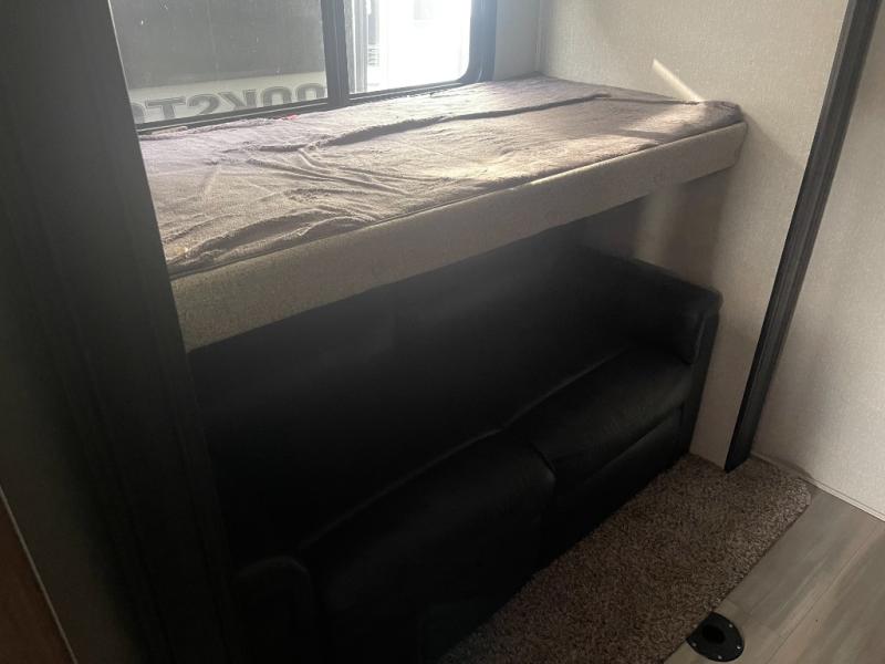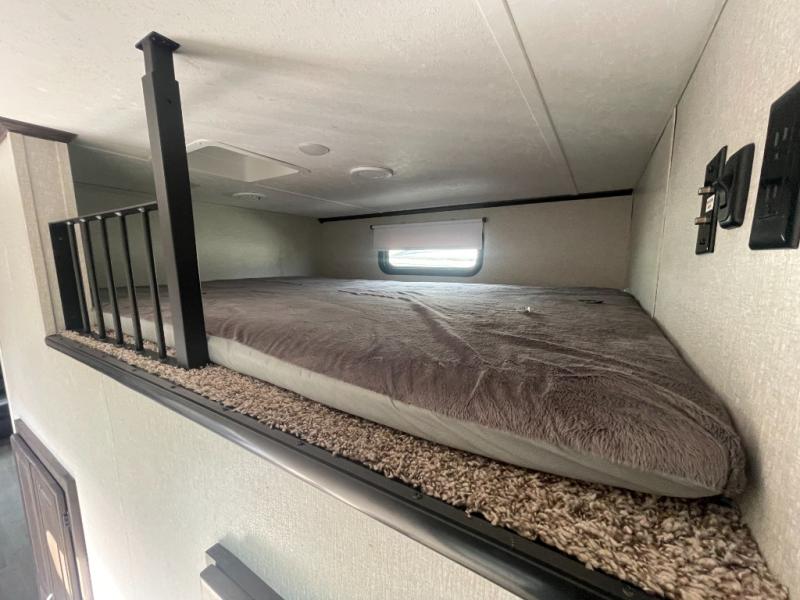 This family-friendly fifth wheel can sleep six comfortably between the queen bed, the tri-fold sofa, and the middle bunkhouse with a loft above! There is plenty of counter space in the bunkhouse, plus a sofa with a removable table and a wardrobe for clothes. The kitchen is any chef's dream with its residential cooktop, residential refrigerator, and kitchen island for more counter space. While dinner is being made, you can play a game of cards at the free-standing table, relax on the tri-fold sofa, or visit outdoors under the 20' power awning with LED lights. You won't be left wanting for storage space in this model thanks to the overhead cabinets, plus the bedroom dresser and large wardrobe. There is even a wardrobe with washer and dryer prep if you choose to go full-time!