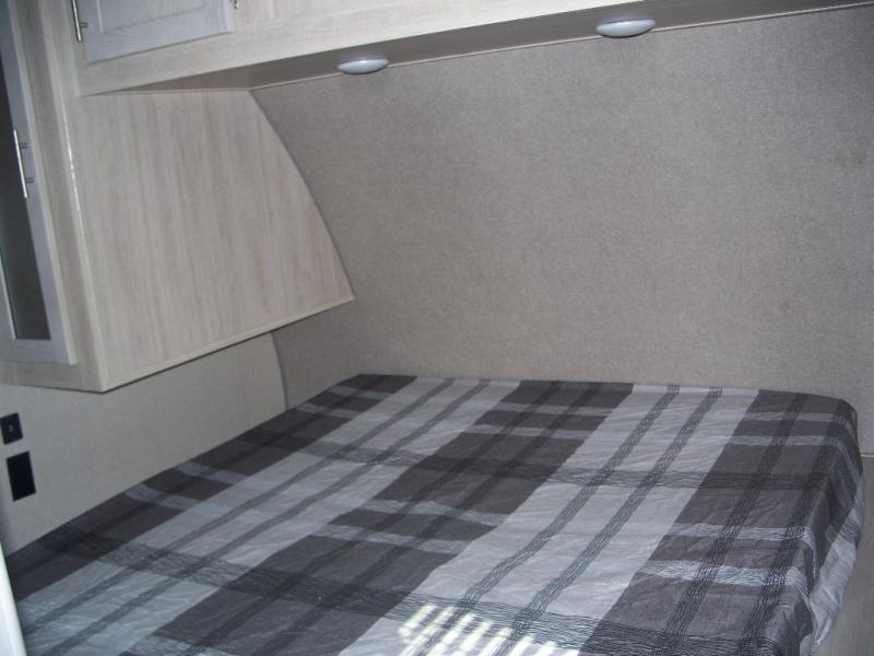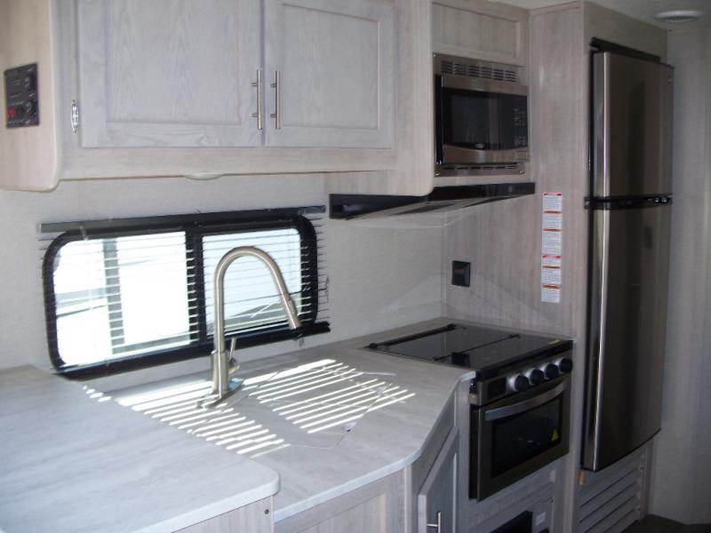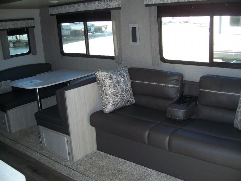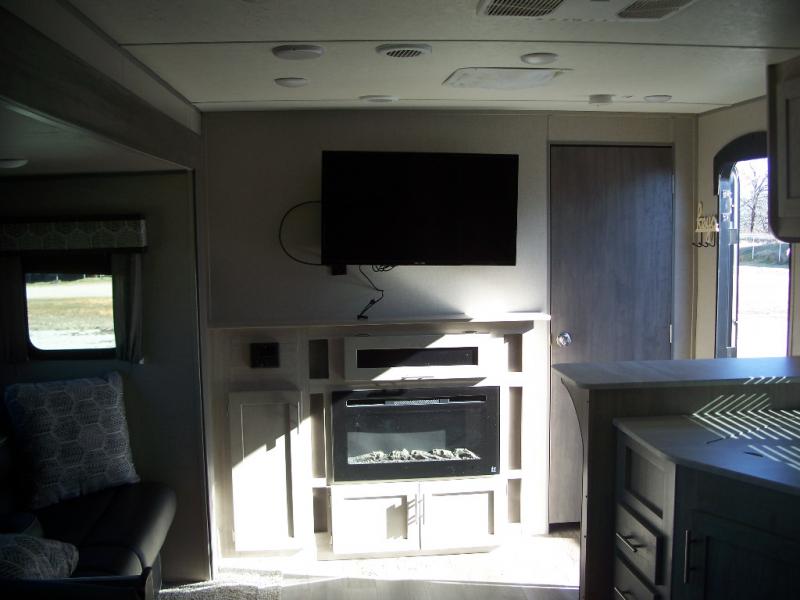 This half-ton friendly trailer is easy to pull and park, and is spacious thanks to the large slide out in the main living and kitchen area! You can dine at the booth dinette or choose the free standing dinette option, and the sofa offers drink holders for when you are relaxing and watching the entertainment center with optional fireplace below. The rear corner offers a full bathroom, and a large wardrobe/pantry for the storage you need. The galley kitchen offers full amenities plus a breakfast bar with optional stools. And the 15' awning provides protection from the elements plus has the choice of multiple LED colors with the use of the remote.