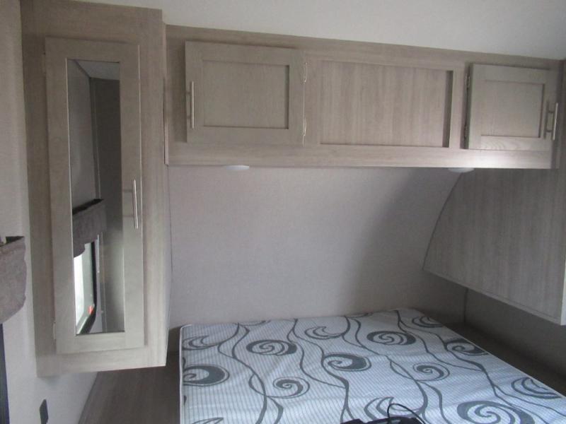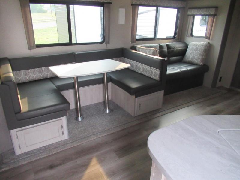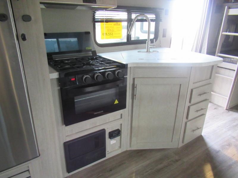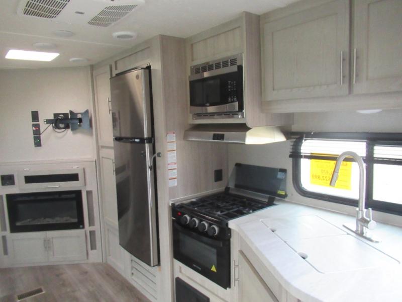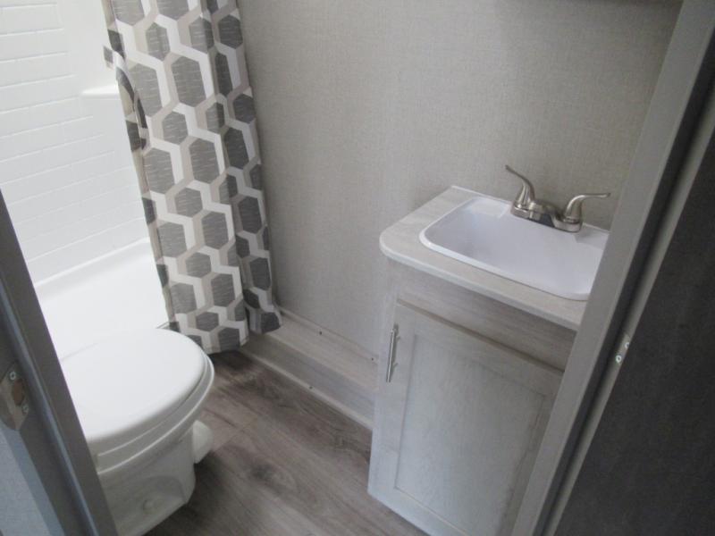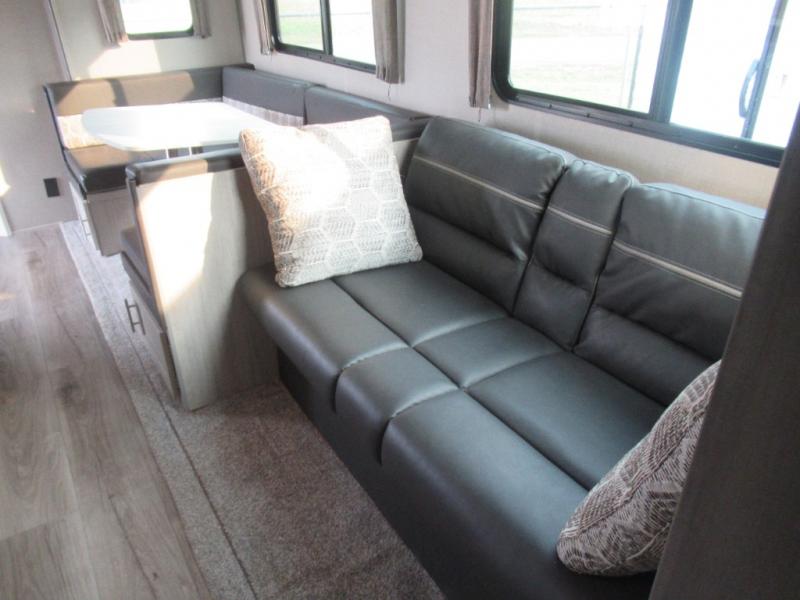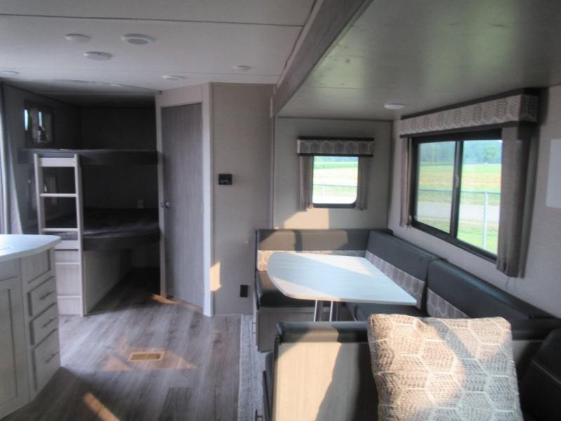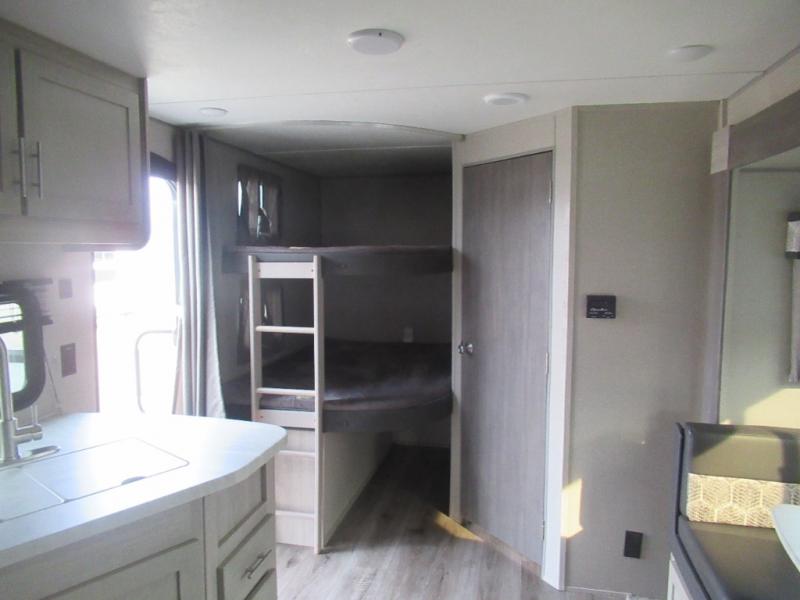 When you enjoy camping with your own accommodations and space for the whole crew, hitch this trailer up and head to the campgrounds! After loading everything easily thanks to the dual entry doors and all the interior and exterior storage, you will have no worries that you left anything behind. The electric awning is easy to setup like the large slide out, and the awning offers multicolor LED lights to choose from by using the remote. When you are outside the cook might like to make a meal using the outside camper kitchen. The interior kitchen offers full amenities including a pantry, and everyone can watch the 39" TV on the angled entertainment center. There are double-size bunks with a ladder for the kids and a walk-around queen for the owner to sleep on, as well as the furniture doubles as extra sleeping space.