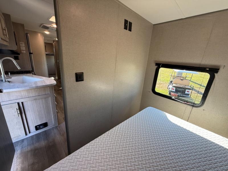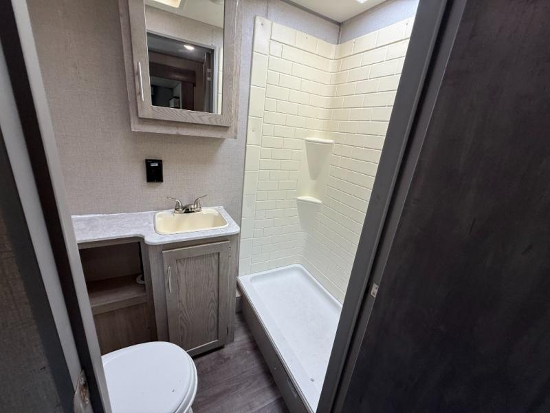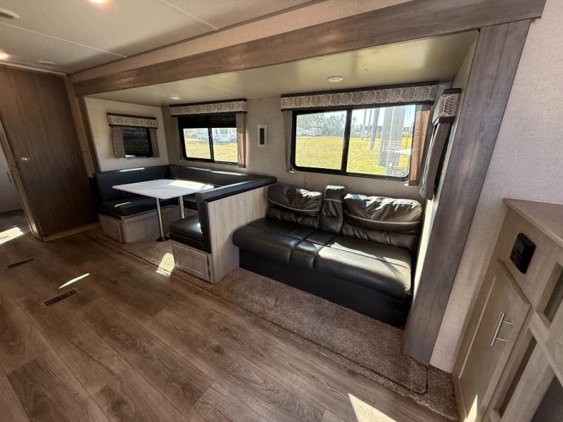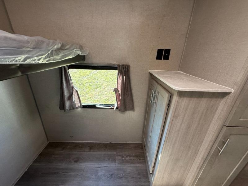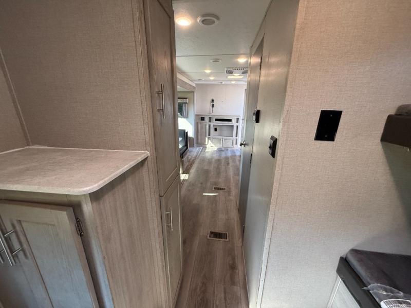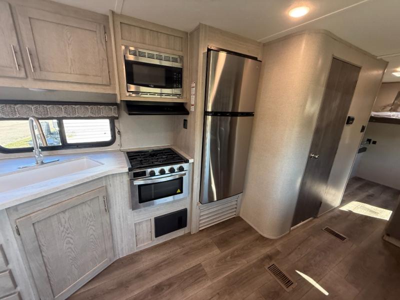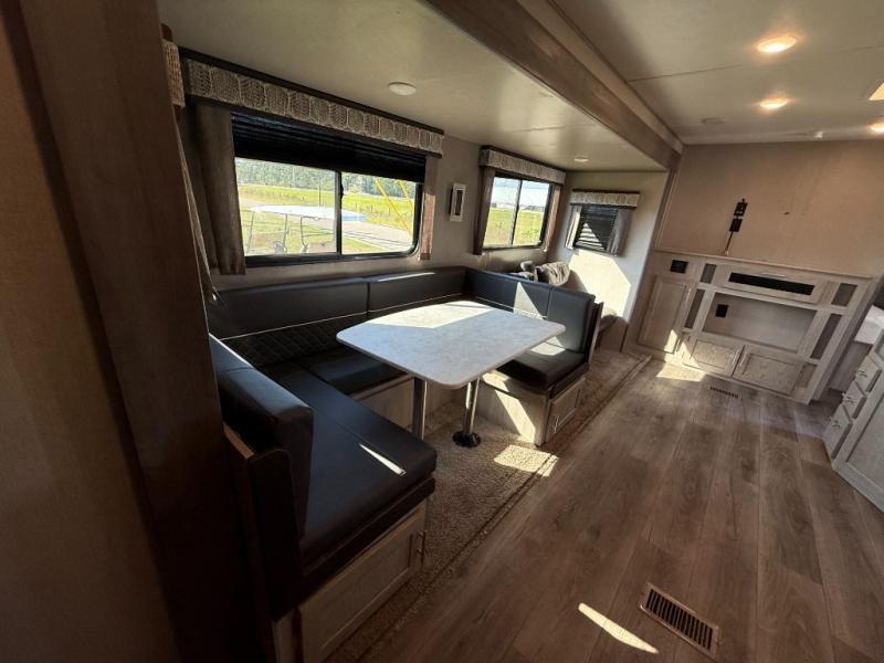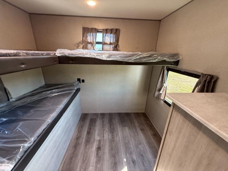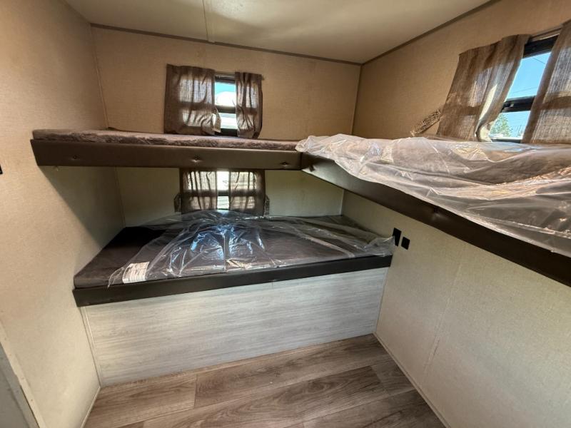 Not only will you be comfortable in this trailer, your friends will have comfort and privacy thanks to having their own bunkhouse on the opposite side of the trailer has the front bedroom where you can sleep like a queen! There are three bunk beds and two COA cube seats plus a location for a TV, a wardrobe, and windows for natural lighting. The combined living and kitchen is spacious thanks to the slide out U-shaped dinette and sofa with drink holders. And some might even decide to sleep on the furniture at night so they can watch the 39" TV. You can even add the fireplace option if you want that feature. The cook will have full amenities to whip up meals including overhead cabinets for dishes and snacks. And the exterior camper kitchen allows the cook to visit with everyone outside under the 18' electric awning that includes multicolor LED lights with a remote.