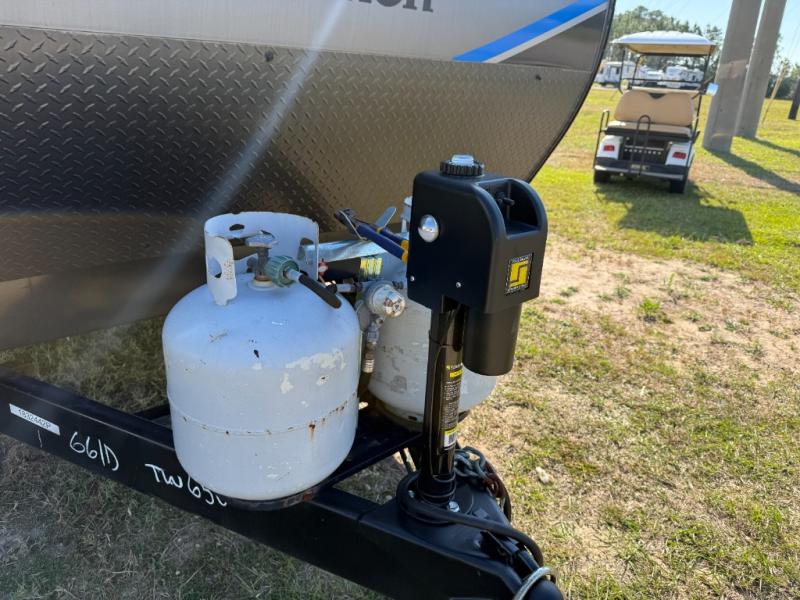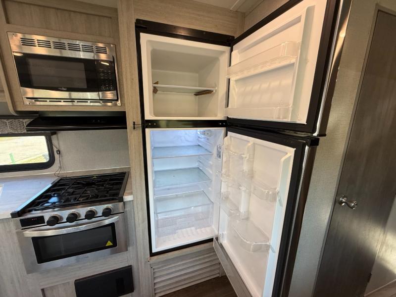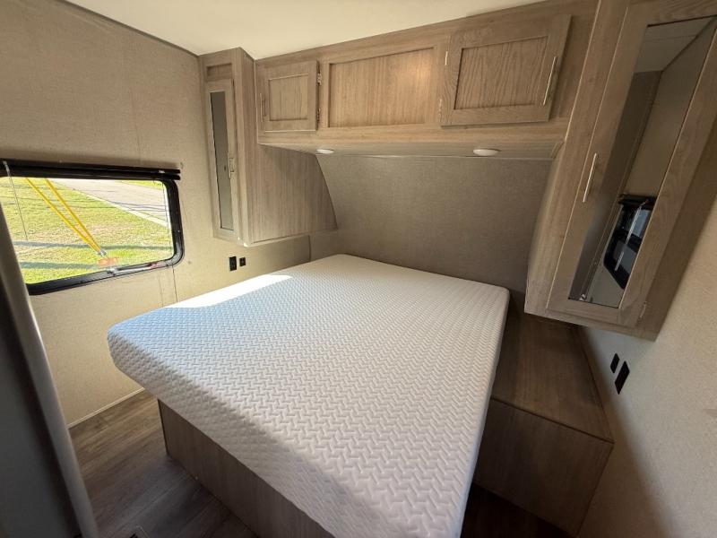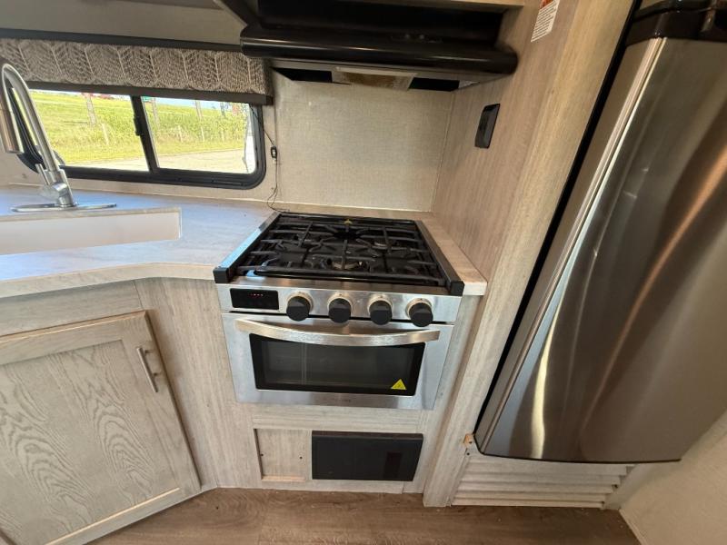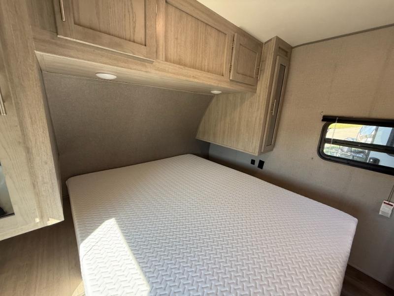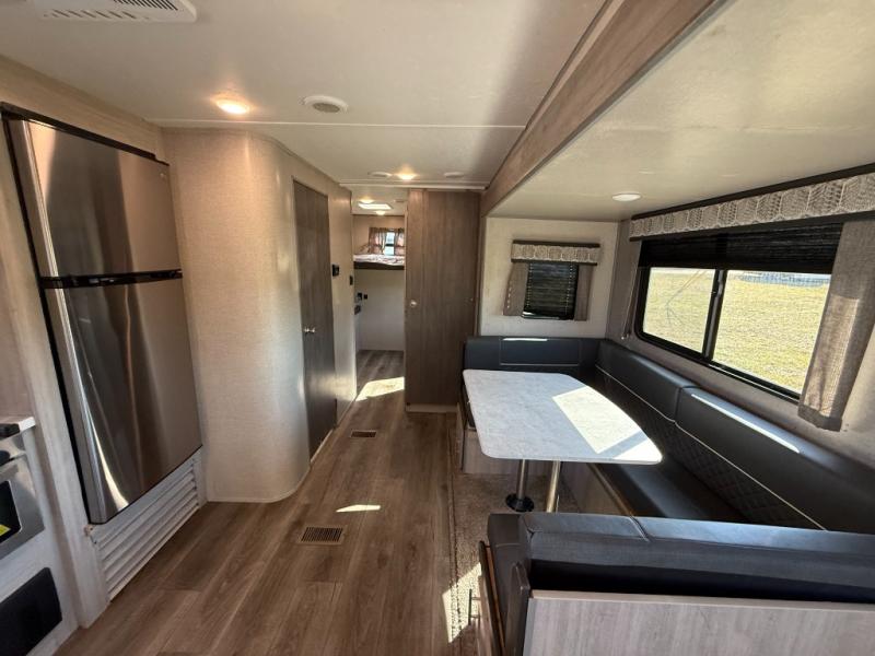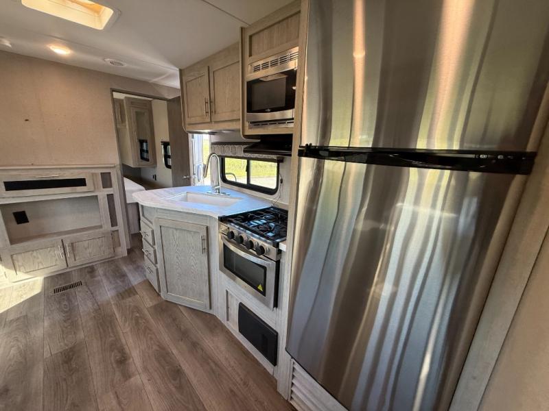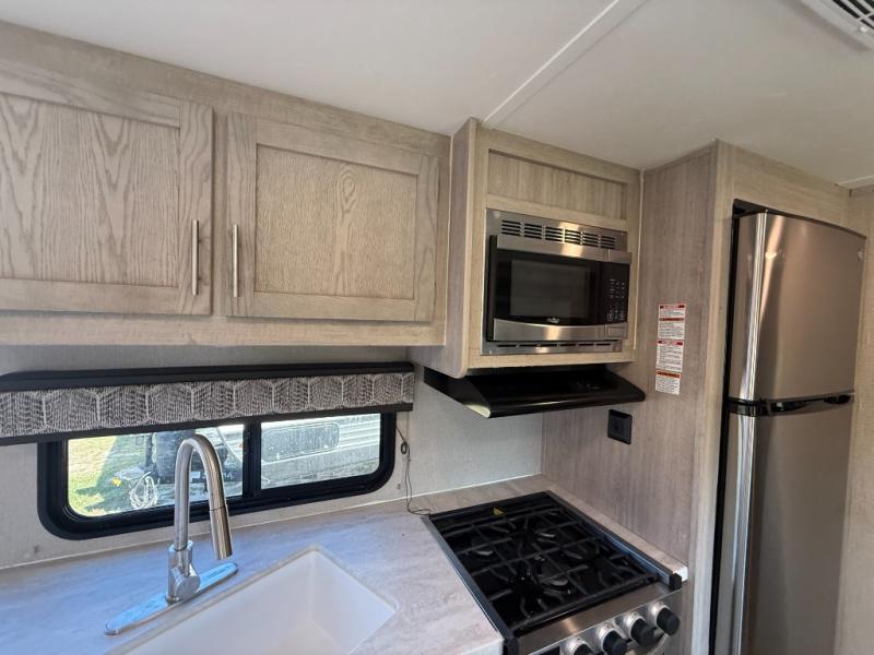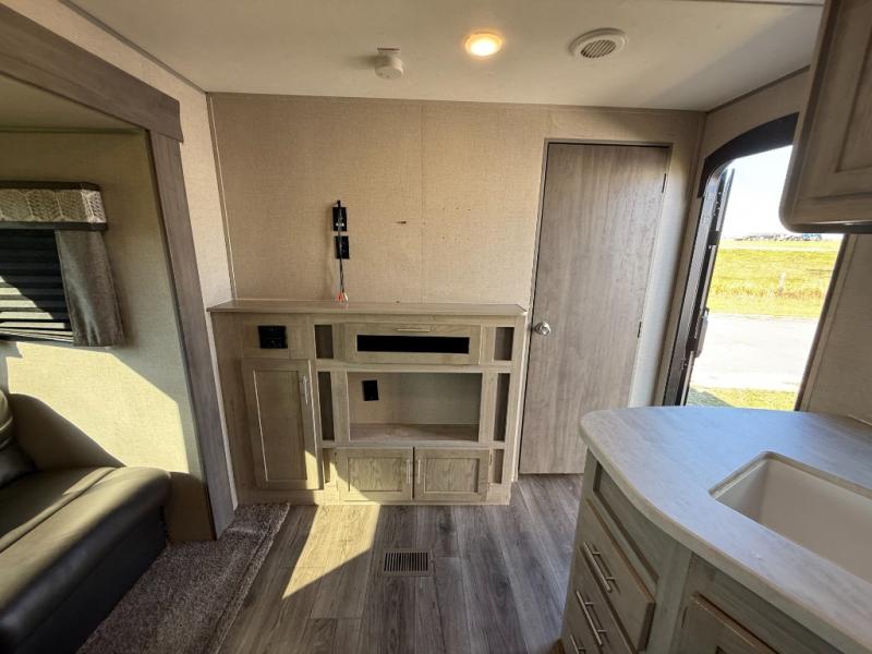 Not only will you be comfortable in this trailer, your friends will have comfort and privacy thanks to having their own bunkhouse on the opposite side of the trailer has the front bedroom where you can sleep like a queen! There are three bunk beds and two COA cube seats plus a location for a TV, a wardrobe, and windows for natural lighting. The combined living and kitchen is spacious thanks to the slide out U-shaped dinette and sofa with drink holders. And some might even decide to sleep on the furniture at night so they can watch the 39" TV. You can even add the fireplace option if you want that feature. The cook will have full amenities to whip up meals including overhead cabinets for dishes and snacks. And the exterior camper kitchen allows the cook to visit with everyone outside under the 18' electric awning that includes multicolor LED lights with a remote.