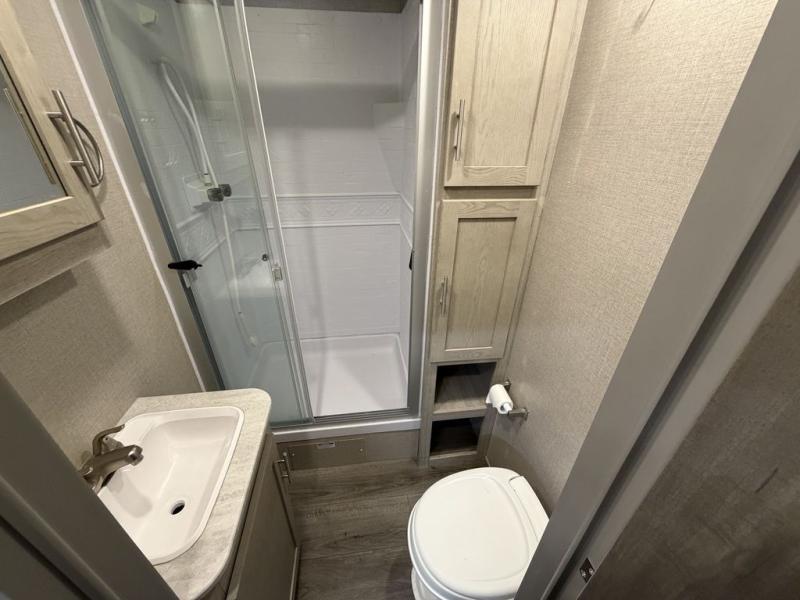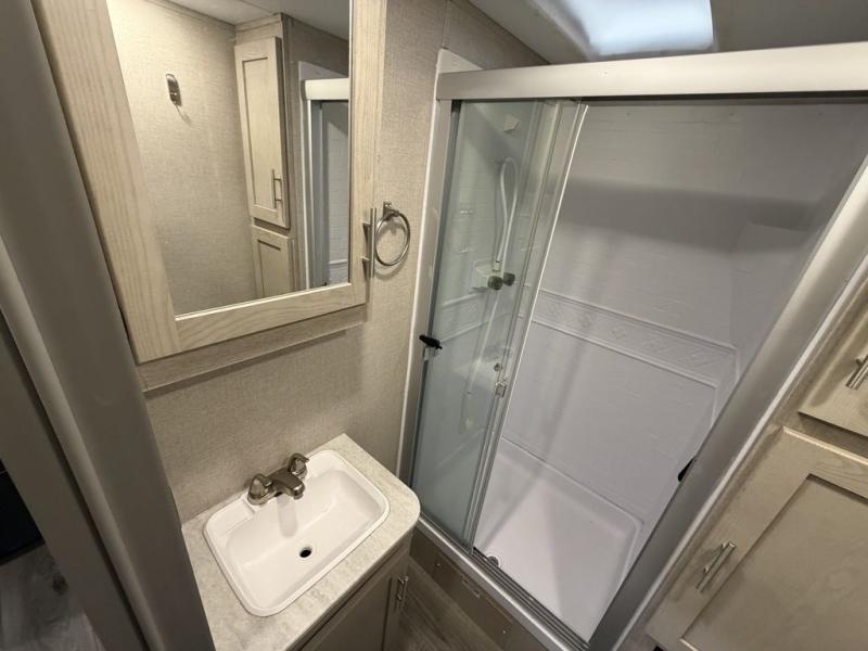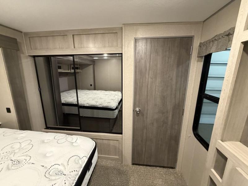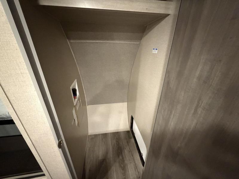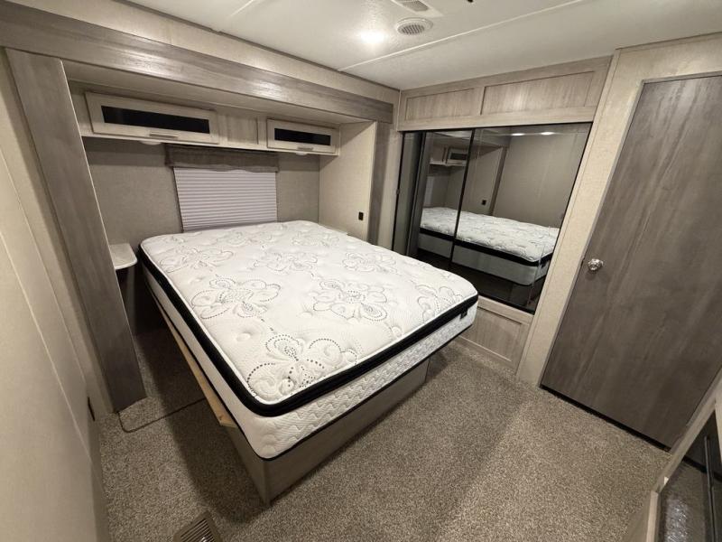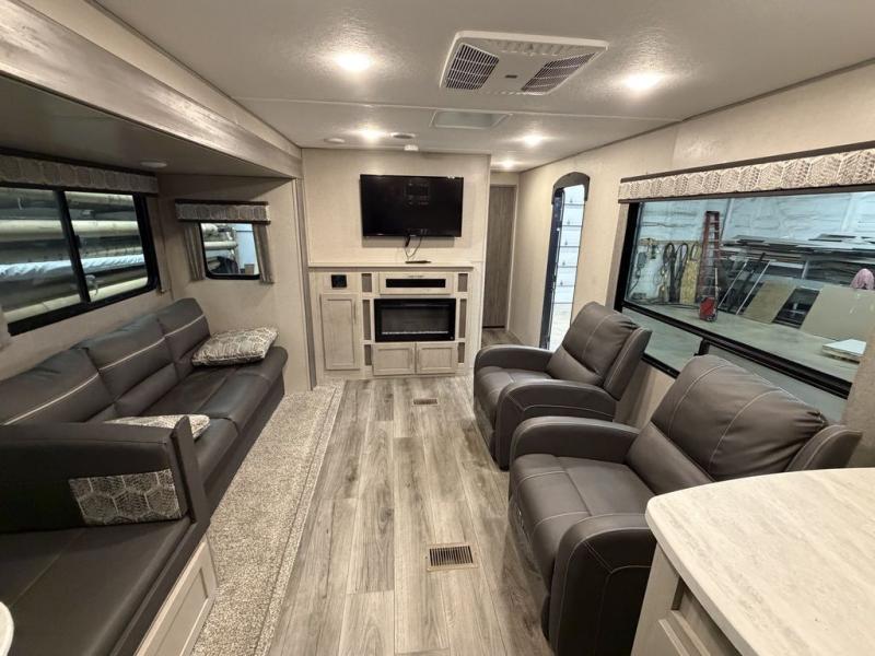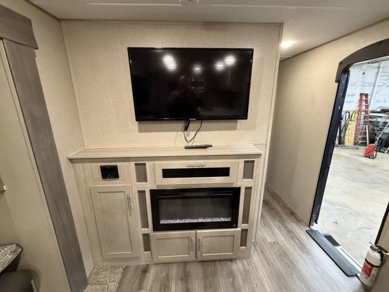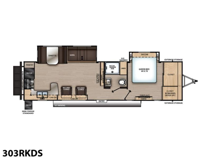 Enjoy relaxing under the 18' electric awning during the daytime for some protection from the sun, and at night with multicolor LED lights to set the mood for the evening. You can store beverages in the exterior mini fridge for convenience, and there is exterior storage for outdoor games and such. The interior is spacious with a large slide out booth dinette and sofa with drink holders, yet you might like to choose the free standing dinette option in place of the booth dinette. There is also a fireplace option under the 39" TV. The two recliner lounges are sure to be a favorite spot, and the cook will love the rear kitchen including the U-shaped counter when preparing meals and drying the dishes. Now the front bedroom is unique with a fireplace, entertainment center, slide out queen bed with nightstands and a large front closet plus a closet prepped for a washer/dryer option.