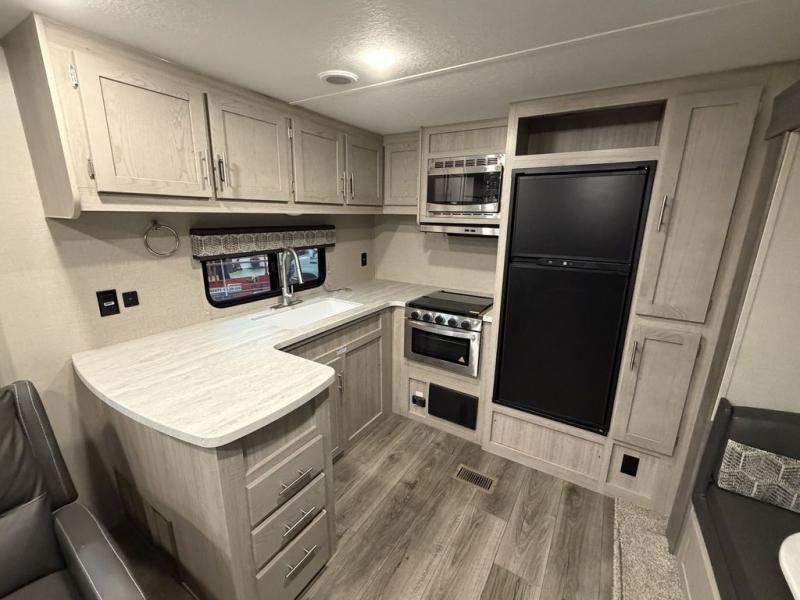 With any Catalina Legacy Edition travel trailer by Coachmen, there is an enclosed, fully sealed underbelly to protect against road debris and help control the interior climate, a seamless Alpha roof membrane, a platinum aluminum exterior, a smooth HD aluminum radius front, and polished HD aluminum fender skirts, plus upgraded aluminum wheels. The interior includes seamless Thermofoil countertops throughout, an under-mount farm style sink with residential kitchen faucet with pull down sprayer to easily clean the fruits and veggies as well as the dishes, full length kitchen drawer guides, and an All-In-One monitor panel system.