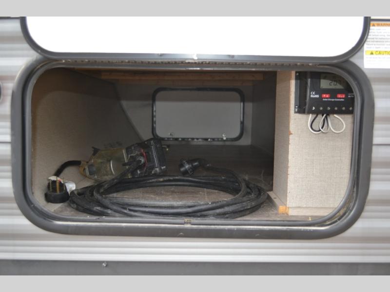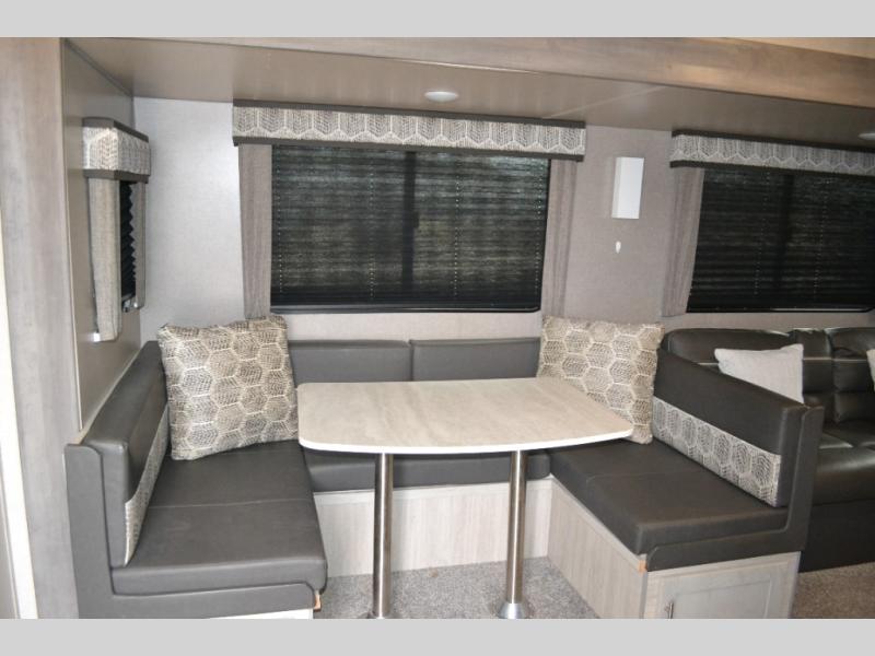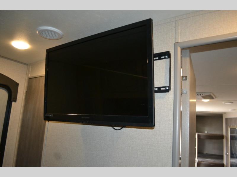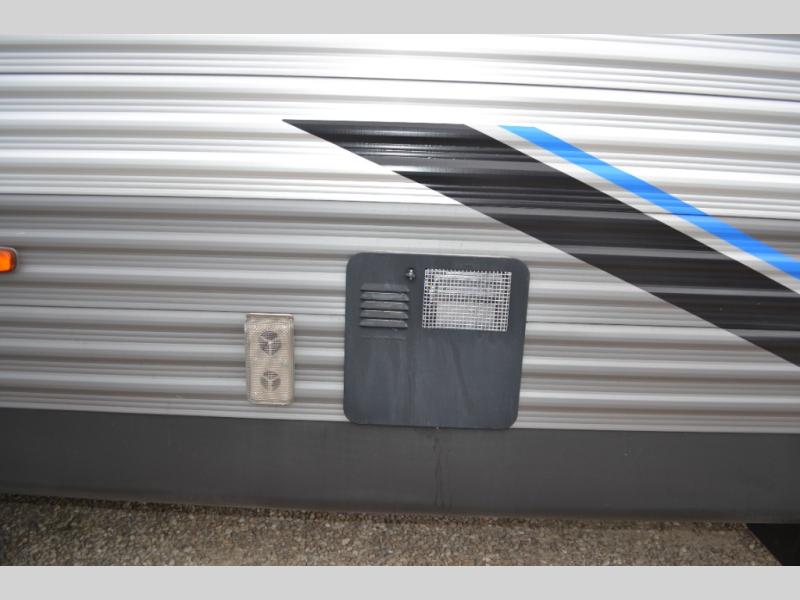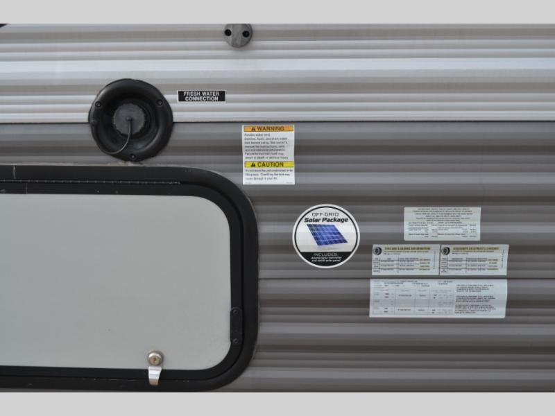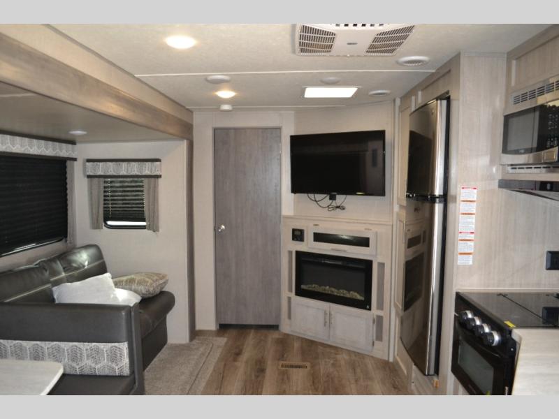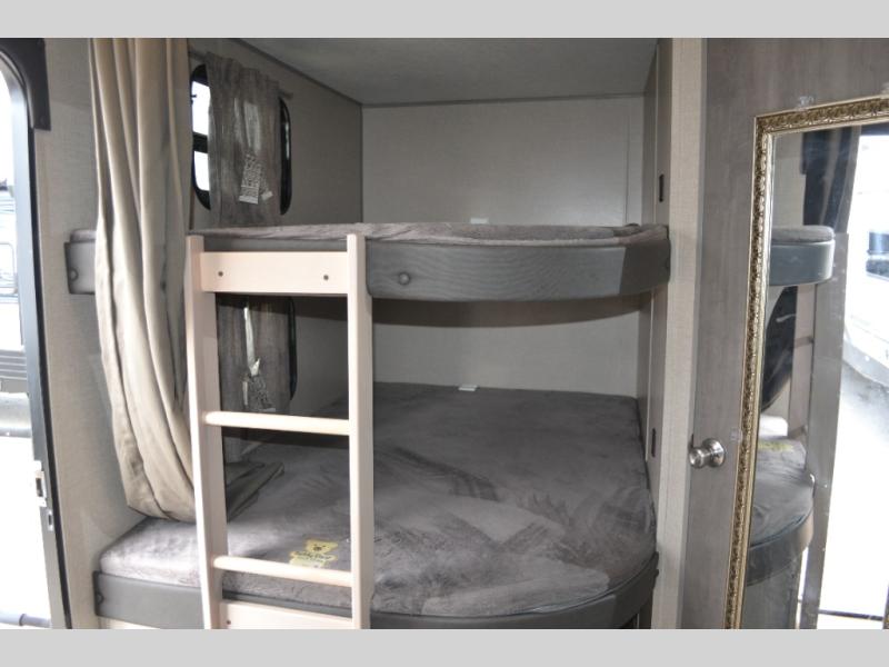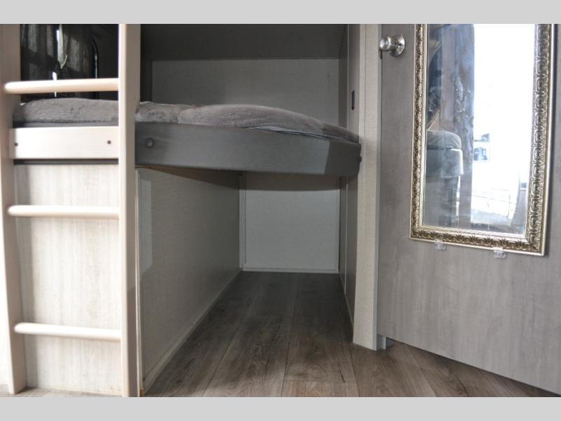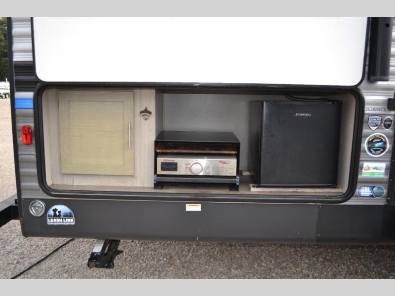When you enjoy camping with your own accommodations and space for the whole crew, hitch this trailer up and head to the campgrounds! After loading everything easily thanks to the dual entry doors and all the interior and exterior storage, you will have no worries that you left anything behind. The electric awning is easy to setup like the large slide out, and the awning offers multicolor LED lights to choose from by using the remote. When you are outside the cook might like to make a meal using the outside camper kitchen. The interior kitchen offers full amenities including a pantry, and everyone can watch the 39" TV on the angled entertainment center. There are double-size bunks with a ladder for the kids and a walk-around queen for the owner to sleep on, as well as the furniture doubles as extra sleeping space.