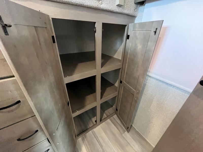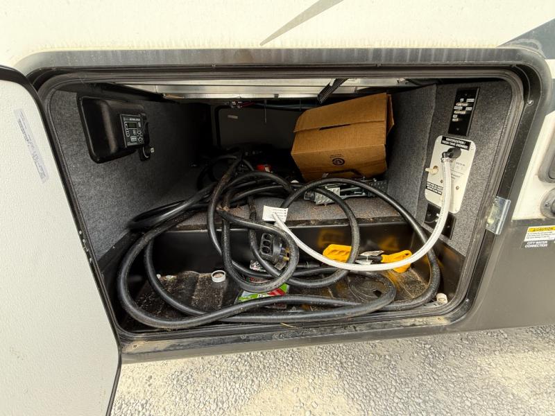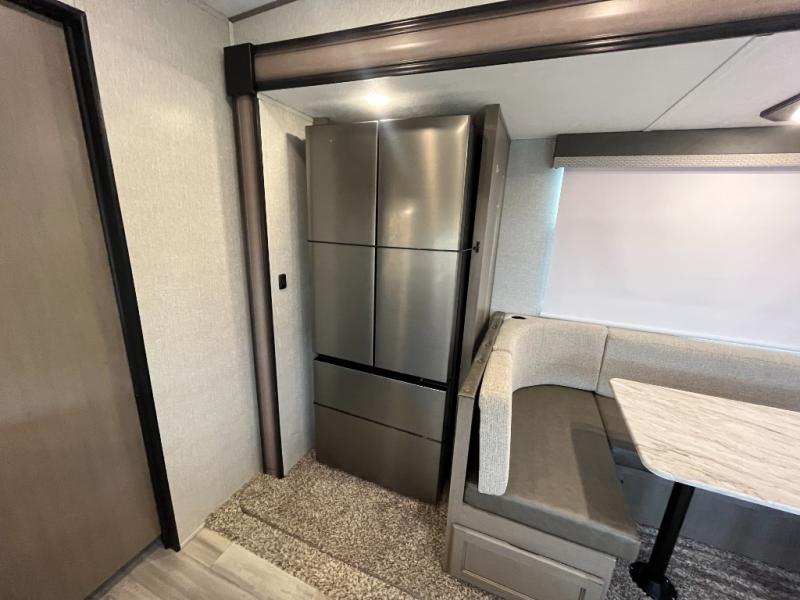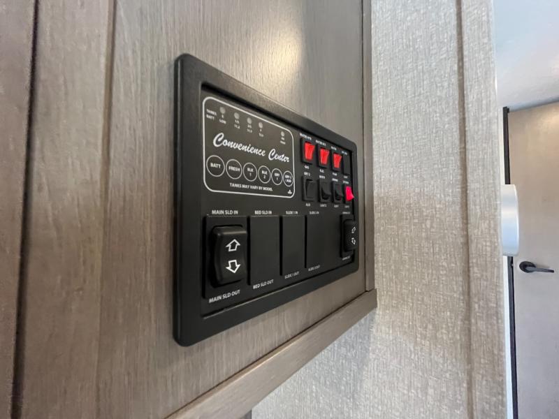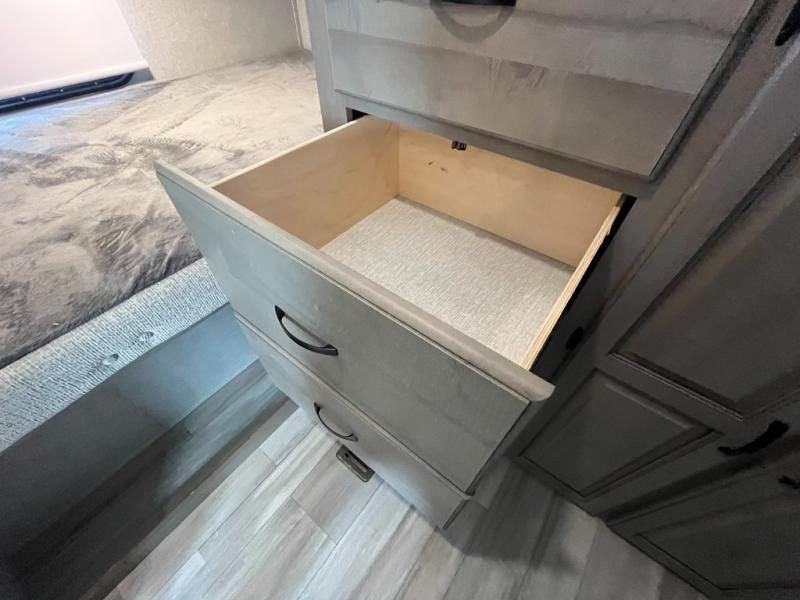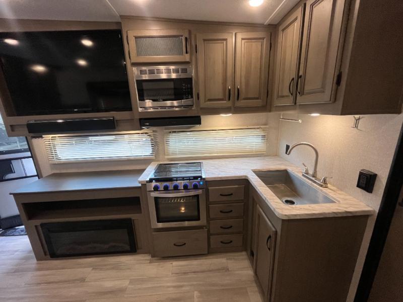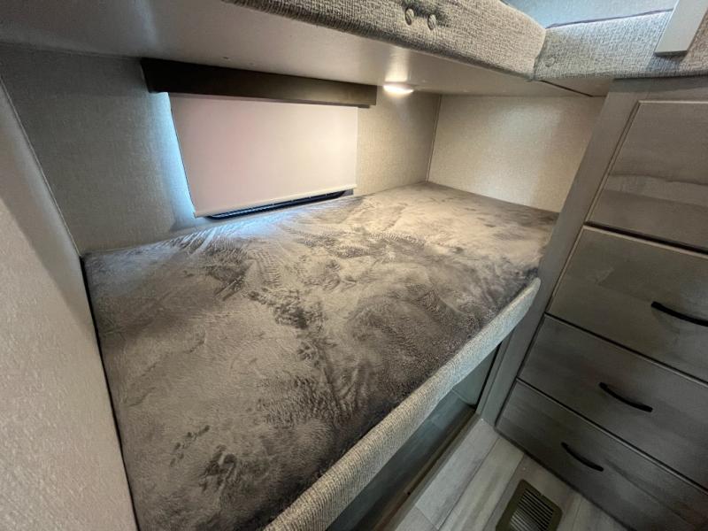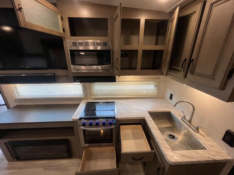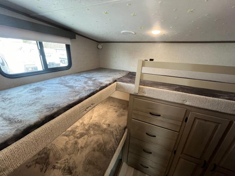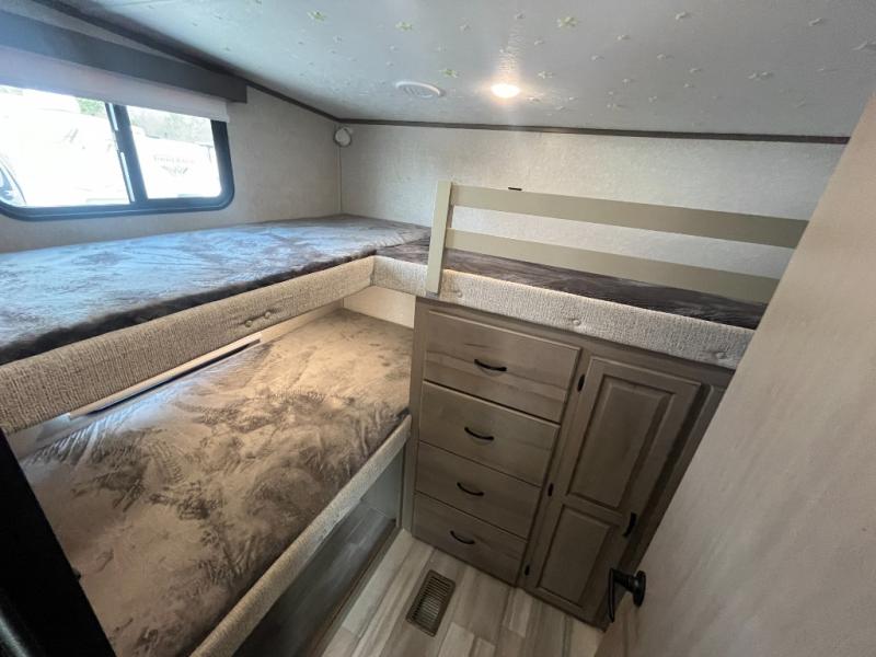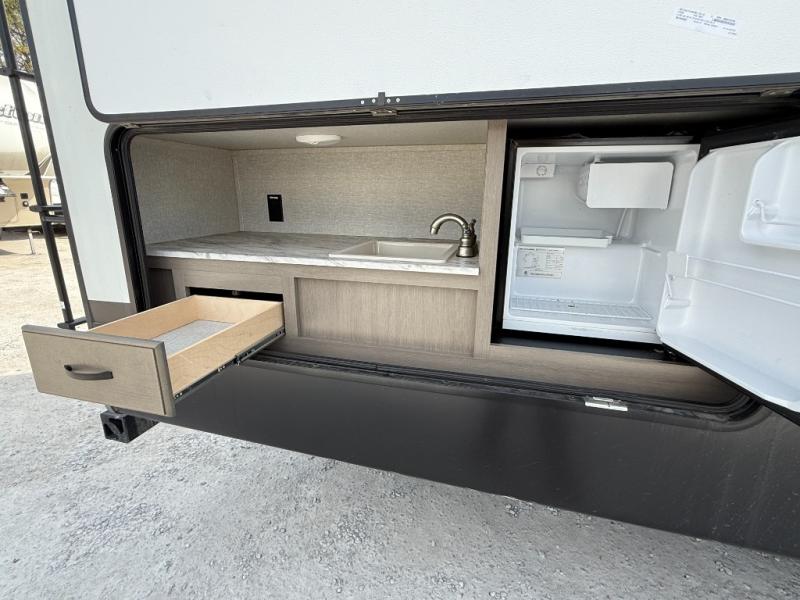 The whole family will have a fun time camping in this fifth wheel! The kiddos will love having their own rear private bunkhouse which has a 30" x 62" bunk bed and a 30" x 74" bunk bed above a 38" x 74" bottom bunk. Enjoy your own privacy with the front private bedroom with a residential queen bed that has hidden compartmentalized storage/drawers underneath it and a large wardrobe with hanging storage for your clothes. You can even transform the tri-fold hide-a-bed sofa and U-shaped dinette into extra sleeping spaces for more guests to join in on the fun. The chef can either prepare their delicious meals indoors with the XL stainless steel oven and residential cooktop or breathe in some fresh air while cooking at the outside kitchen while staying protected by the 16' electric awning!