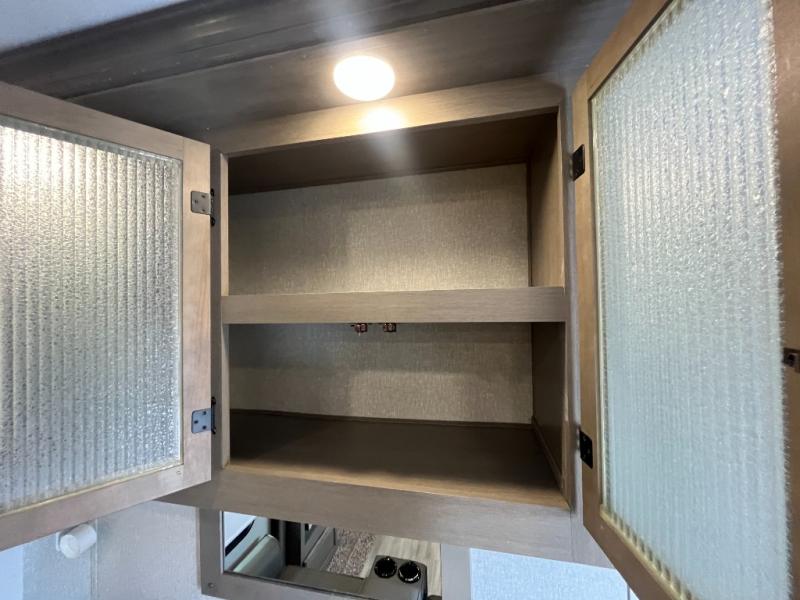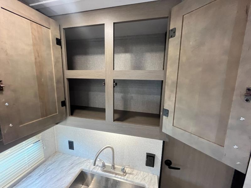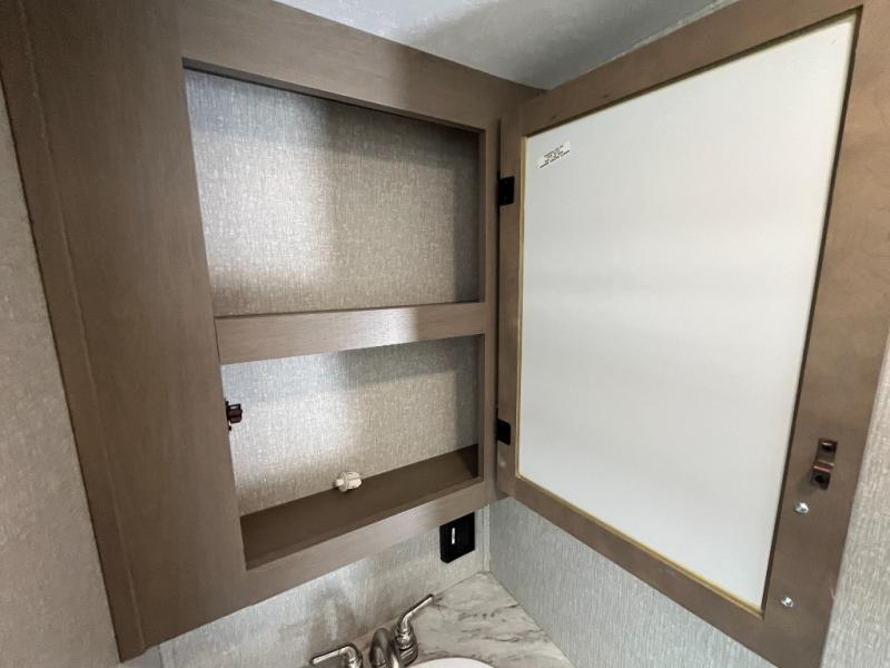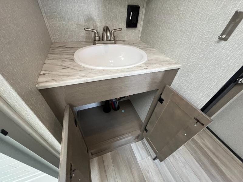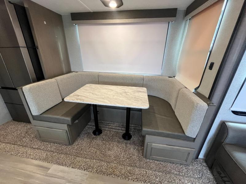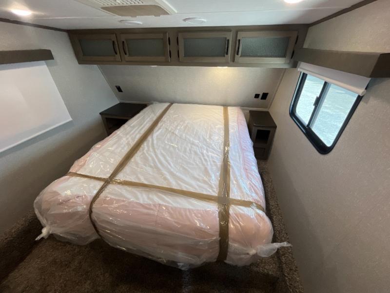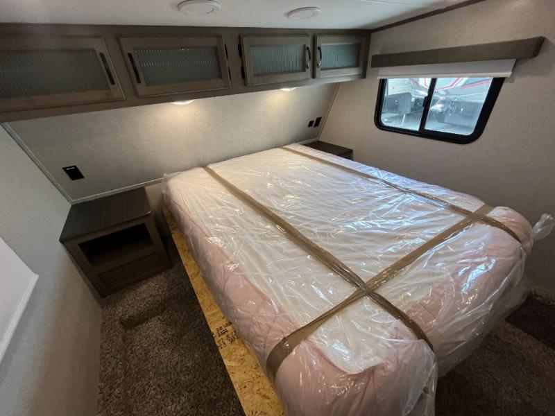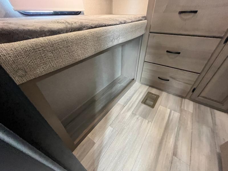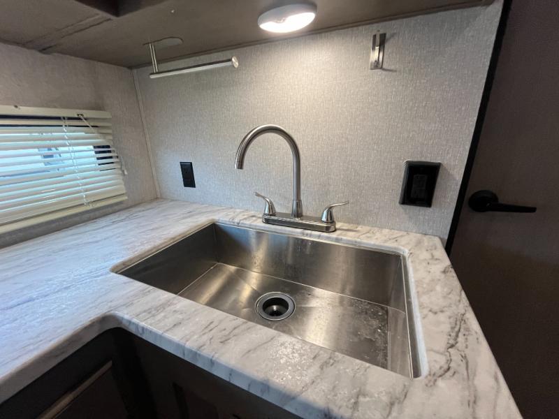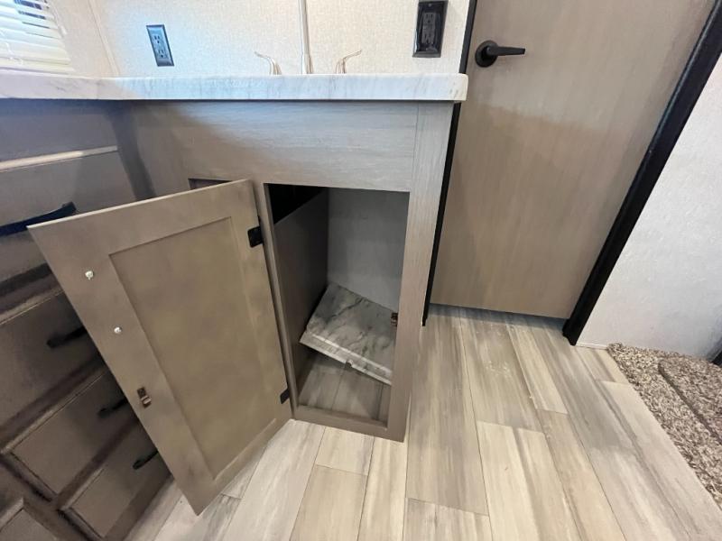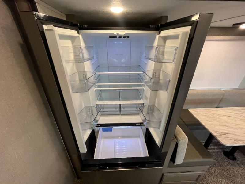 The whole family will have a fun time camping in this fifth wheel! The kiddos will love having their own rear private bunkhouse which has a 30" x 62" bunk bed and a 30" x 74" bunk bed above a 38" x 74" bottom bunk. Enjoy your own privacy with the front private bedroom with a residential queen bed that has hidden compartmentalized storage/drawers underneath it and a large wardrobe with hanging storage for your clothes. You can even transform the tri-fold hide-a-bed sofa and U-shaped dinette into extra sleeping spaces for more guests to join in on the fun. The chef can either prepare their delicious meals indoors with the XL stainless steel oven and residential cooktop or breathe in some fresh air while cooking at the outside kitchen while staying protected by the 16' electric awning!