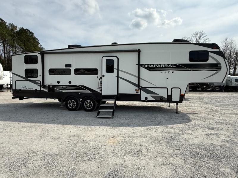 Comfort, convenience, and an easy haul is what you will find with each one of these Coachmen RV Chaparral Lite fifth wheels! Their aluminum framed sidewalls with rot proof Azdel composite and Turn Tec engineering make them easy to tow with just a half-ton pickup truck. The durable, textured silver metal radius skirting and the UV-resistant, white gel-coat exterior sidewalls panels will protect your unit for years to come. The Road Armor suspension by Trail Air comes with heavy duty shackles and wet bolts so you can be sure it will hold up through every adventure. You will feel right at home inside with the Congoleum carefree resilient sheet flooring, the USB charging charging ports, and the bath suites. Plus, there is an outside shower with hot and cold water to keep the dirt outdoors where it belongs. Come find your favorite model today!