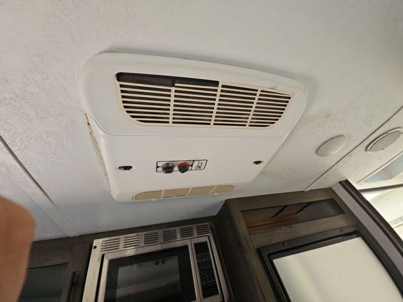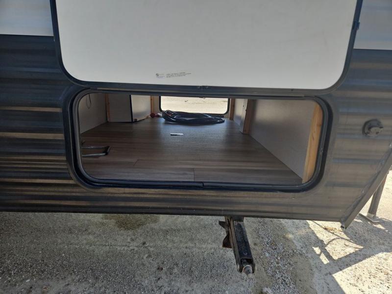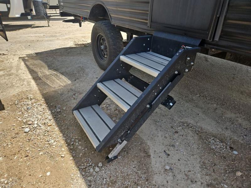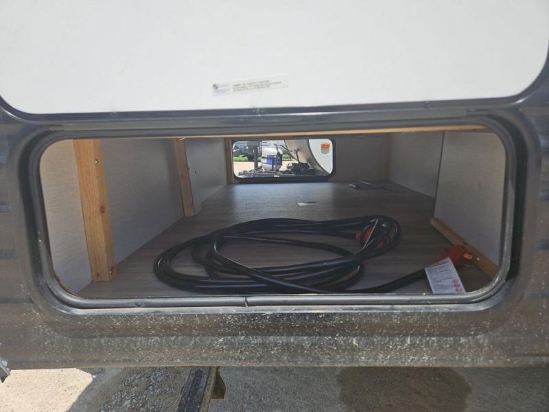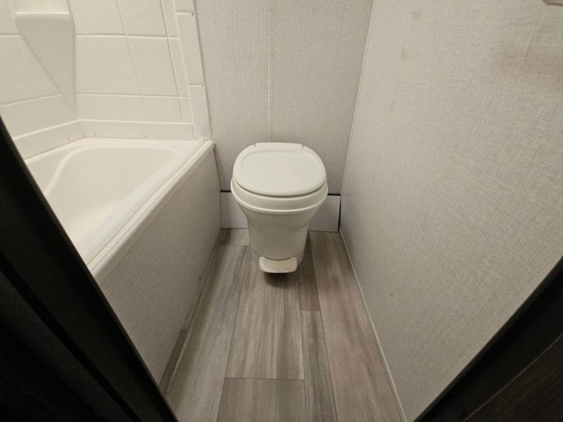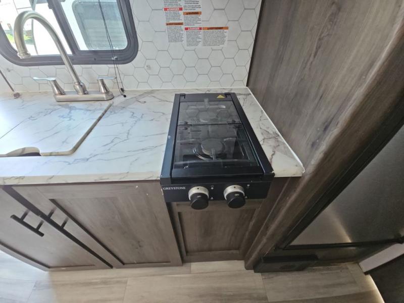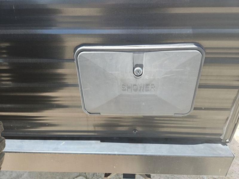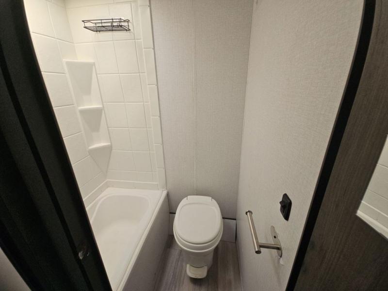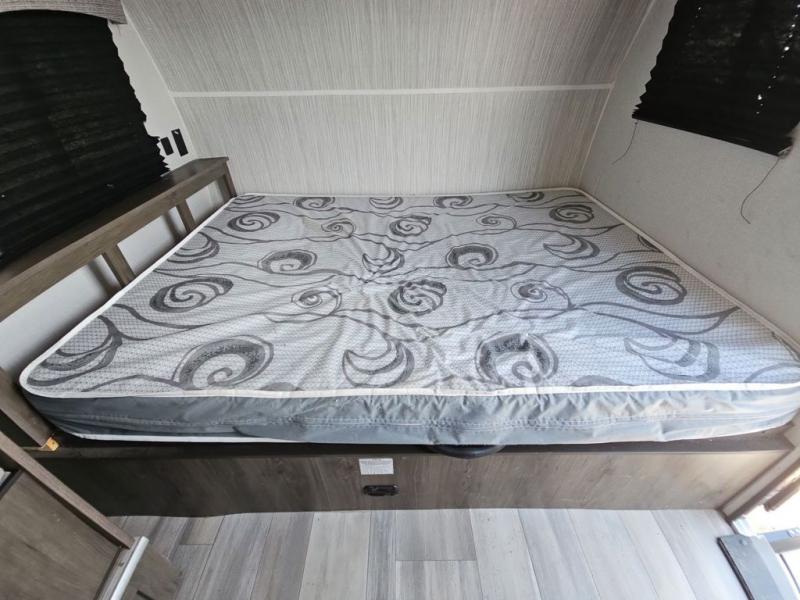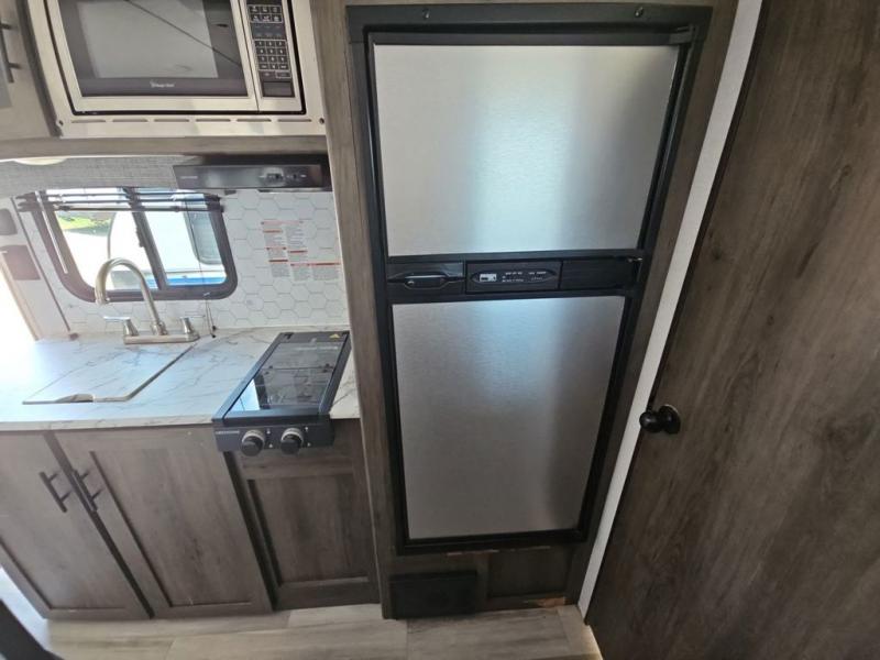 A fun time will be had with the whole family in this travel trailer! The kiddos can sleep on the set of 28" x 68" bunk beds and you can sleep on the front 54" x 74" bed with overhead cabinets and a storage space. Keep everyone's bellies full with the two burner cooktop, the 7 cu. ft. gas/electric refrigerator, and kitchen pantry. Enjoy your meals and play games together at the booth dinette slide which opens up the living area for more walking around space. Everyone will stay squeaky clean between the rear corner bathroom with the 36" ABS tub surround shower and the outside shower with hot and cold water!