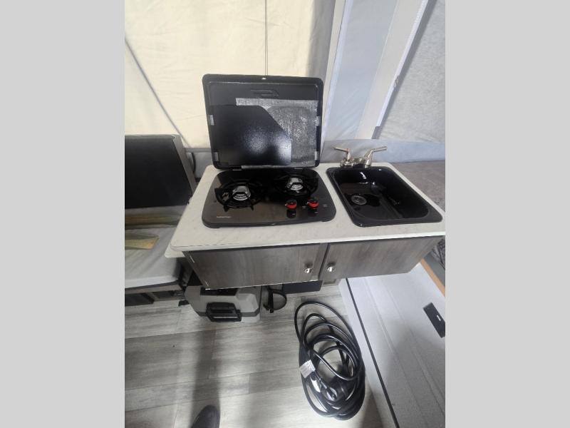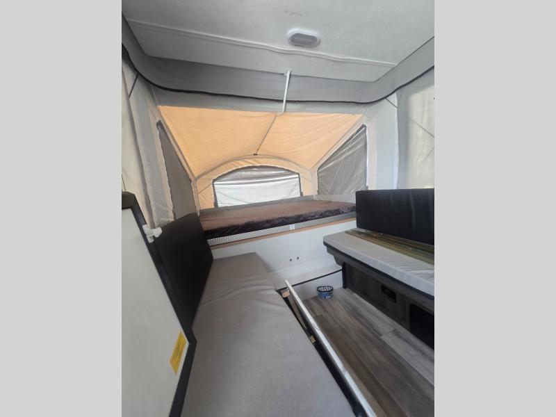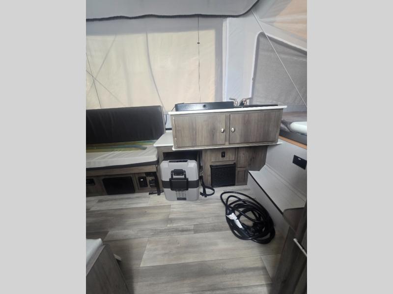 Get away to the great outdoors with your family of four to six with this folding pop-up! Whether you dream about roasting marshmallows at the campfire or walking for miles on the trails, you will have an inside space to relax, unwind and sleep at night above ground. There are two tent end beds, as well as two 60" gauchos to sleep on, plus a two burner range and a deep bowl acrylic sink to make warm meals and keep the dishes clean. And the residential grade linoleum and residential laminated countertops will be easy to clean. You might even like to choose a few options to customize your Clipper such as the Flex Rod Tech Add-A-Room upgrade, a three-way 1.9 cu. ft. refrigerator, a 13,500 BTU air conditioner, a solar panel, and more, take a look!