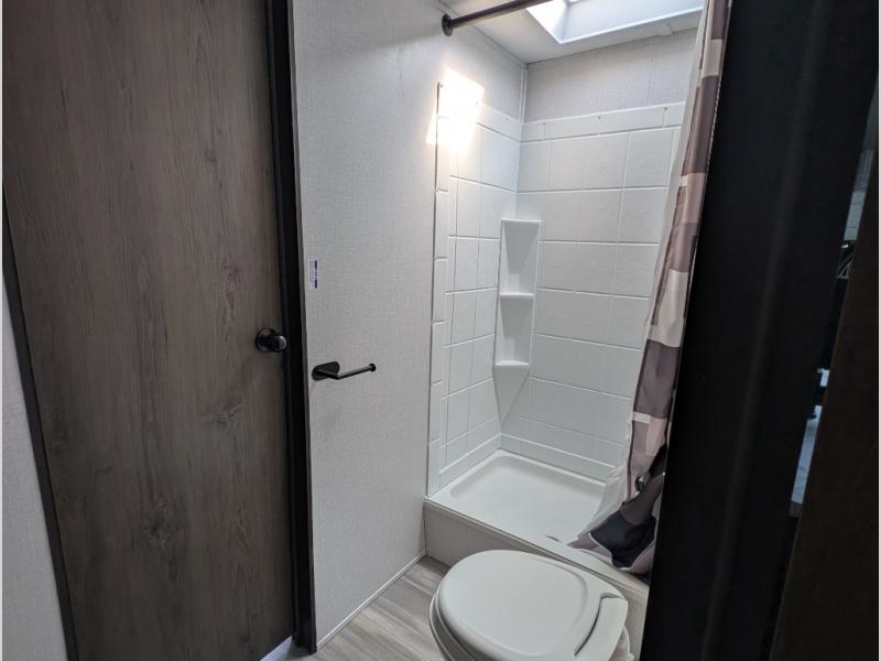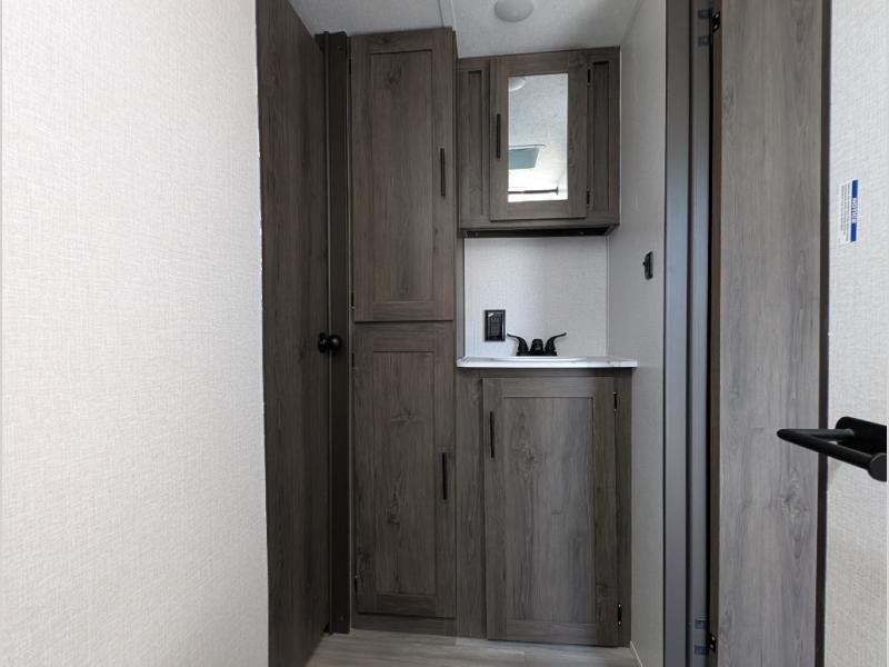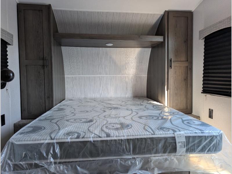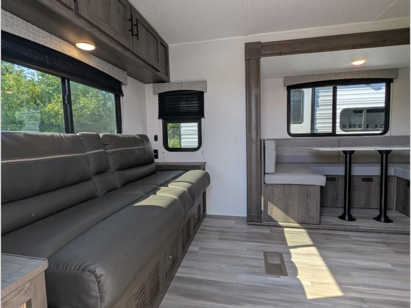 Camp in true luxury with this travel trailer! With dual entry doors, you will have a smooth flow of traffic in and out of the unit. One of the entrances even leads directly into the front private bedroom which has a 60" x 74" queen bed with wardrobes on either side, another wardrobe, an entertainment center, and an entrance into the walk-through bathroom. Prepare your best home cooked meals either with the indoor three burner cooktop or head to the outside camp kitchen and breathe in some fresh air while grilling up some juicy burgers. Eat your meals and play card games at the U-shaped dinette then relax on the rear 72" sofa while watching a movie with the entertainment center!